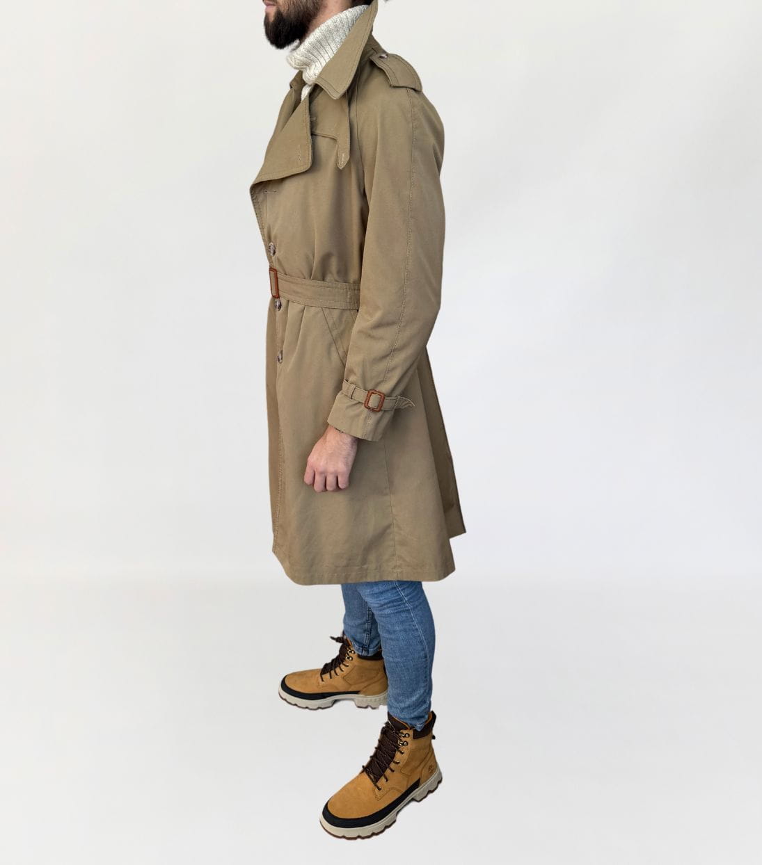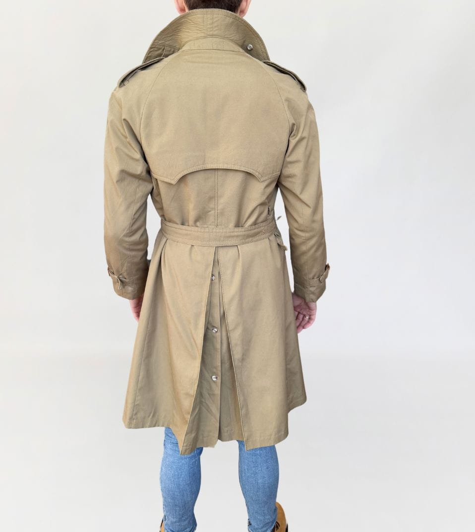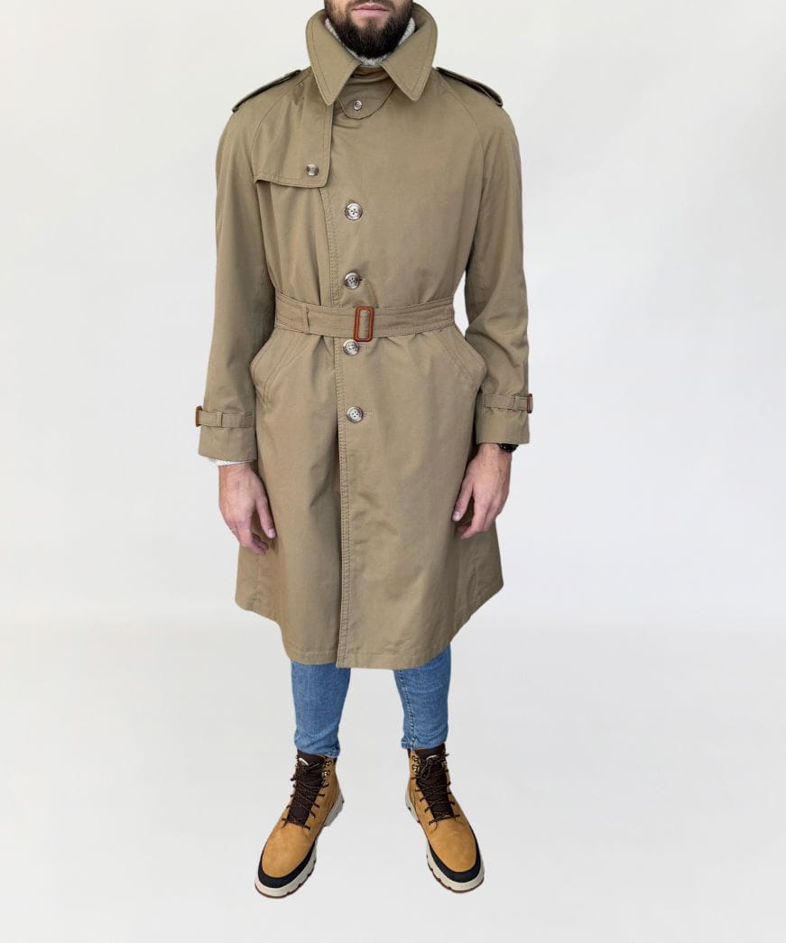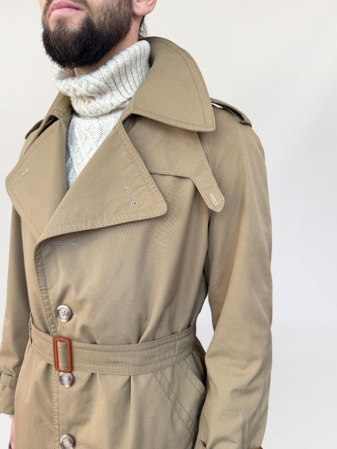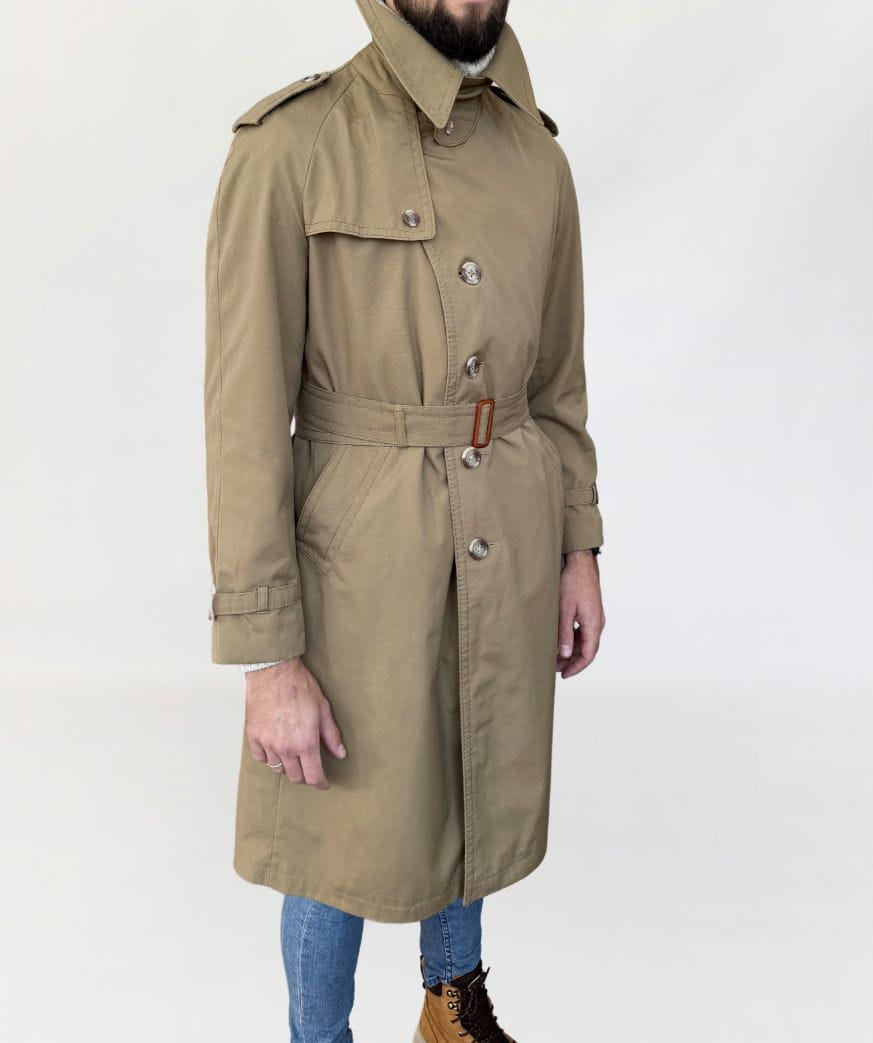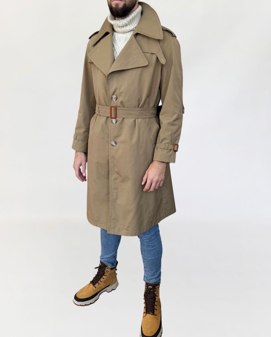 Płaszcz - trencz vintage renomowanej marki Oleg Cassini. Wykonany z jakościowej bawełnianej tkaniny. Jednorzędowy model przepinany regulowanym paskiem. Z tyłu rozporek na guziki. Całość na kraciastej podszewce. Model męski, ale polecamy jako unisex.