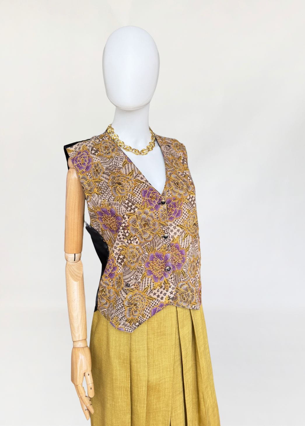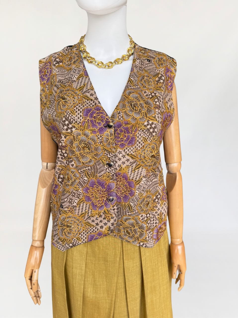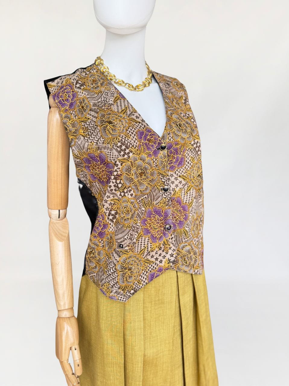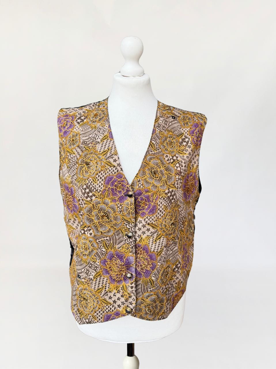 Kamizelka vintage w orientalnym stylu, wykonana z tkaniny o gęstym, wielobarwnym wzorze w odcieniach beżu, brązu i fioletu. Front wzbogacony subtelnym, biżuteryjnym zdobieniem o delikatnym połysku. Model zapinany na drobne dekoracyjne guziki. Tył wykonany z czarnego atłasu o gładkiej fakturze.