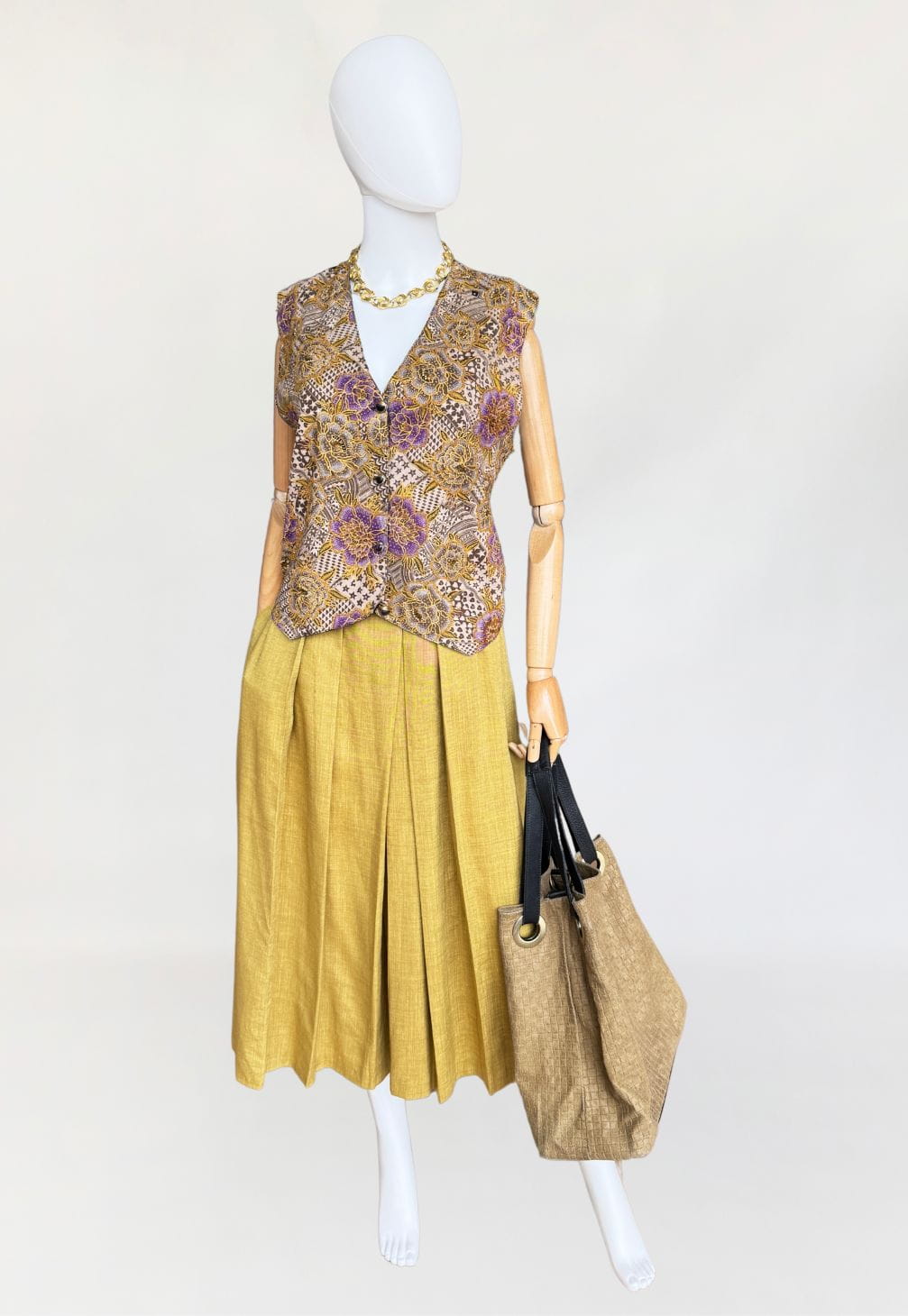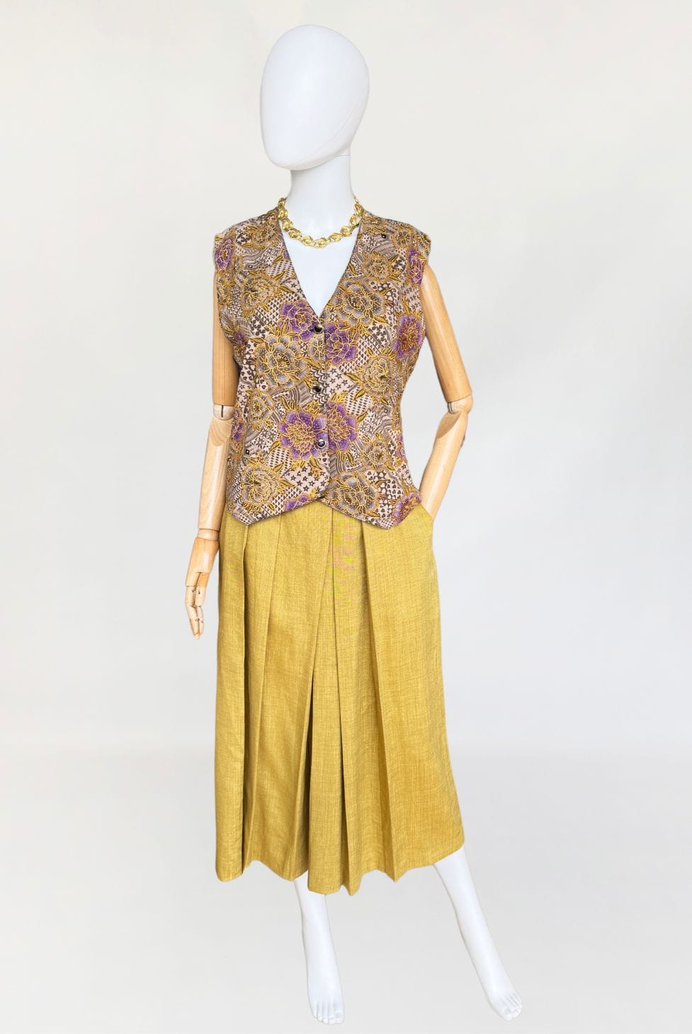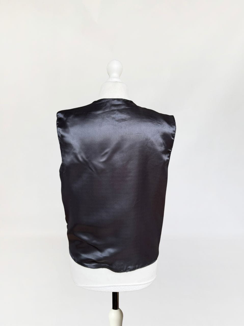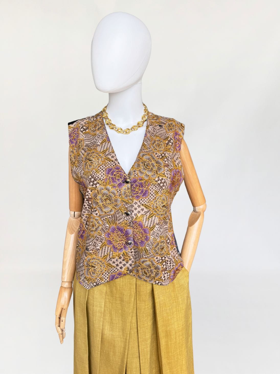 Kamizelka vintage w orientalnym stylu, wykonana z tkaniny o gęstym, wielobarwnym wzorze w odcieniach beżu, brązu i fioletu. Front wzbogacony subtelnym, biżuteryjnym zdobieniem o delikatnym połysku. Model zapinany na drobne dekoracyjne guziki. Tył wykonany z czarnego atłasu o gładkiej fakturze.