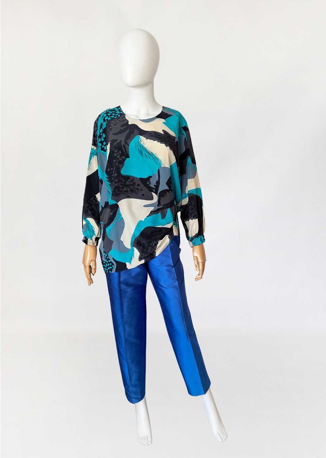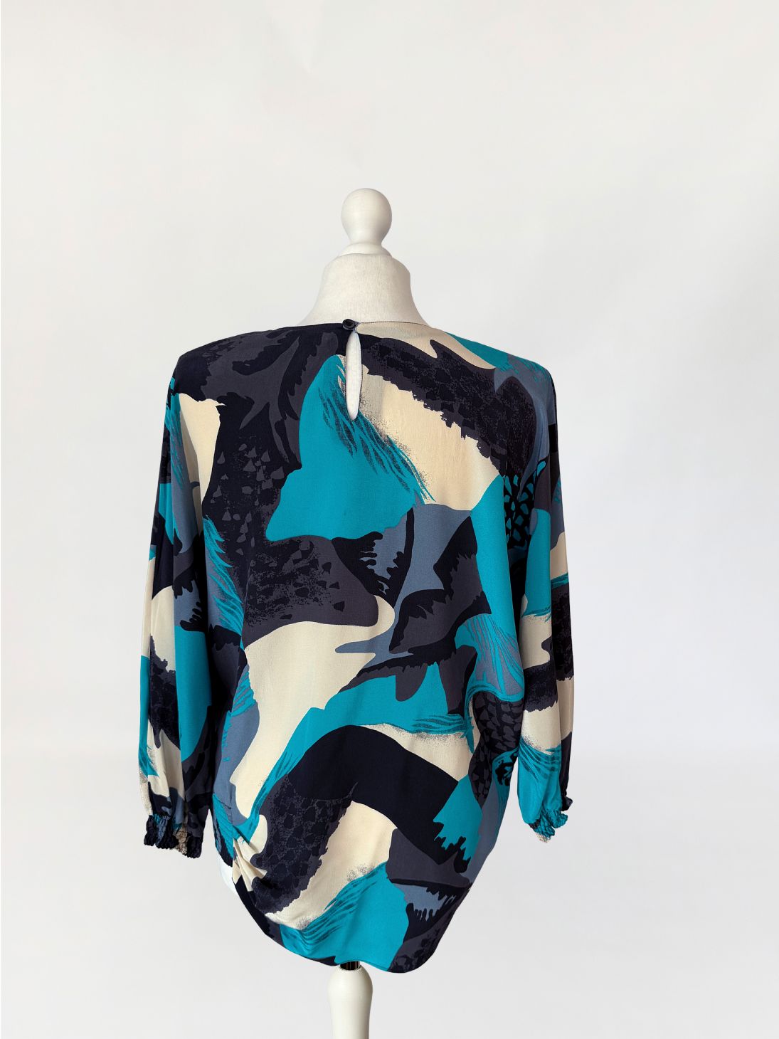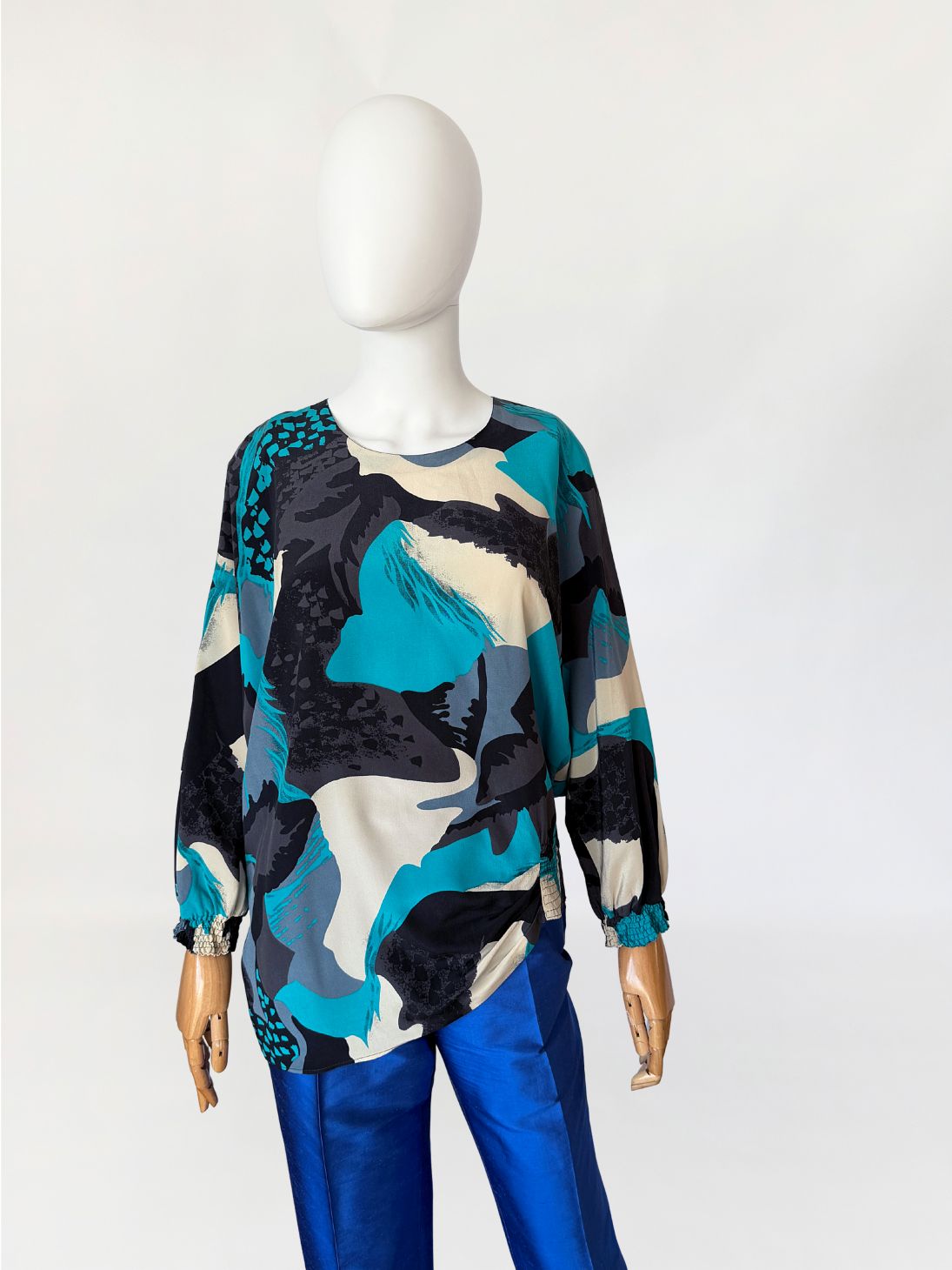 Koszula vintage luksusowej włoskiej marki Pancaldi&B wykonana z naturalnego jedwabiu, w wielobarwny wzór abstrakcyjny w odcieniach turkusu, czerni, beżu i szarości. Fason swobodny, z obniżoną linią ramion i długim rękawem zakończonym marszczonym mankietem;. Dekolt okrągły, tył zapinany na guzik z niewielkim rozcięciem. Dół o asymetrycznej długości.