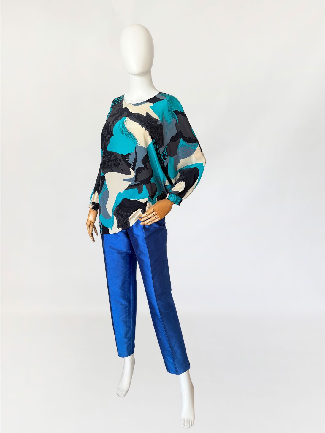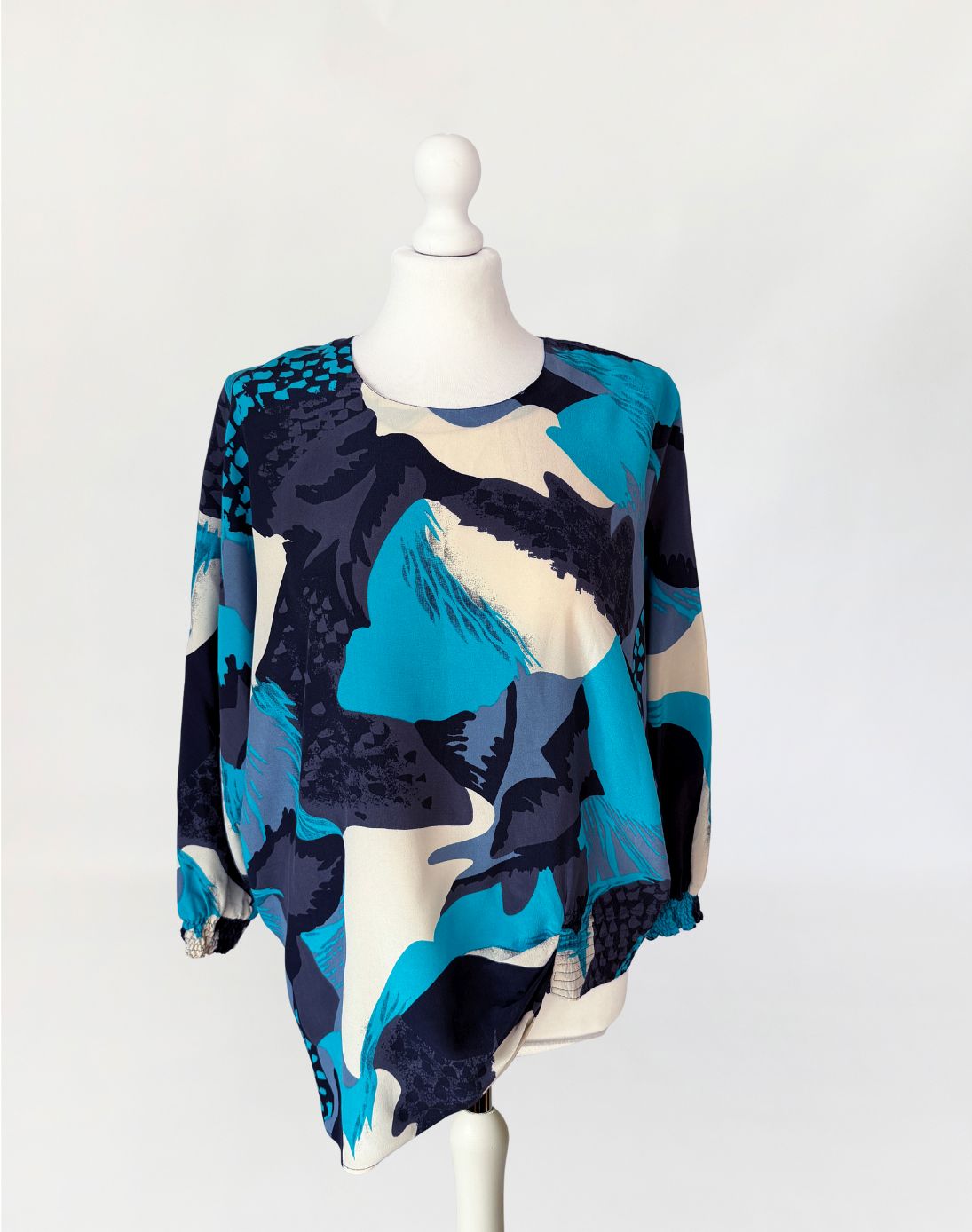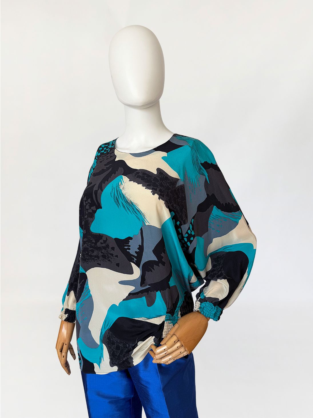 Koszula vintage luksusowej włoskiej marki Pancaldi&B wykonana z naturalnego jedwabiu, w wielobarwny wzór abstrakcyjny w odcieniach turkusu, czerni, beżu i szarości. Fason swobodny, z obniżoną linią ramion i długim rękawem zakończonym marszczonym mankietem;. Dekolt okrągły, tył zapinany na guzik z niewielkim rozcięciem. Dół o asymetrycznej długości.