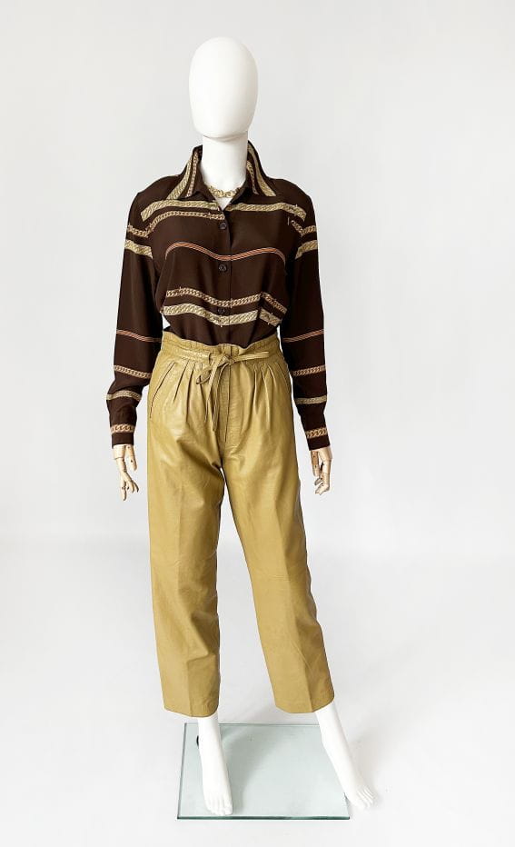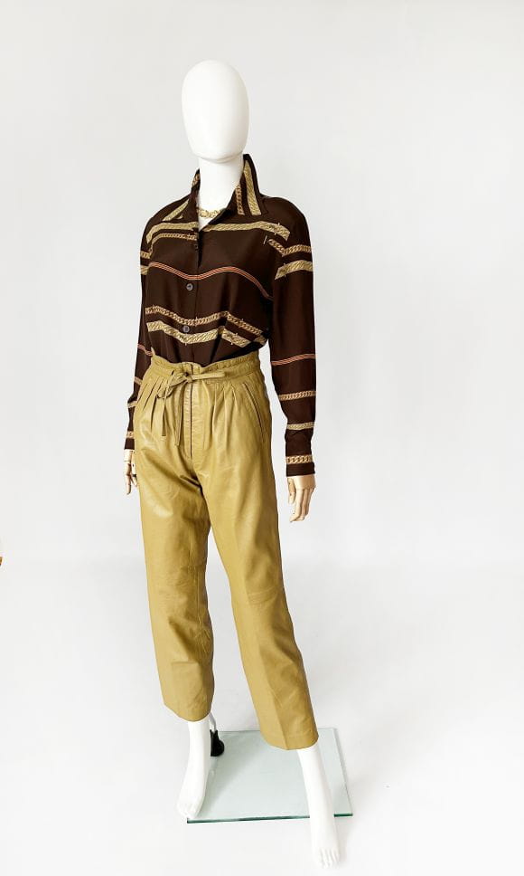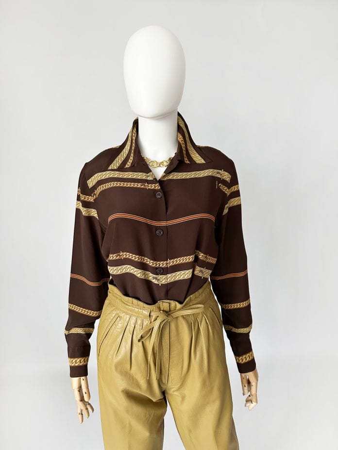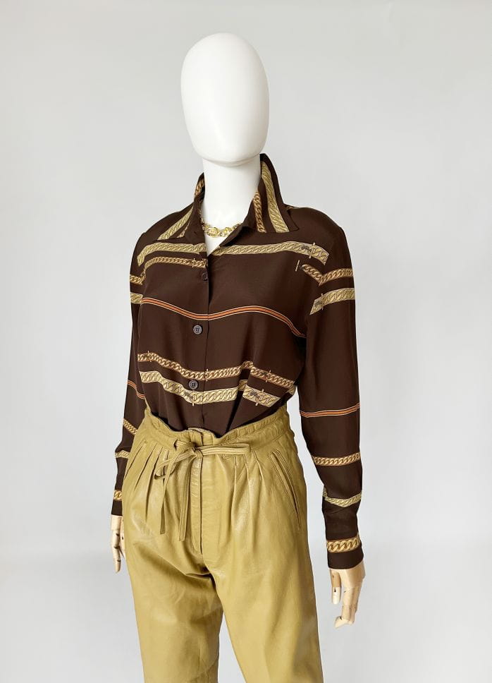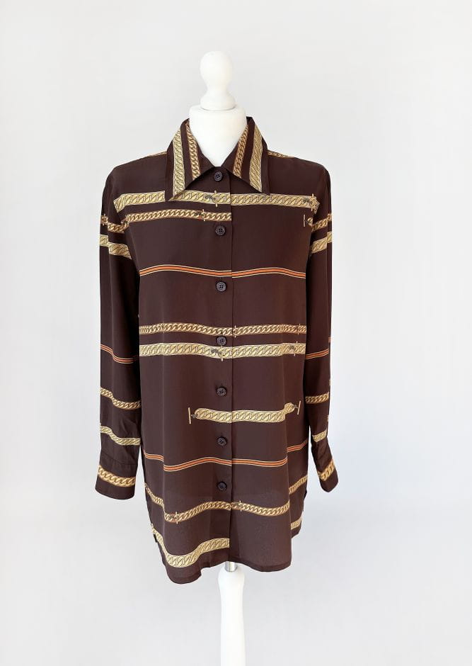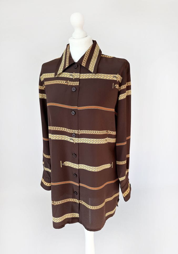 Koszula vintage z lat 80-tych projektu luksusowej włoskiej marki Pancaldi&B. Doskonała jakość wykonania, z dbałością o absolutnie każdy szczegół. Uszyta z naturalnego jedwabiu w regularne printy - biżuteryjny łańcuchy, motyw który od dawna stanowi inspirację dla luksusowych domów mody (Hermes, Gucci, Versace). Dłuższy fason z niewielkim kołnierzykiem. Klasyczne długie rękawy z przepinanymi mankietami.