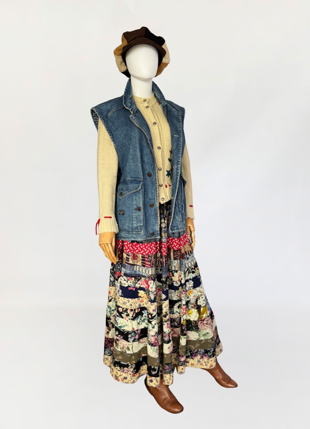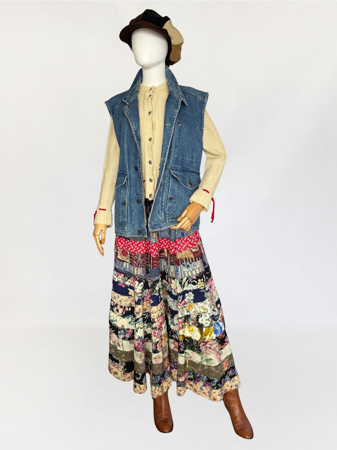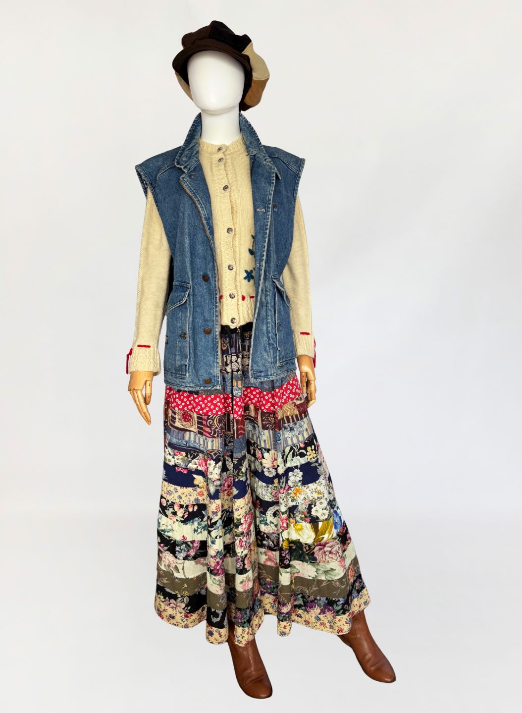 Spódnica vintage w stylu gypsy wykonana z lekkiej tkaniny bawełnianej w patchworkowe wzory. Model o długości maxi zbudowany z poziomych pasów zestawionych z tkanin o różnych wzorach, od florystycznych po geometryczne i paisley w palecie granatów, czerwieni, beżu, oliwki i ecru. Konstrukcja oparta na marszczonych warstwach nadaje sylwetce objętość i płynny ruch. W talii elastyczny pas z czarnej dzianiny z troczkiem do regulacji obwodu. Każdy fragment tkaniny o nieco odmiennym motywie tworzy unikalny układ wzorów, charakterystyczny dla mody folk-boho lat 70-tych, 80-tych.