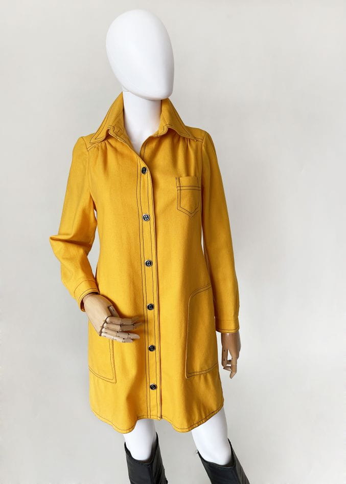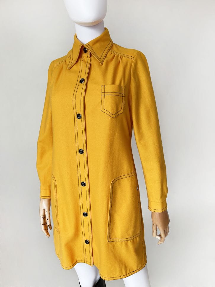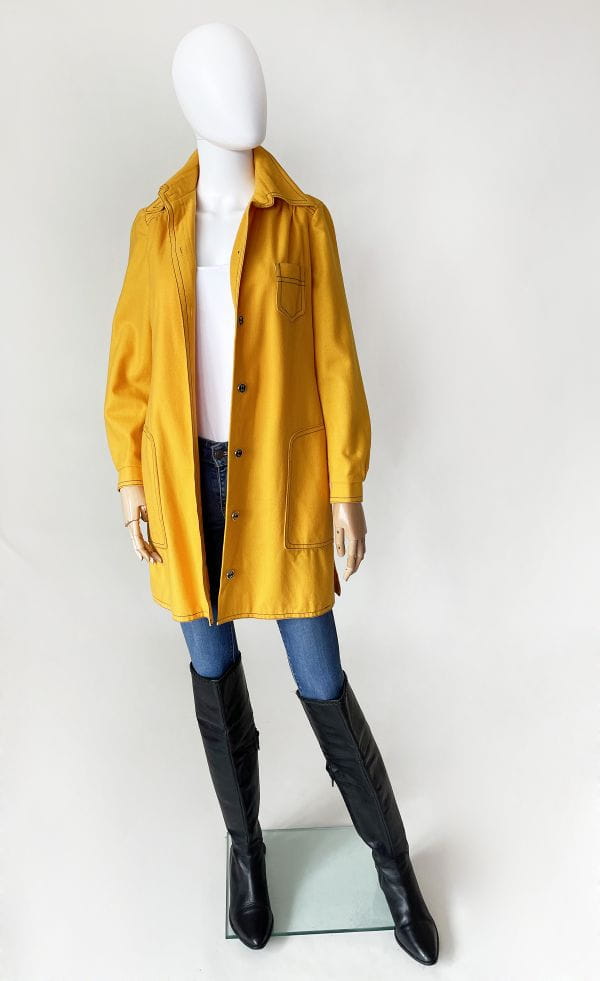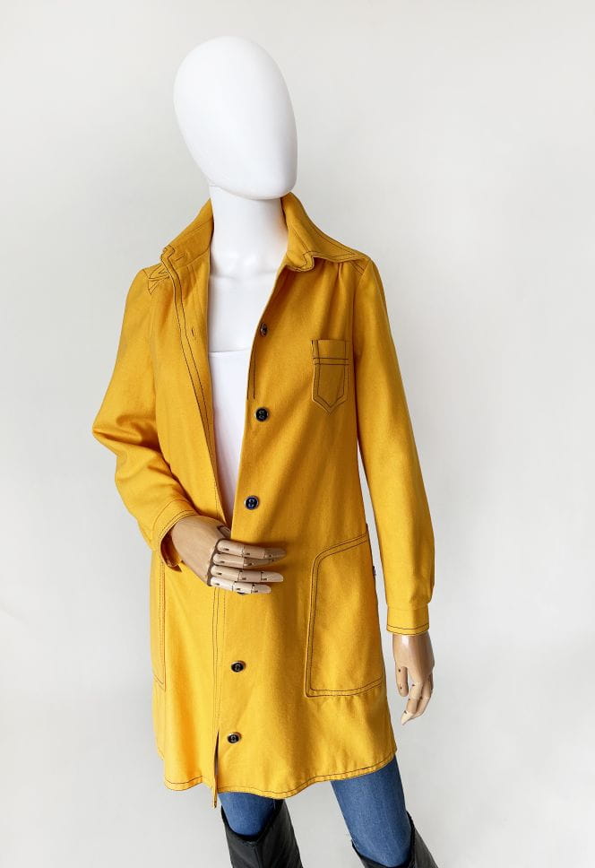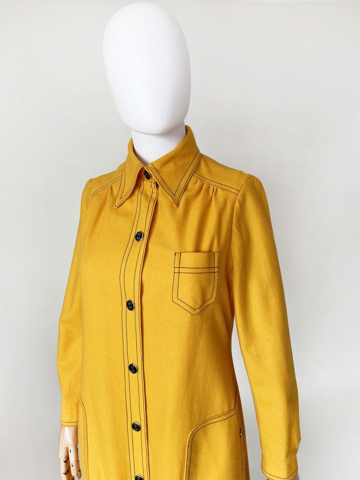 True vintage z początku lat 70-tych. Lekki płaszcz kultowej marki Peggy Lane, z powodzeniem zastąpi także sukienkę. Wykonany z dobrej jakości wełnianej tkaniny w kolorze kurkumy. Na całości kontrastowe czarne szwy, które nadają mu wyrazistości i akcentują duże kieszenie u dołu, oraz mniejszą u góry. Zapinany na spore guziki. U góry charakterystyczny dla dekady, spiczasty kołnierzyk. Korpus na podszewce. U dołu po bokach krótkie rozporki.