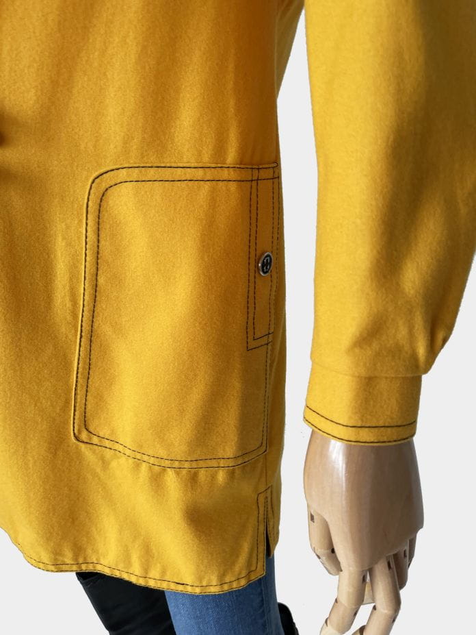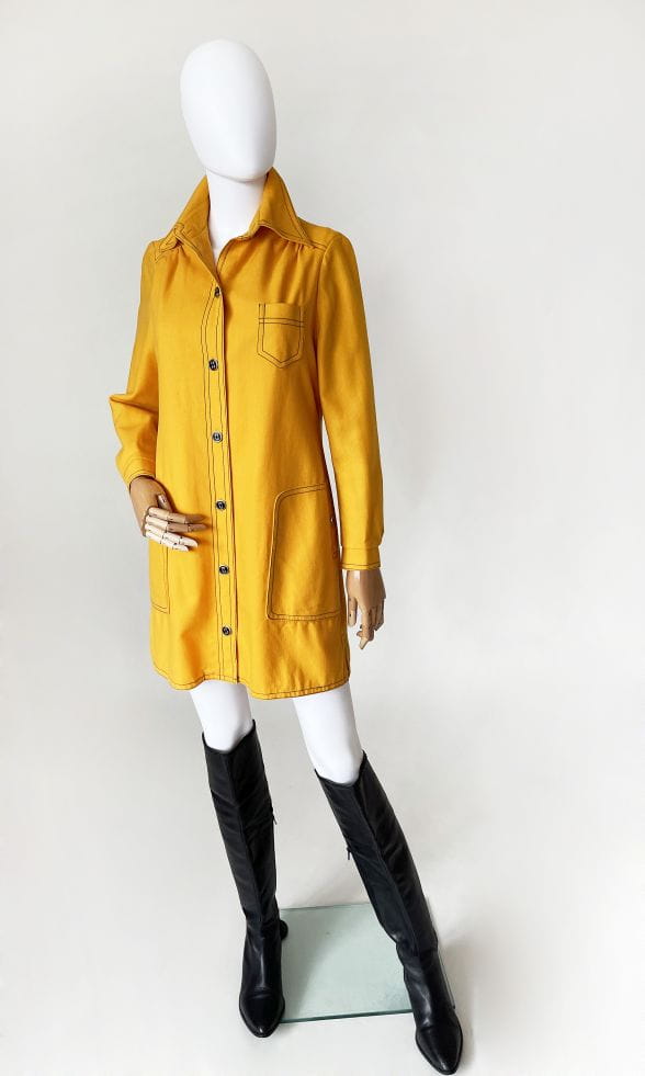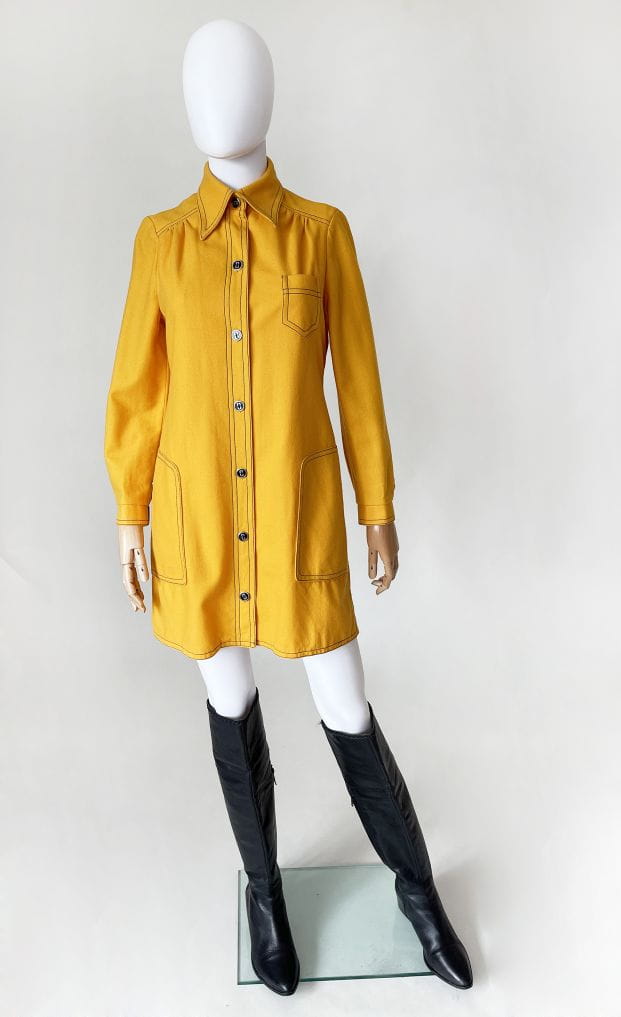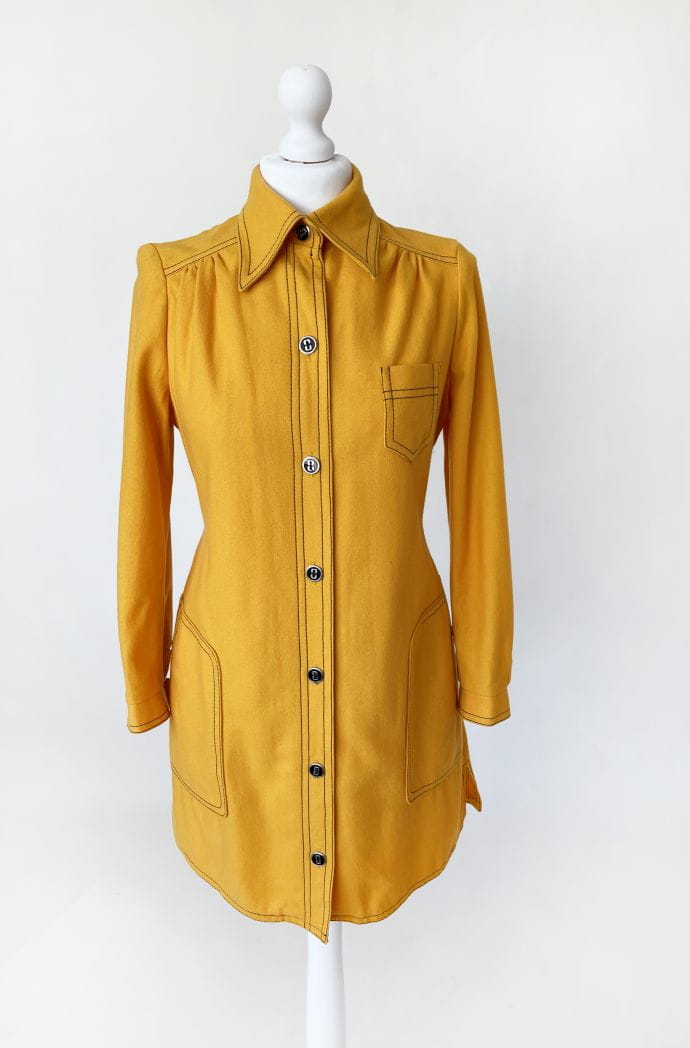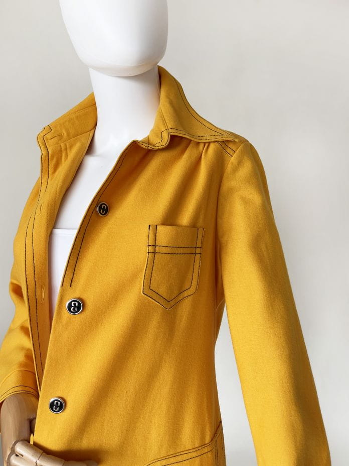 True vintage z początku lat 70-tych. Lekki płaszcz kultowej marki Peggy Lane, z powodzeniem zastąpi także sukienkę. Wykonany z dobrej jakości wełnianej tkaniny w kolorze kurkumy. Na całości kontrastowe czarne szwy, które nadają mu wyrazistości i akcentują duże kieszenie u dołu, oraz mniejszą u góry. Zapinany na spore guziki. U góry charakterystyczny dla dekady, spiczasty kołnierzyk. Korpus na podszewce. U dołu po bokach krótkie rozporki.