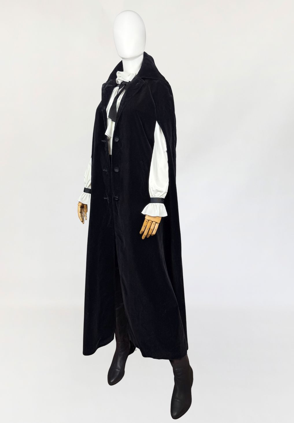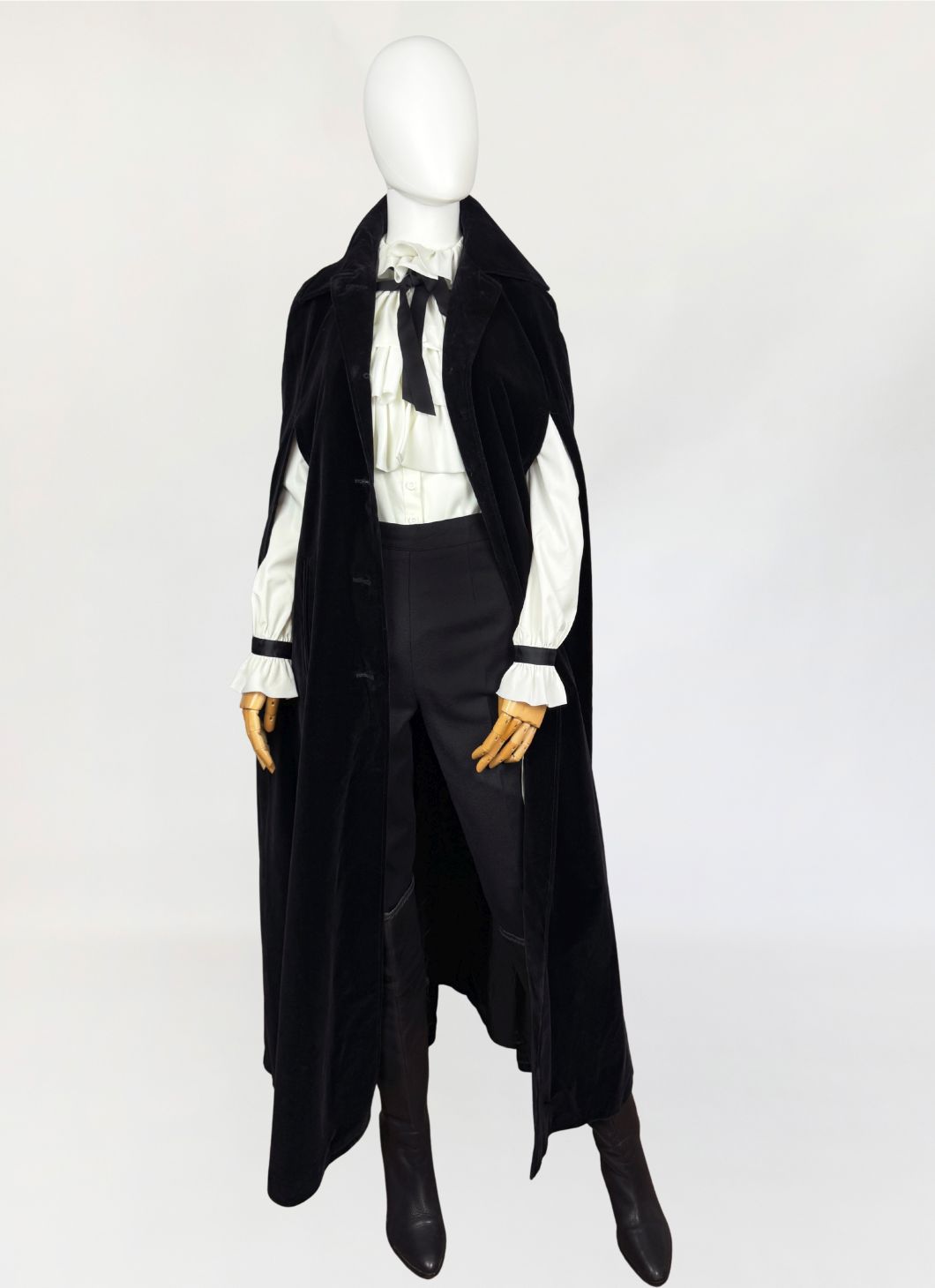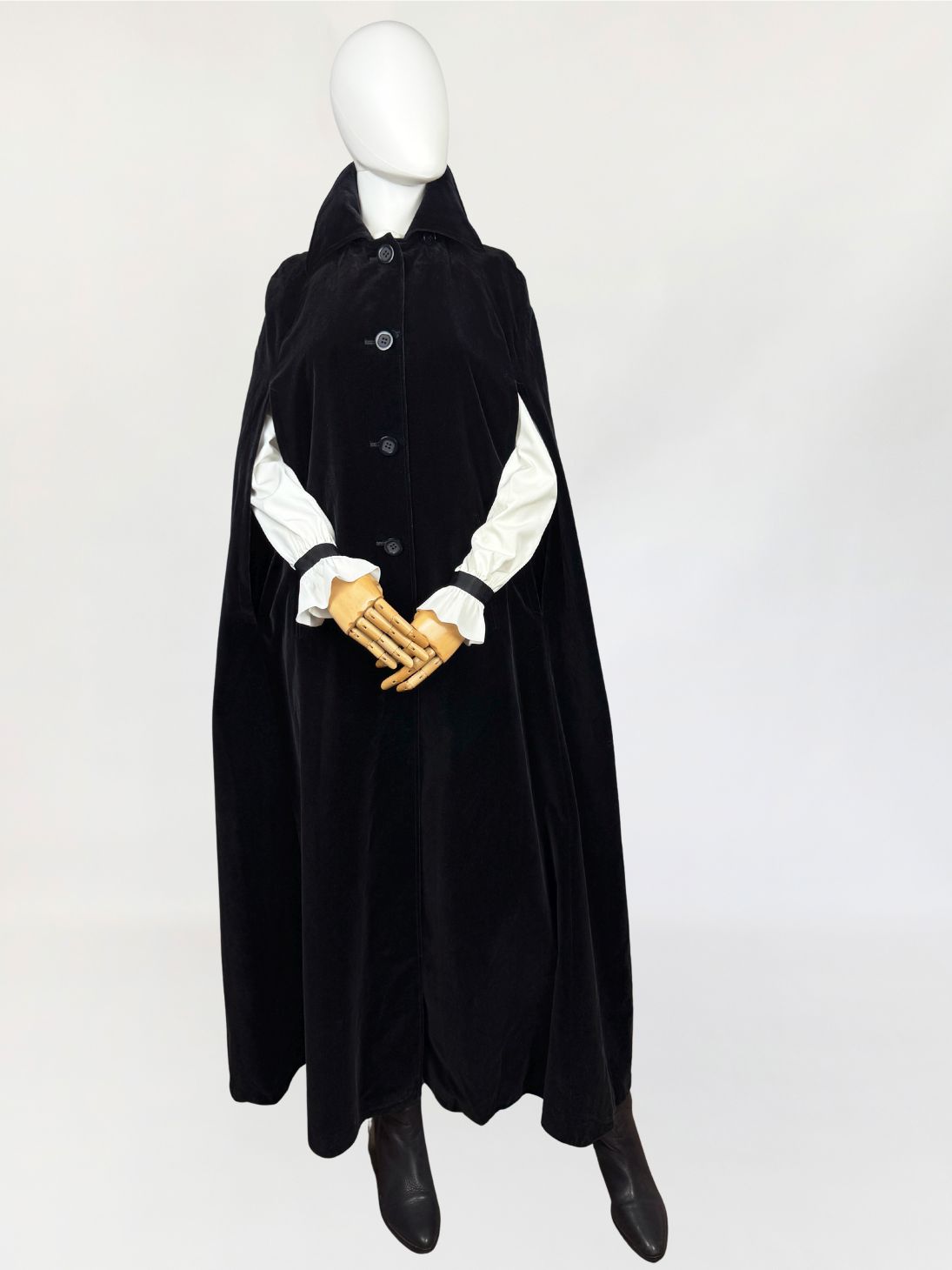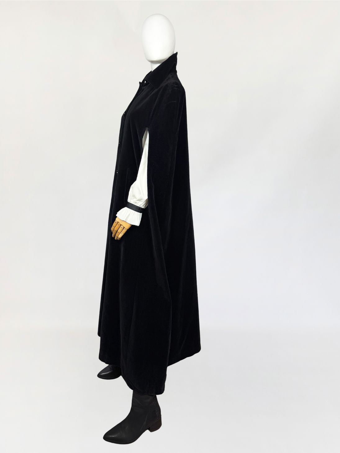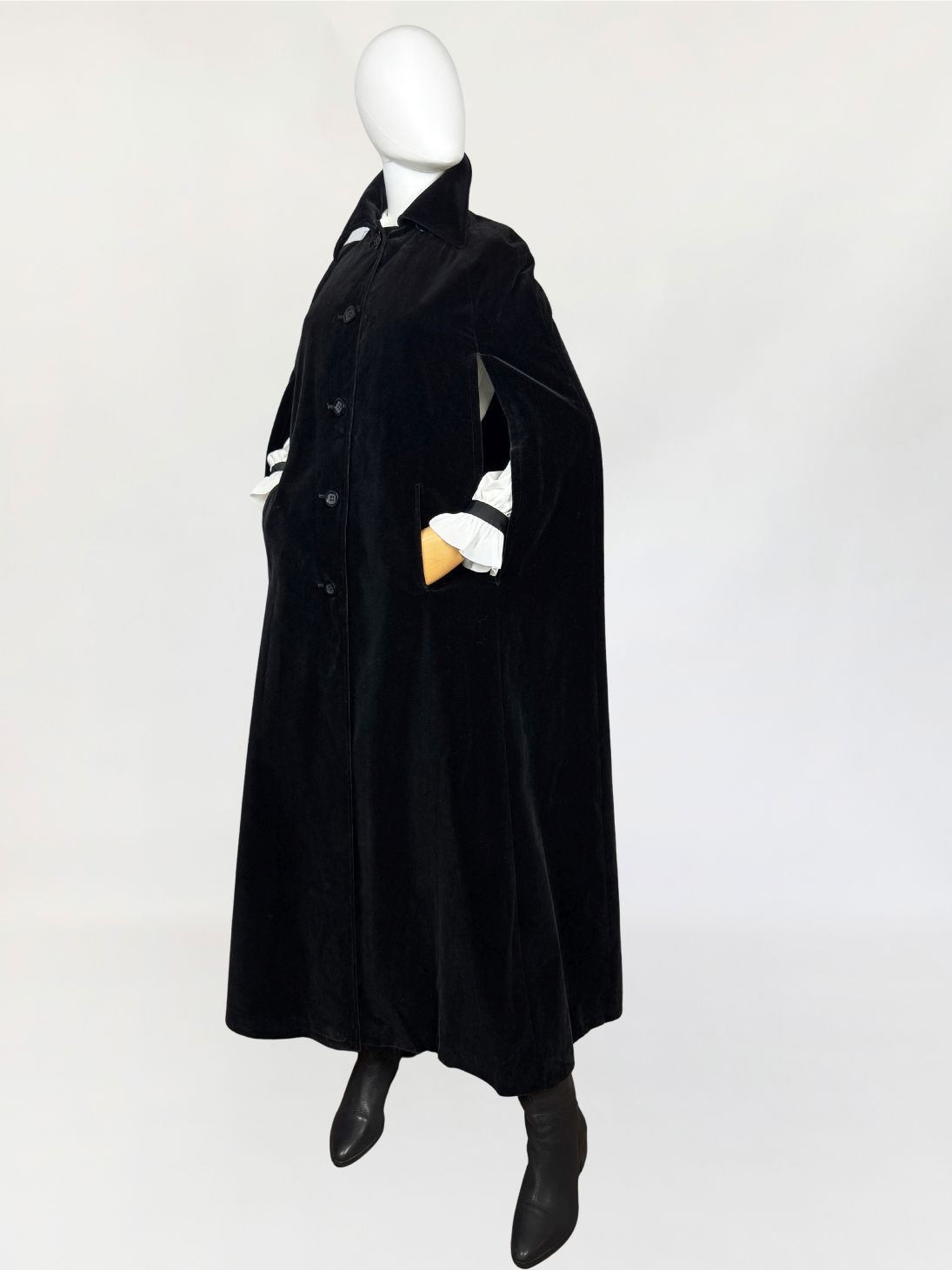 Peleryna vintage wykonana z miękkiego aksamitu w głębokim, jednolitym czarnym kolorze. Model o długości maxi, swobodnie opadający, z charakterystycznym krojem typu cape. Front zapinany na rząd klasycznych guzików. Dekolt wykończony klasycznym kołnierzem. Boczne rozcięcia umożliwiają swobodne przełożenie rąk, zachowując pełną funkcjonalność przy zamkniętej formie peleryny.