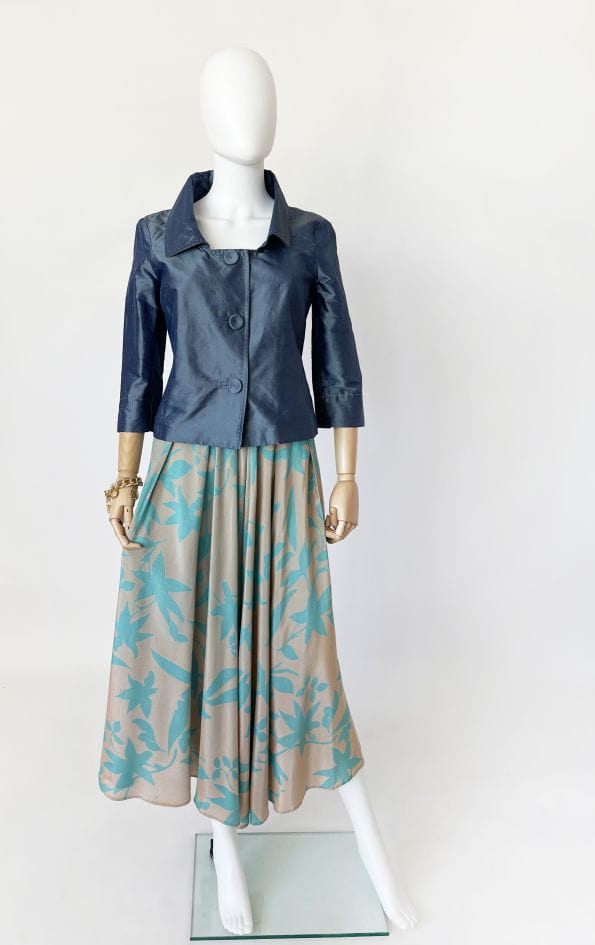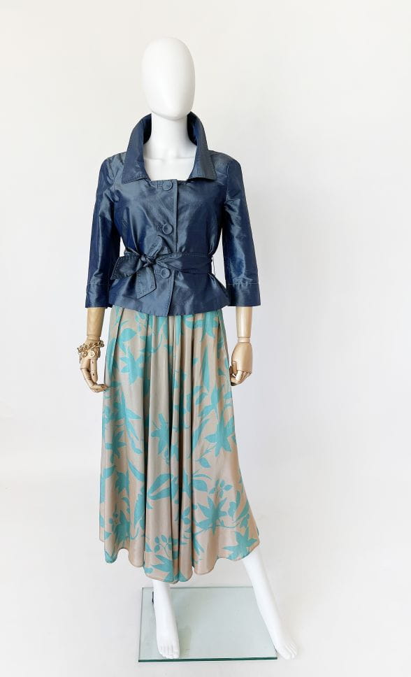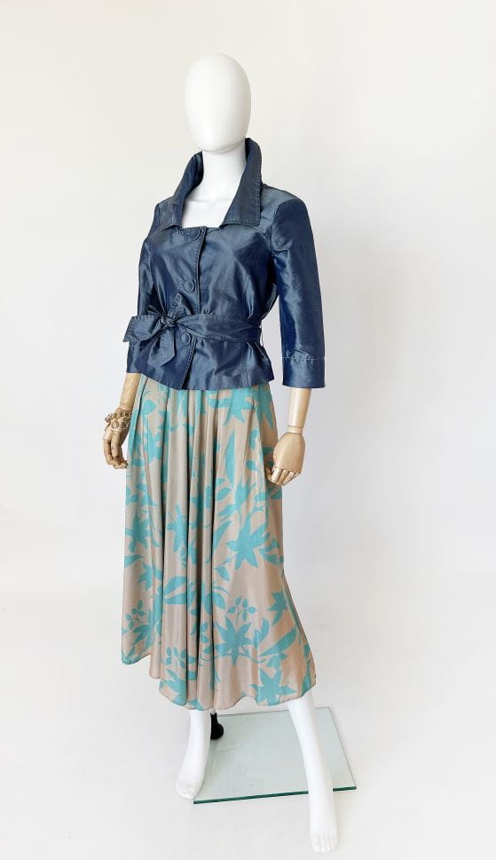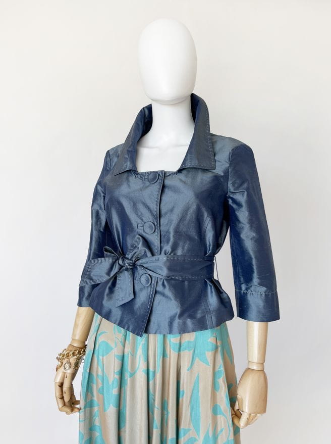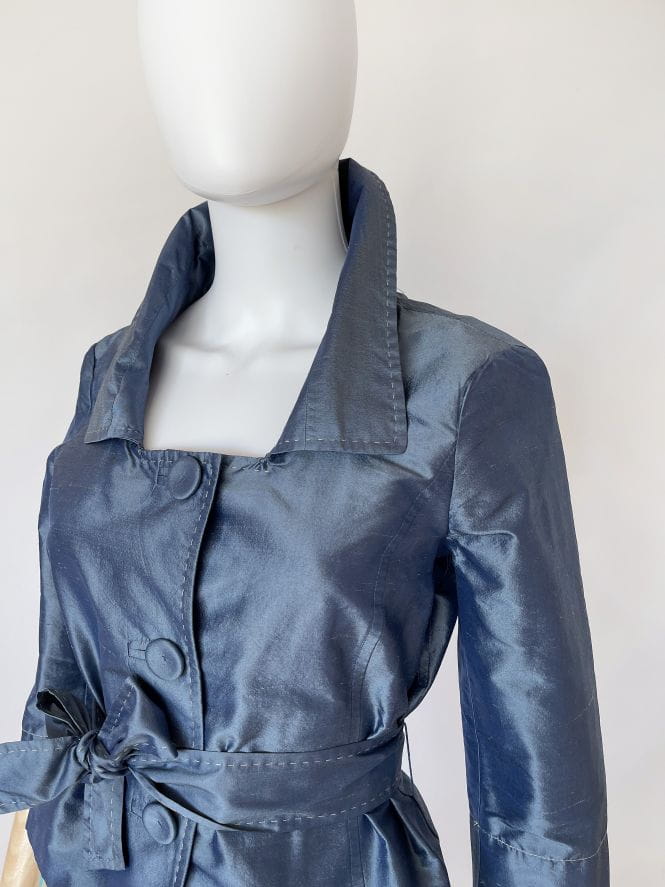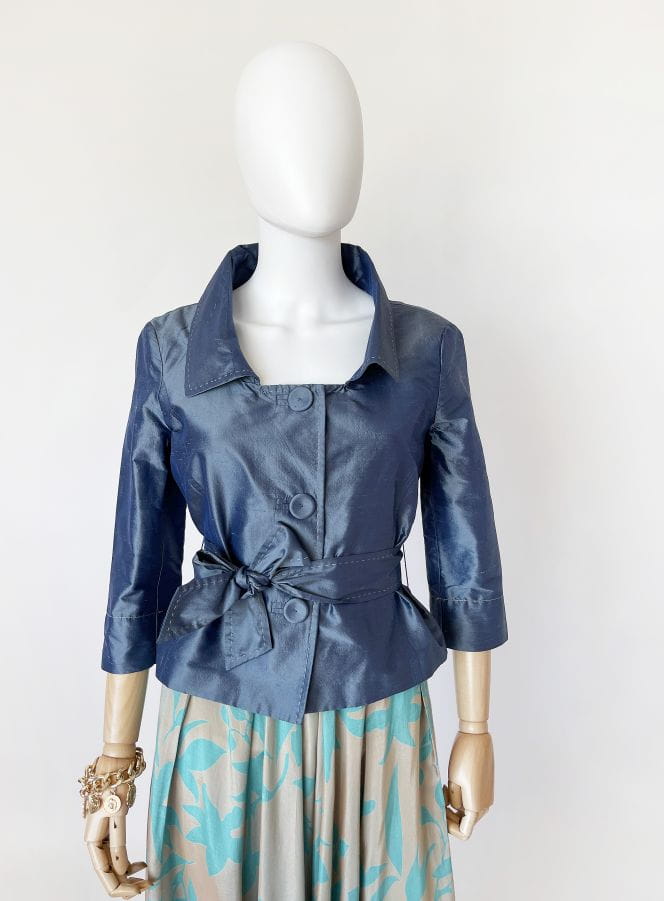 Jedwabna kurteczka marki Penny Black. Krótki fason z kołnierzem i rękawami 3/4. W pasie przewiązywana jedwabną szarfą. Zapinana na duże guziki, wzdłuż linii zapięcia kontrastowe szwy. Można nosić ją również jako żakiet.