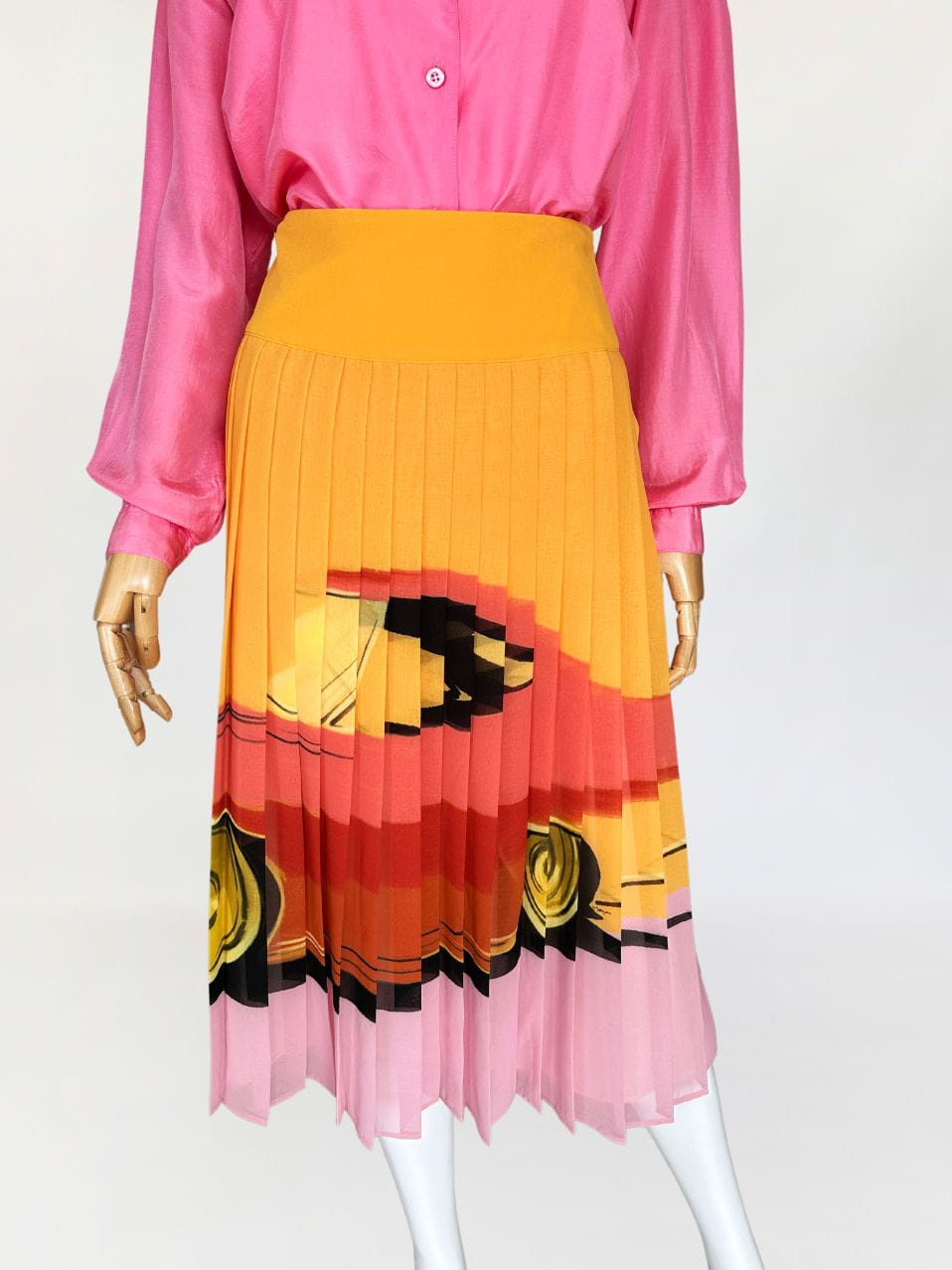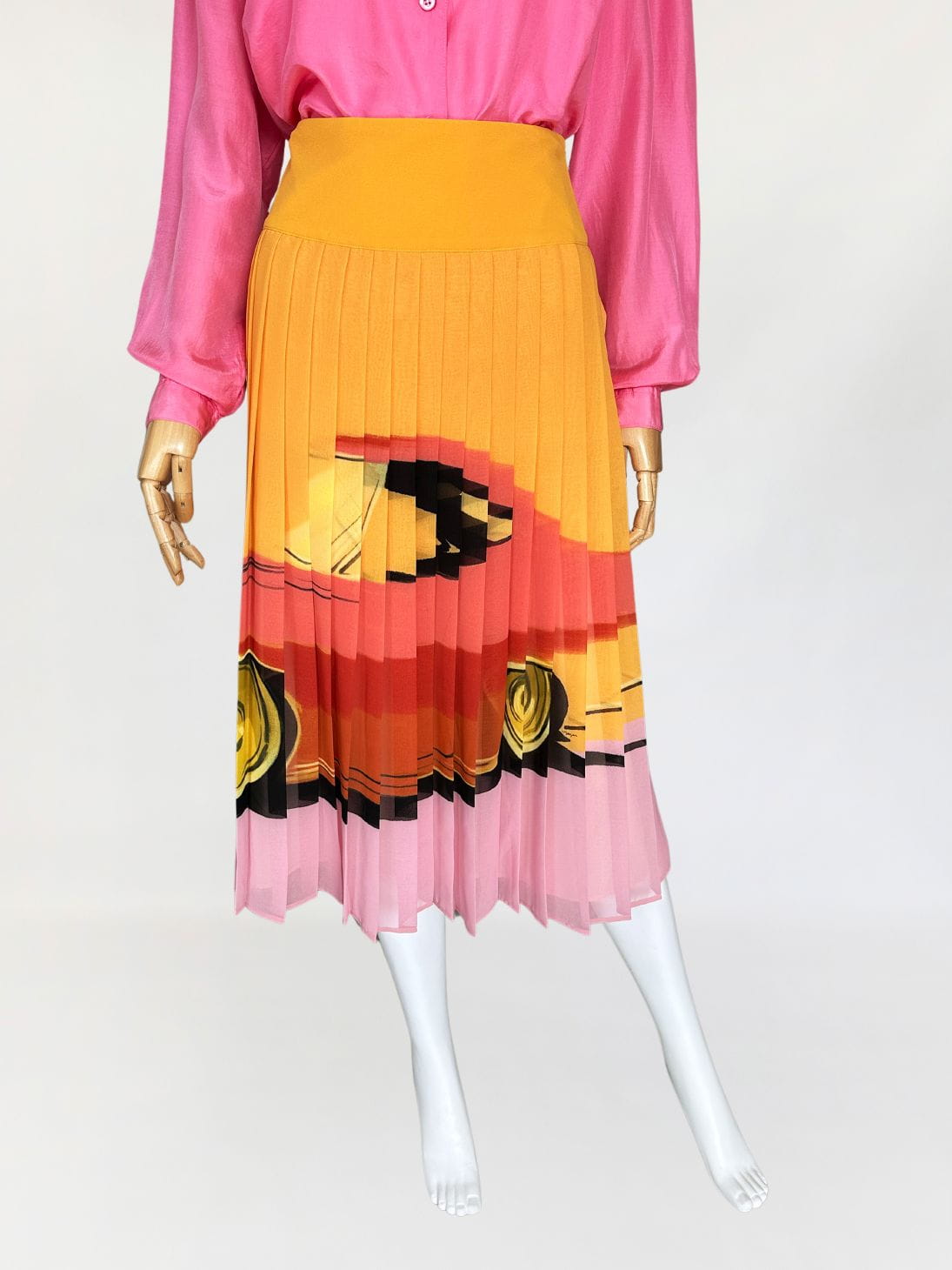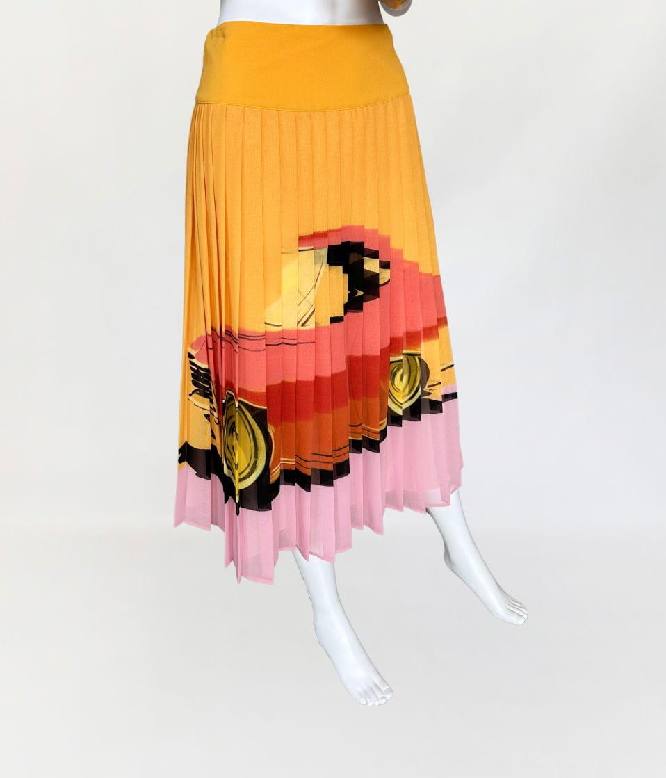 Nowa z kompletem metek. Plisowana spódnica marki Penny Black z limitowanej edycji 2020 "Sunset Road" powstałej we współpracy z amerykańskim ilustratorem i projektantem Spirosem Halarisem. Casual'owy model w soczystym zestawieniu colorblock z dużym printem oldschoolowego auta.