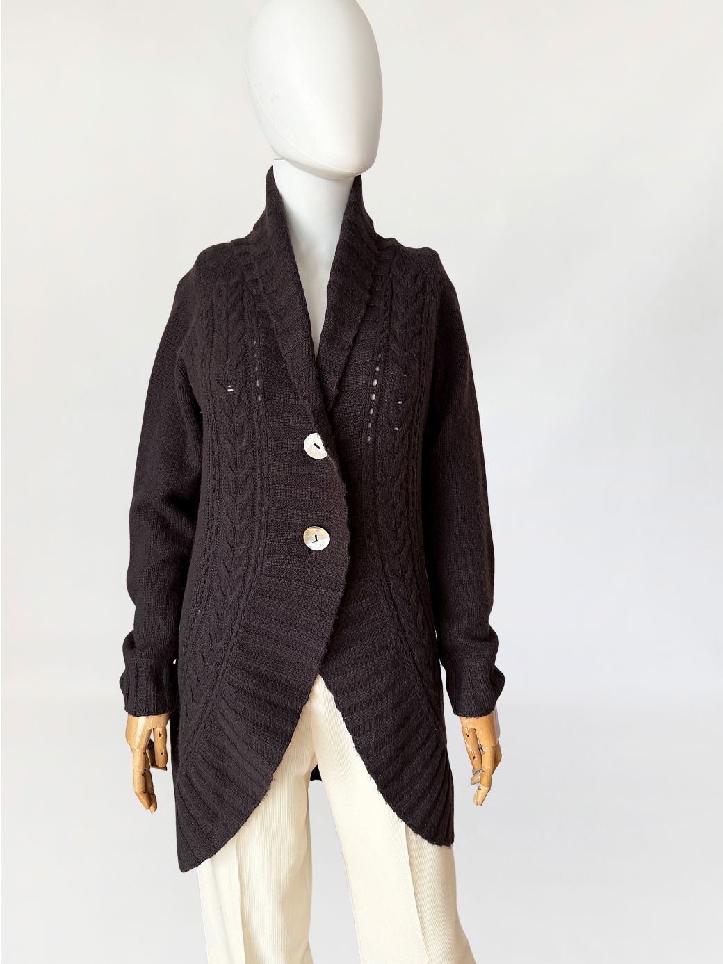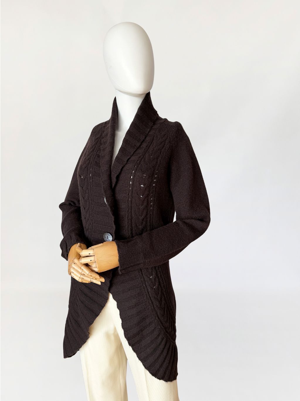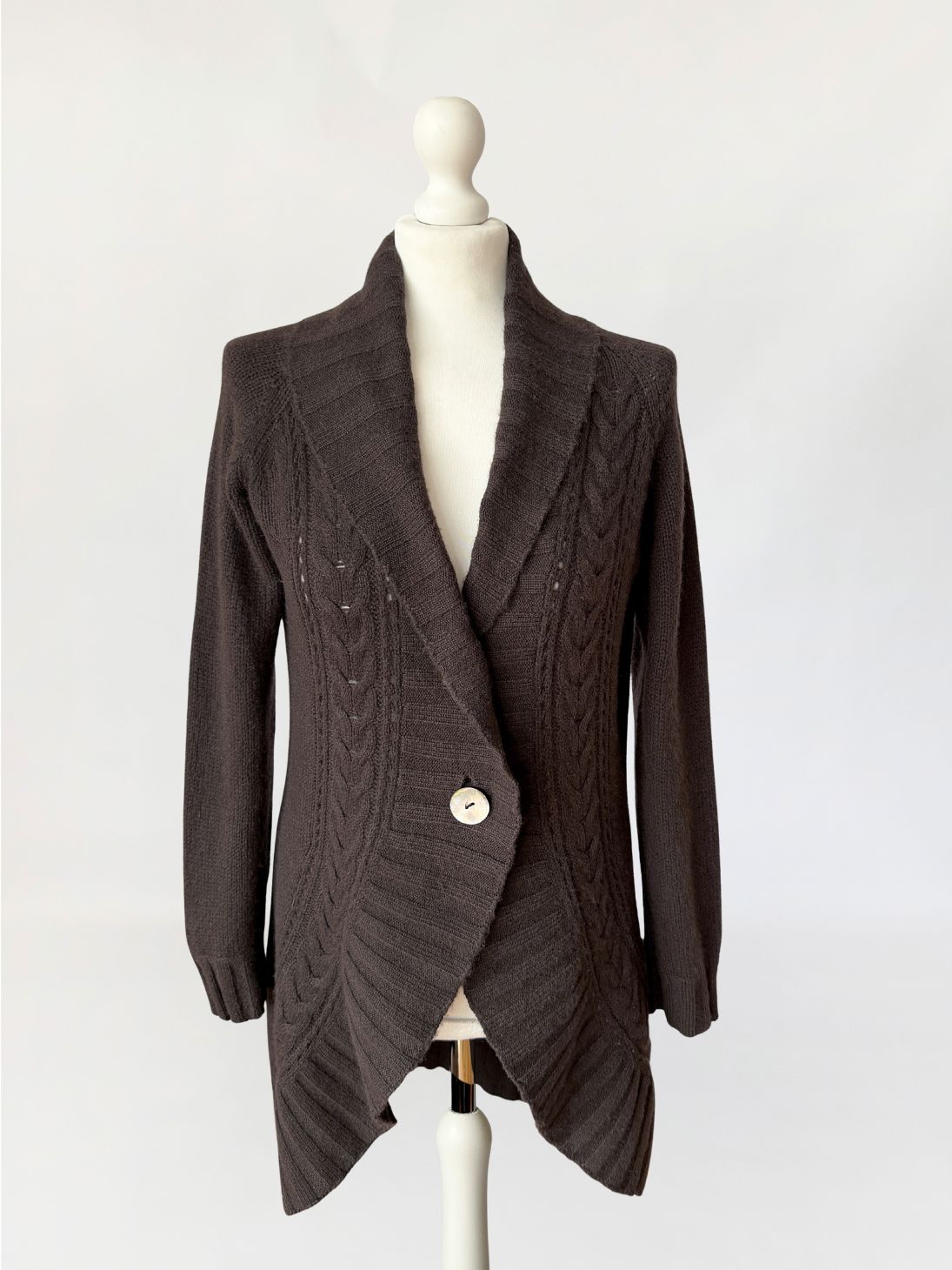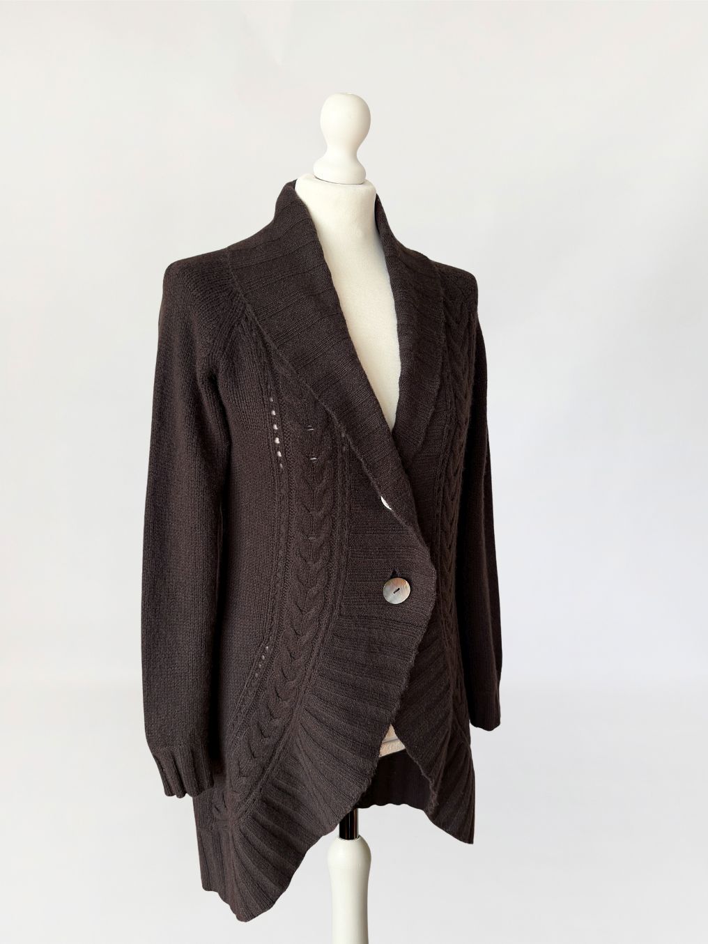 Kardigan marki Peter Hahn wykonany w całości z miękkiego kaszmiru w ciemnobrązowym czekoladowym odcieniu. Fason o wydłużonej linii, z przodem o zaokrąglonej, asymetrycznej krawędzi. Zapięcie jednorzędowe na dwa guziki z masy perłowej. Dekolt przechodzący w szeroki, szalowy kołnierz z prążkowanym wykończeniem. Przód modelowany pionowymi panelami o zróżnicowanej strukturze dzianiny, w tym wyraźnymi splotami warkoczowymi oraz ażurowymi prześwitami. Tył gładki, jednolity. Długie raglanowe rękawy, zakończone prążkowanymi mankietami. Dół wykończony szerokim ściągaczem.