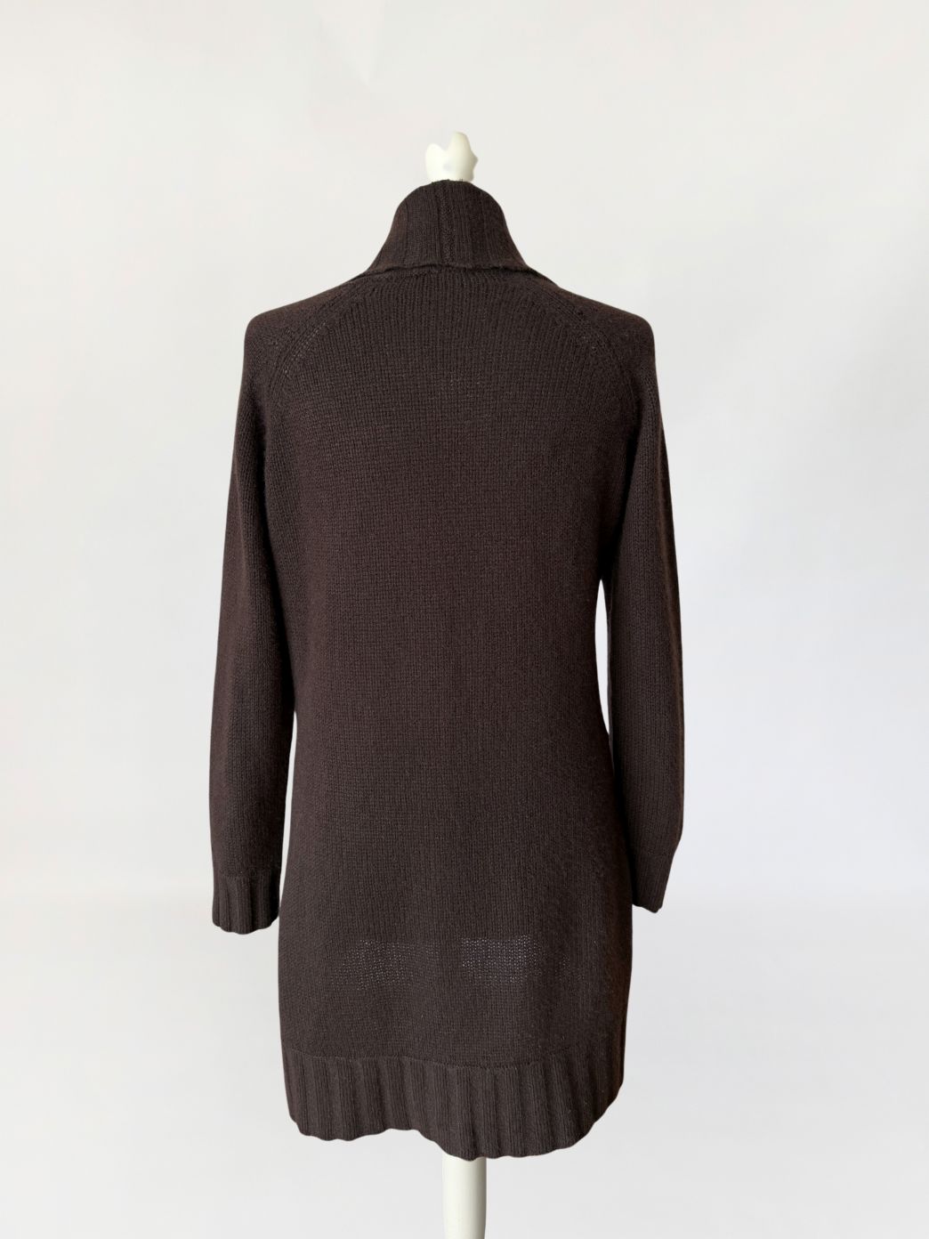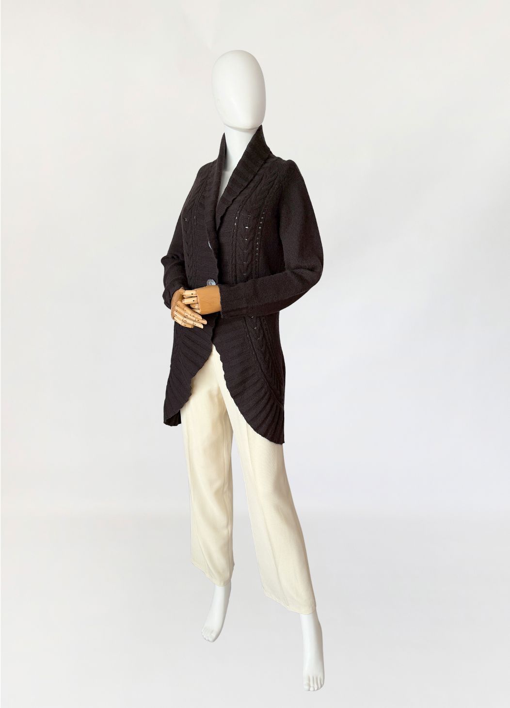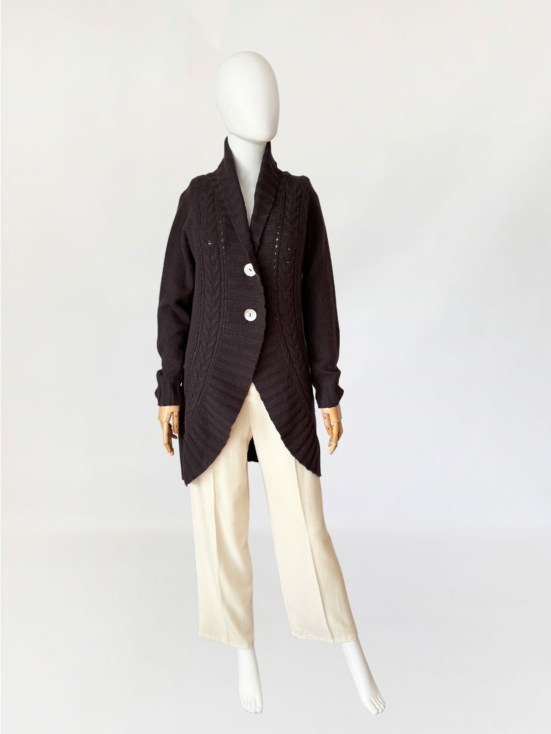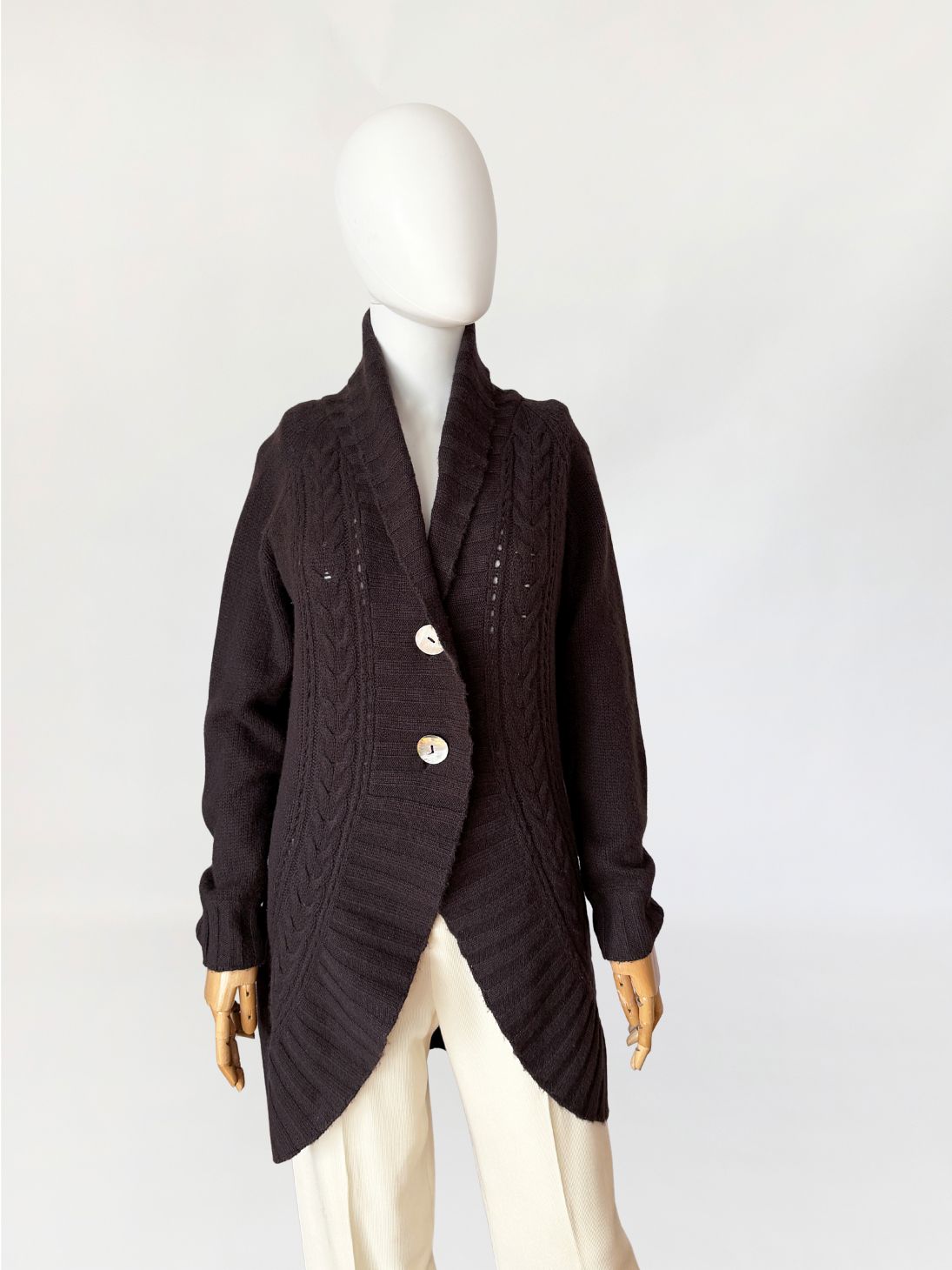 Kardigan marki Peter Hahn wykonany w całości z miękkiego kaszmiru w ciemnobrązowym czekoladowym odcieniu. Fason o wydłużonej linii, z przodem o zaokrąglonej, asymetrycznej krawędzi. Zapięcie jednorzędowe na dwa guziki z masy perłowej. Dekolt przechodzący w szeroki, szalowy kołnierz z prążkowanym wykończeniem. Przód modelowany pionowymi panelami o zróżnicowanej strukturze dzianiny, w tym wyraźnymi splotami warkoczowymi oraz ażurowymi prześwitami. Tył gładki, jednolity. Długie raglanowe rękawy, zakończone prążkowanymi mankietami. Dół wykończony szerokim ściągaczem.