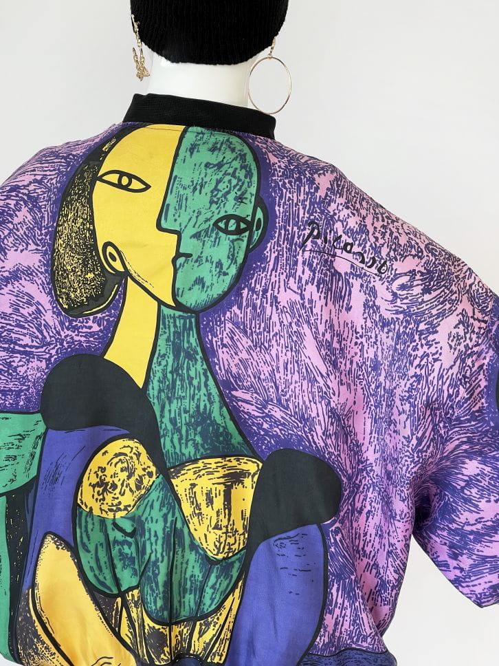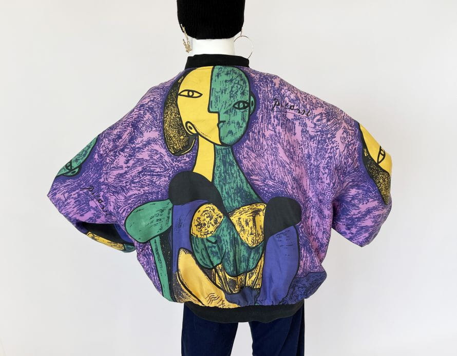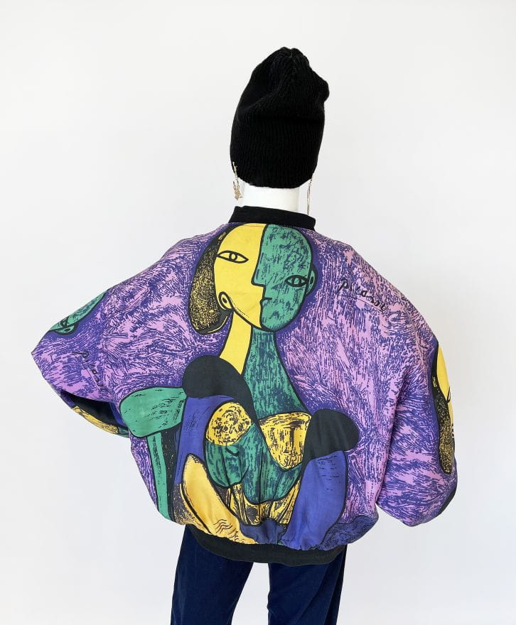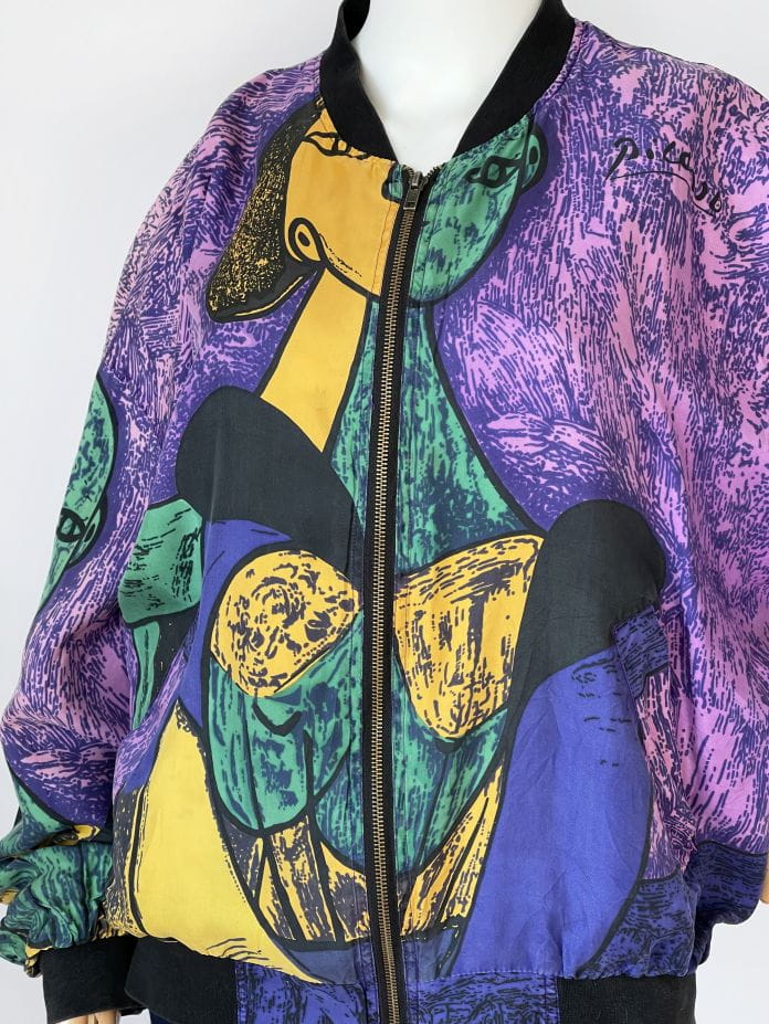 Kultowy, kolekcjonerski bomber vintage Picasso z lat 80-tych. Uszyty z delikatnej jedwabnej tkaniny w kubistyczne wzory. Pomimo upływu lat zarówno tkanina jak i kolory, zachowały się w bardzo dobrym stanie. Model unisex oversize. U dołu na ściągaczu. Po bokach wsuwane kieszenie. Od wewnątrz na podszewce. Rzadki egzemplarz o unikatowym deseniu.