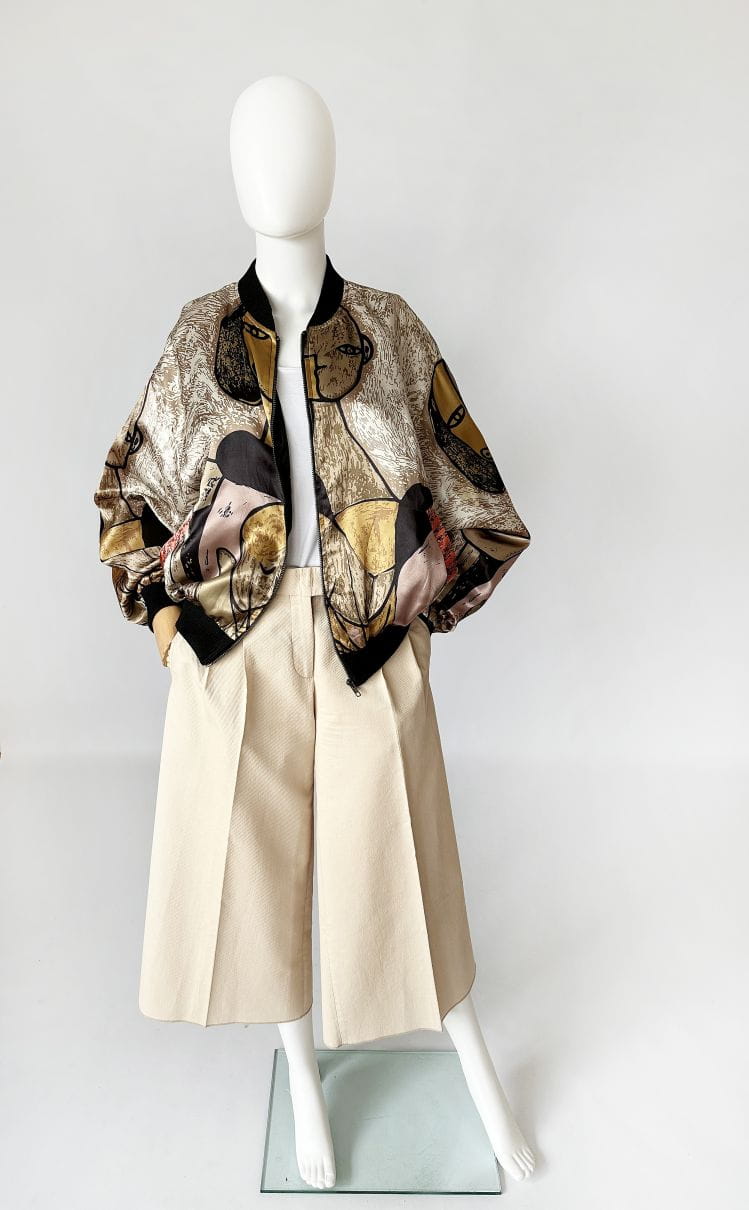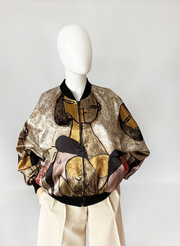 Lekka bomberka vintage uszyta z satynowej tkaniny w kultowy kubistyczny motyw Picasso. Oversize'owy fason z obniżoną linią pach, u dołu na dzianinowym elastycznym ściągaczu. Po bokach wsuwane kieszenie. Kurtka nie ma żadnych metek, tkanina jest jedwabista w dotyku, ale nie jesteśmy w stanie określić czy jest naturalna, czy syntetyczna.