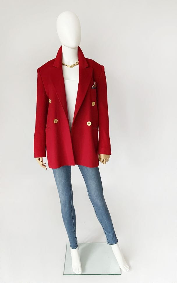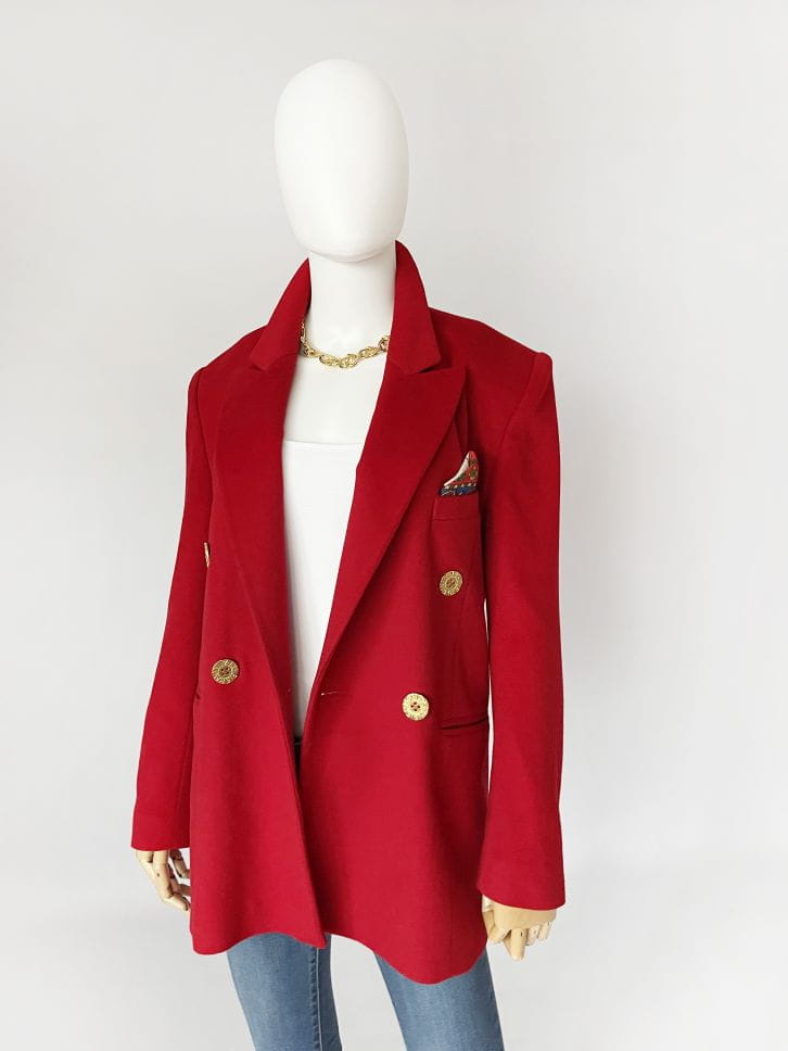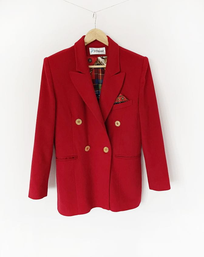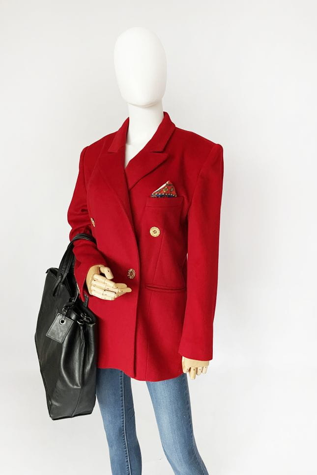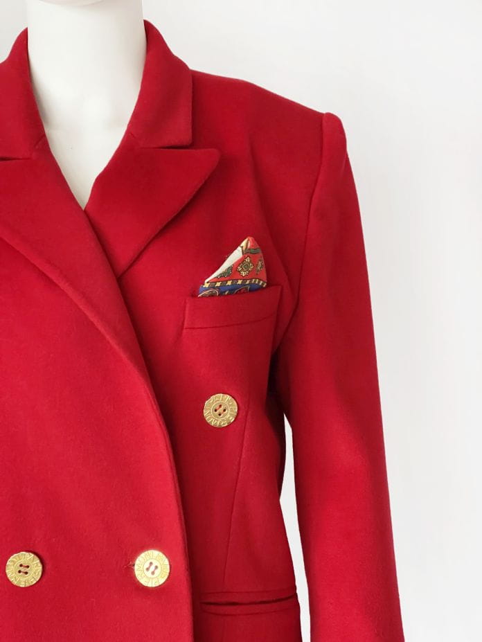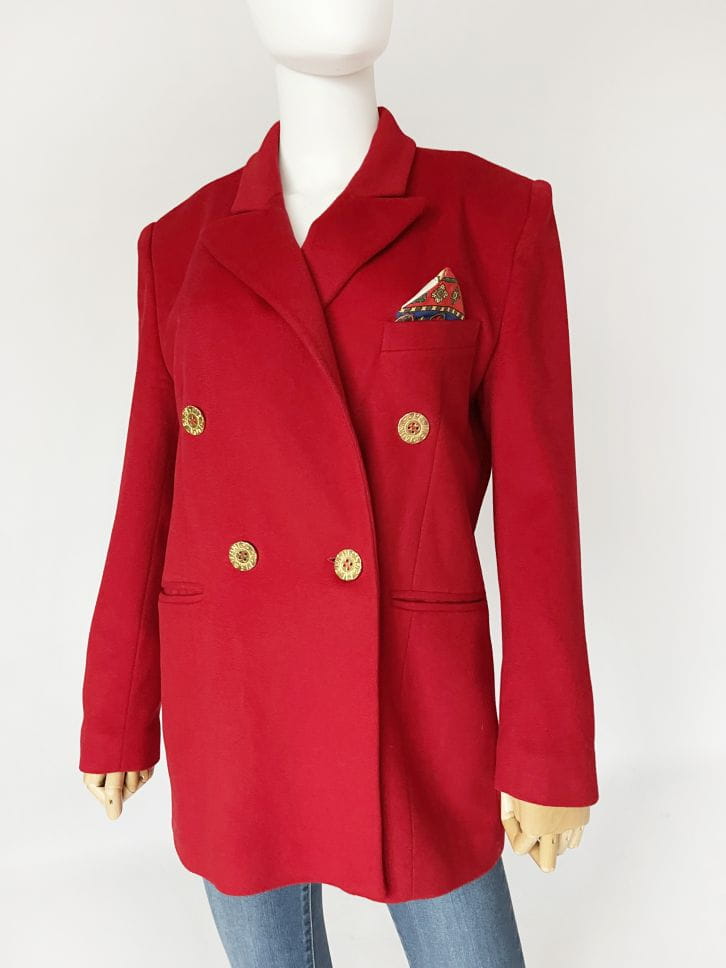 Wyjątkowy okaz vintage. Przepiękna marynarka francuskiej marki Piermont. Doskonała jakościowo: w składzie dwa rodzaje wełen i kaszmir. Tkanina jest bardzo zadbana i miękka. Czerwony twarzowy odcień doskonale współgra z eleganckim złotem guzików. Dwurzędowy model, stworzony z dbałością o każdy detal poczynając od logowanych guzików, kończąc na przepięknej podszewce, we wzór dzikich kaczek, która wygląda jak dzieła z pracowni Hermes. U dołu wsuwane kieszenie. U góry niewielka, z przepiękną poszetką. Pochodzi z lat 80/90.