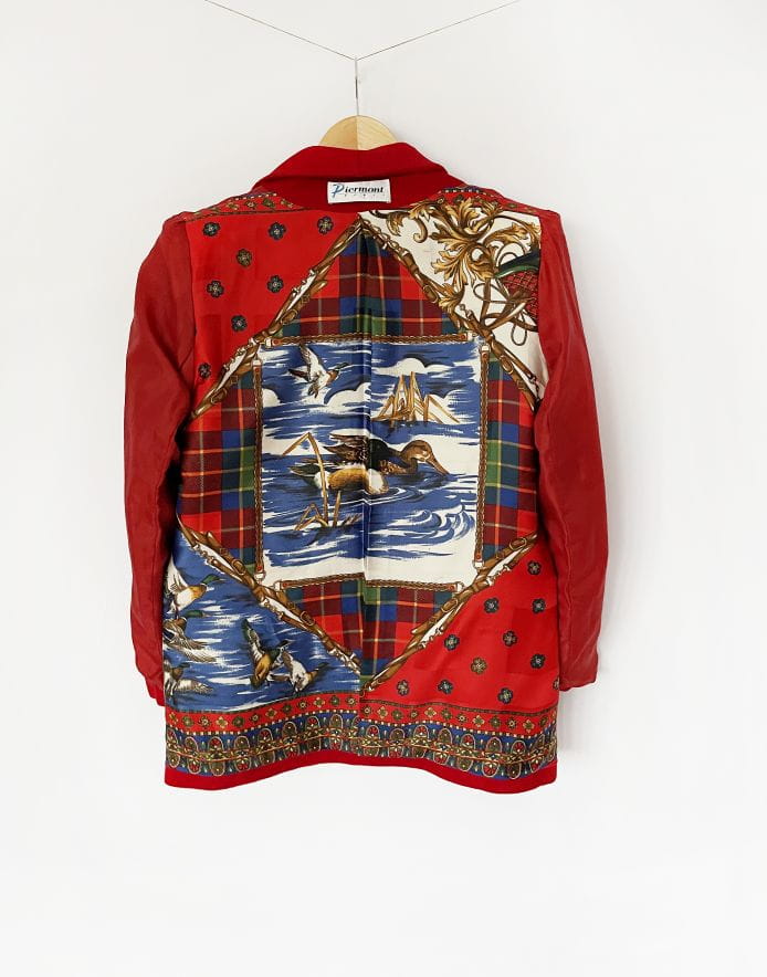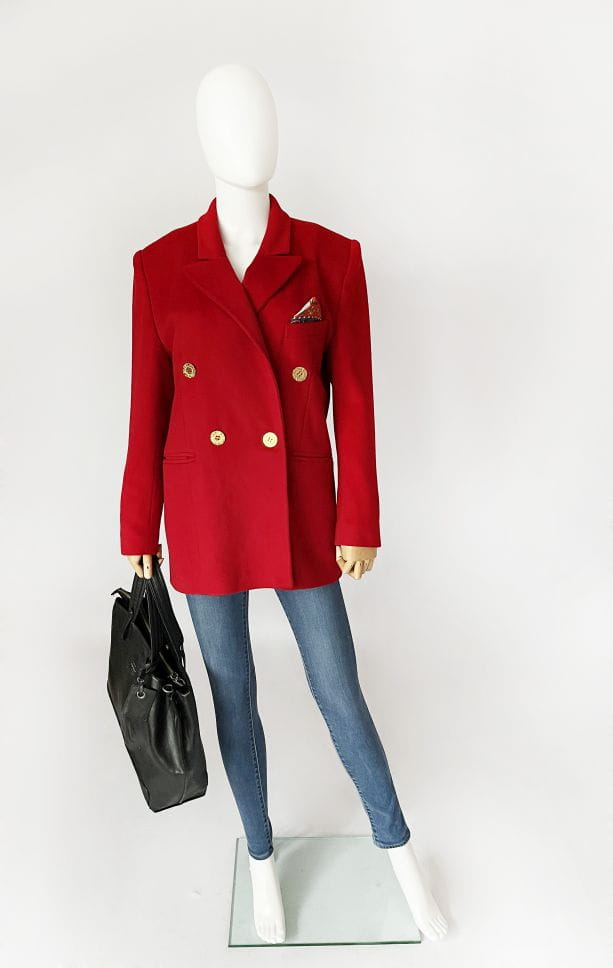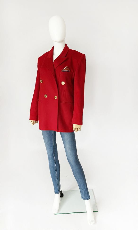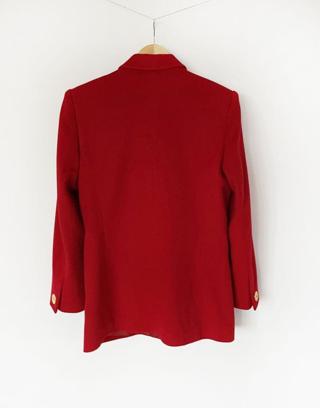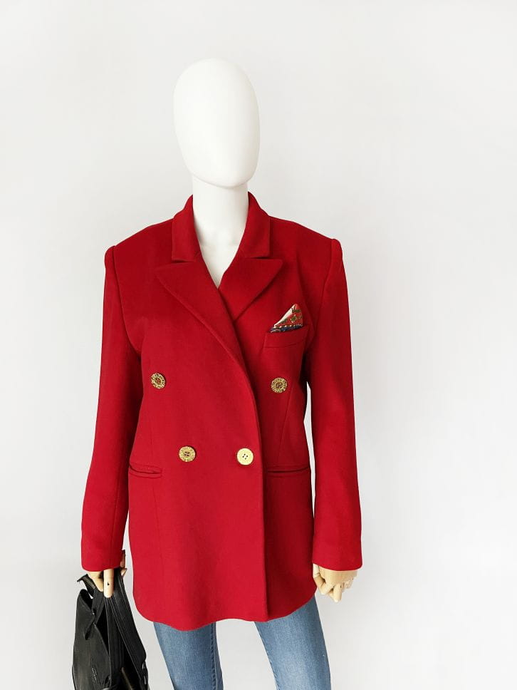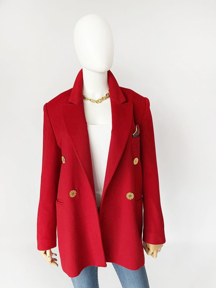 Wyjątkowy okaz vintage. Przepiękna marynarka francuskiej marki Piermont. Doskonała jakościowo: w składzie dwa rodzaje wełen i kaszmir. Tkanina jest bardzo zadbana i miękka. Czerwony twarzowy odcień doskonale współgra z eleganckim złotem guzików. Dwurzędowy model, stworzony z dbałością o każdy detal poczynając od logowanych guzików, kończąc na przepięknej podszewce, we wzór dzikich kaczek, która wygląda jak dzieła z pracowni Hermes. U dołu wsuwane kieszenie. U góry niewielka, z przepiękną poszetką. Pochodzi z lat 80/90.
