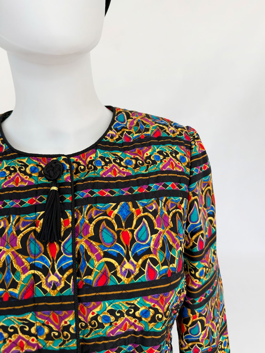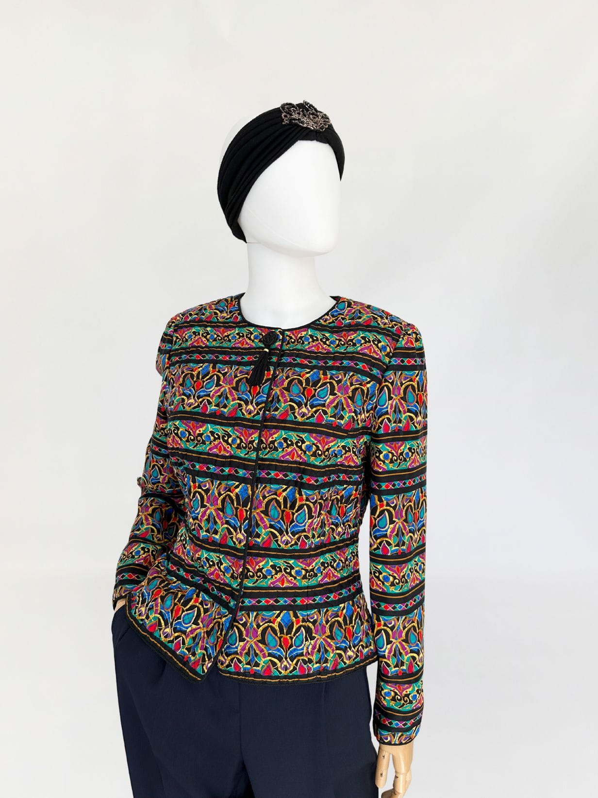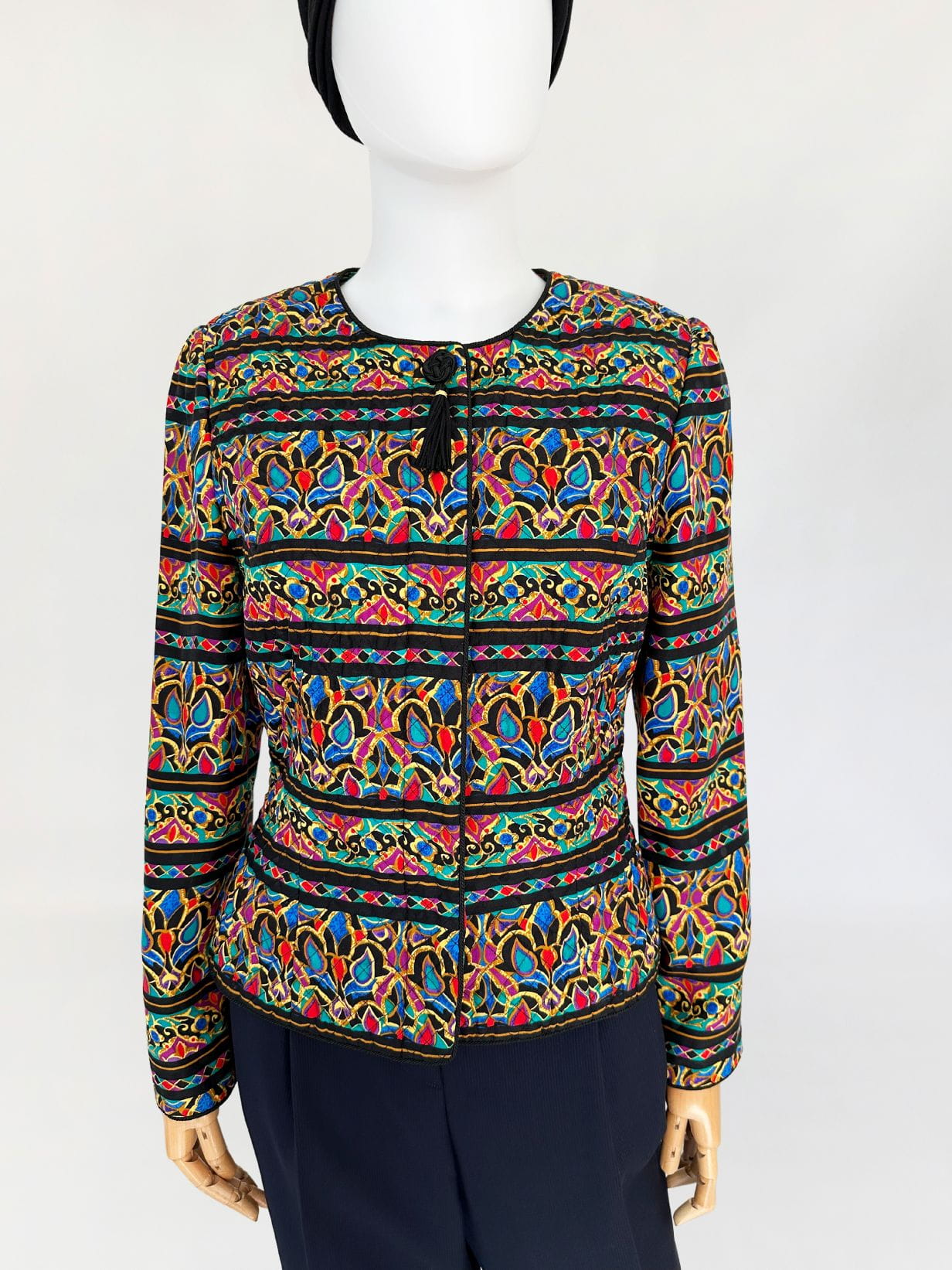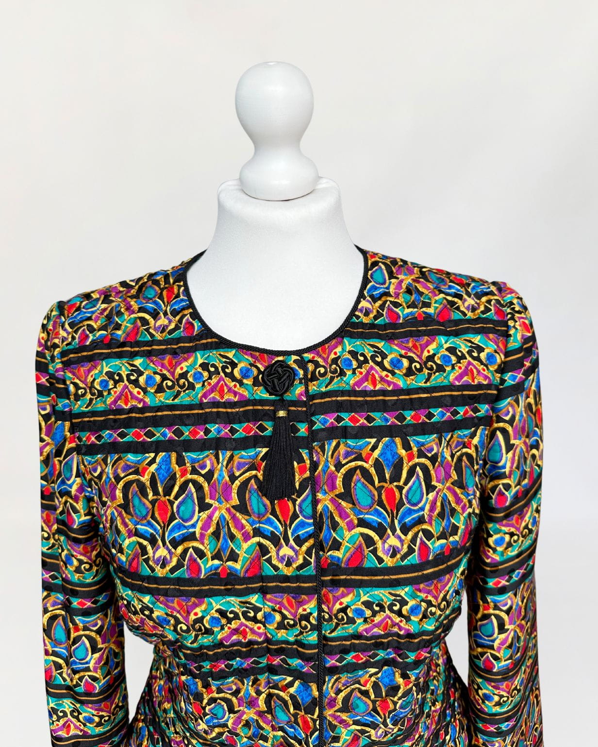 Lekka kurtka/żakiet true vintage o krótkim, dopasowanym fasonie. Wykonana z doskonałej jakości jedwabnej tkaniny w multikolorowe wzory. Leciutka, z pikowanym korpusem i długimi rękawami. Zapinana na guziki pod plisą maskującą. Orientalnego klimatu dodaje jej zapięcie dekoltu - na wzór szamerunku, z dekoracyjnym chwostem. Przepiękne wzornictwo w głębokich, nasyconych kolorach.