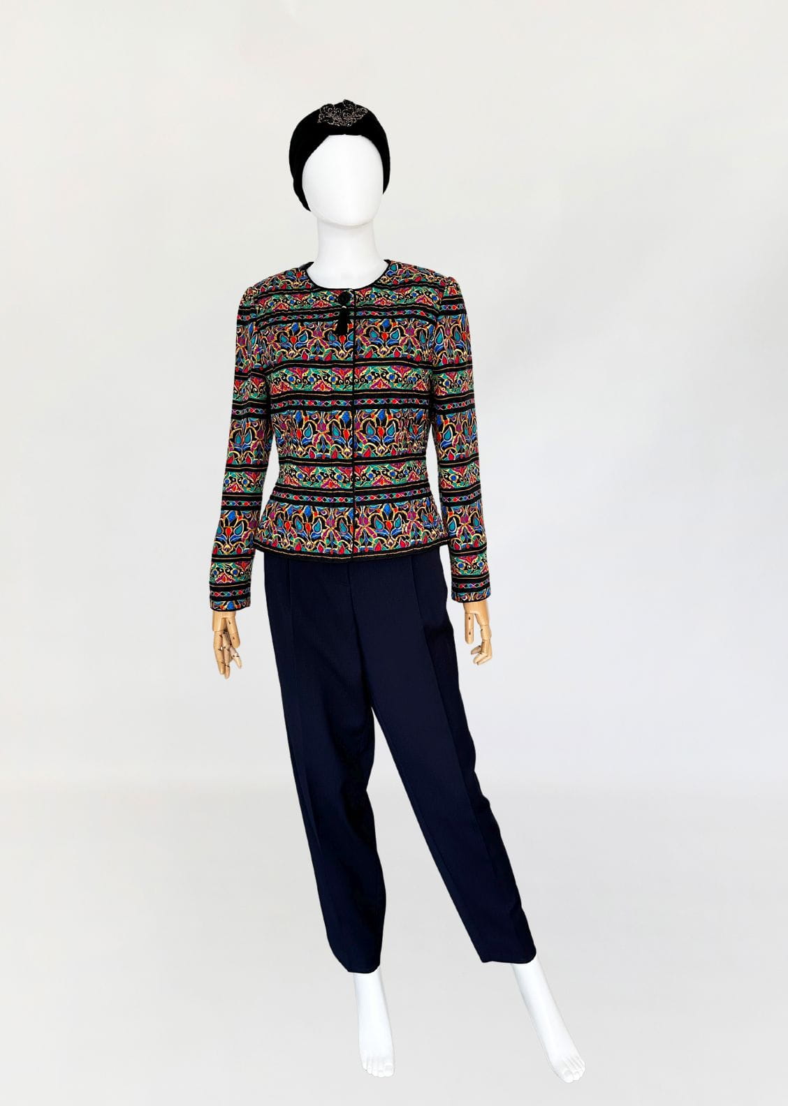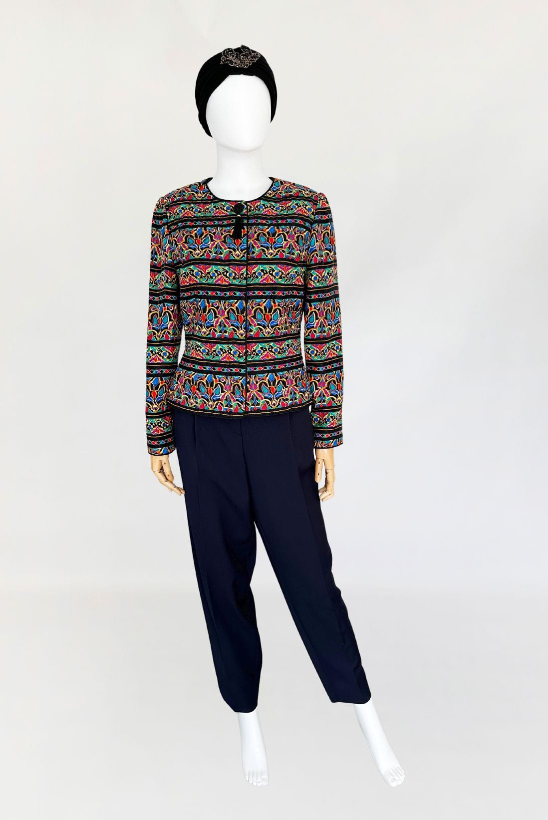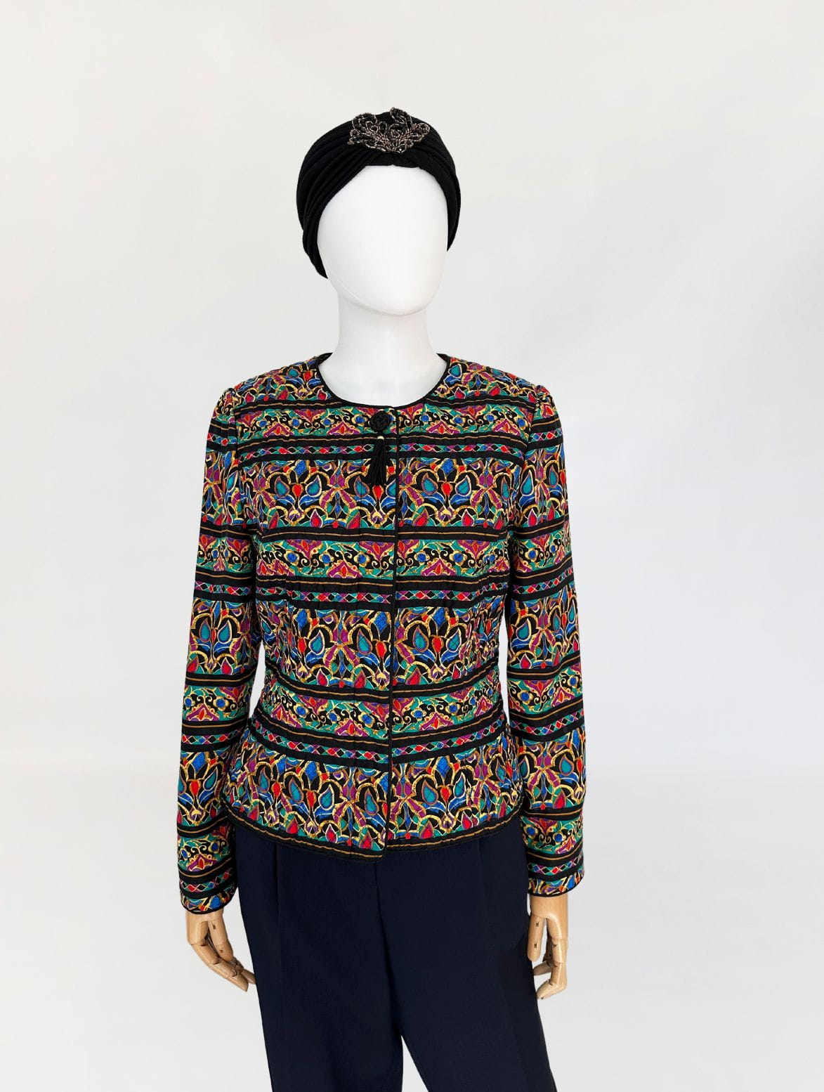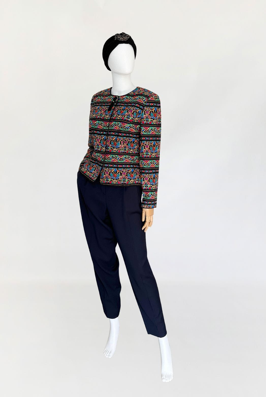 Lekka kurtka/żakiet true vintage o krótkim, dopasowanym fasonie. Wykonana z doskonałej jakości jedwabnej tkaniny w multikolorowe wzory. Leciutka, z pikowanym korpusem i długimi rękawami. Zapinana na guziki pod plisą maskującą. Orientalnego klimatu dodaje jej zapięcie dekoltu - na wzór szamerunku, z dekoracyjnym chwostem. Przepiękne wzornictwo w głębokich, nasyconych kolorach.