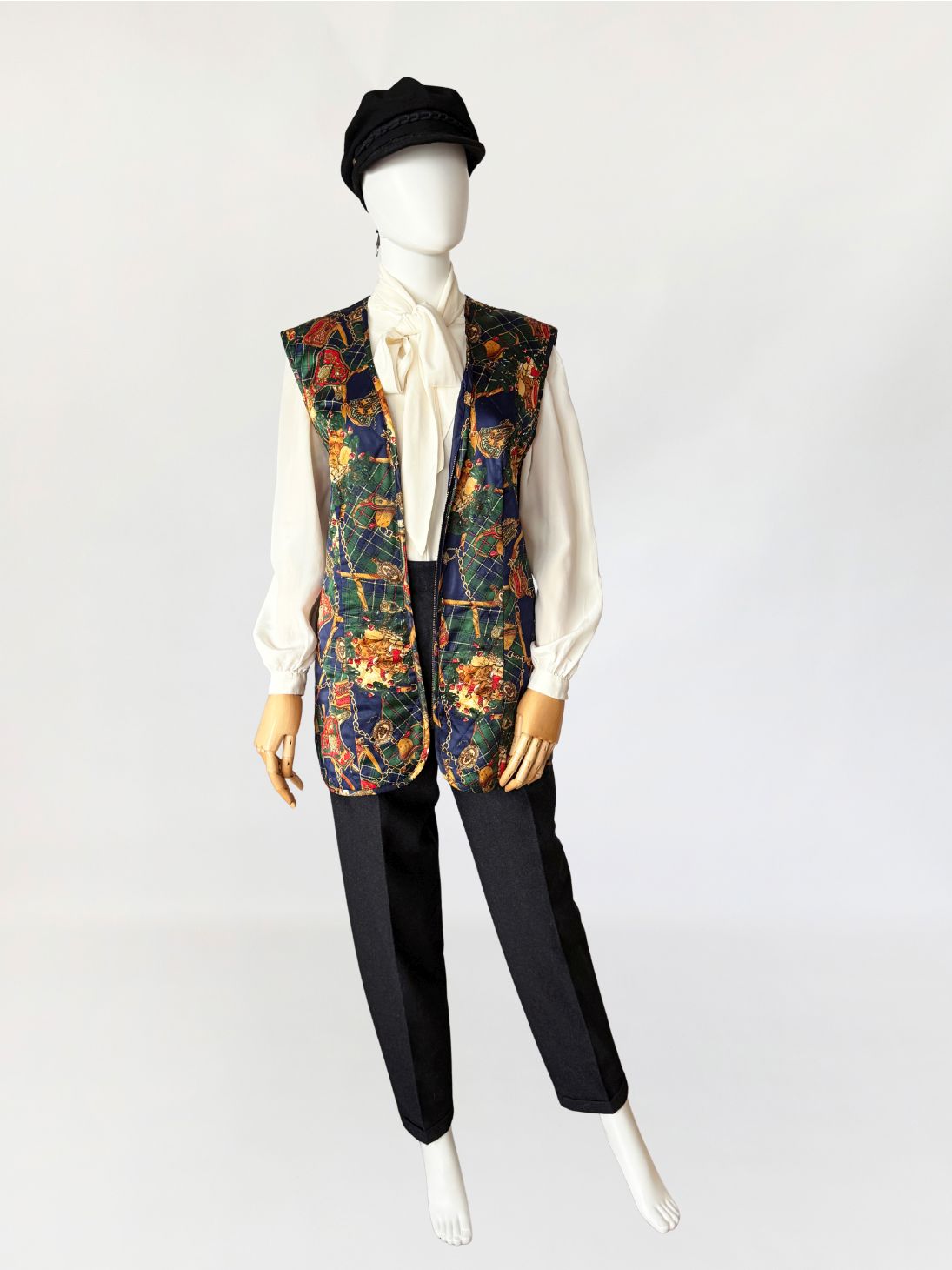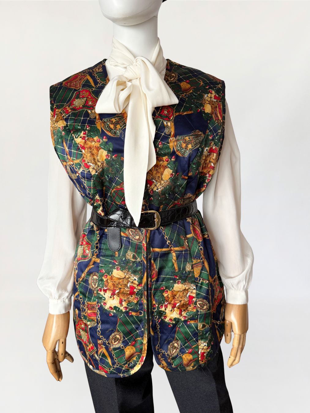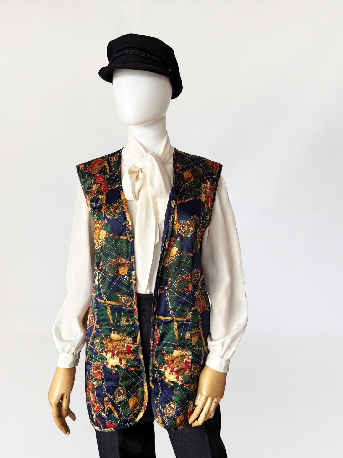 Kamizelka vintage z lat 80-tych wykonana z satynowej tkaniny w misterny wzór utrzymany w stylistyce equestrian baroque, łączącej motywy jeździeckie, szkocką kratę i dekoracyjny przepych. Na tle zielono-granatowej kraty tartanowej rozmieszczono ornamenty w formie złotych łańcuchów, uprzęży, medalionów i herbowych emblematów. Wśród nich pojawiają się motywy końskich uzd, siodeł, sprzączek i elementów rzemieniarskich, ozdobione detalami w odcieniach czerwieni, złota i ciepłego brązu. Fason prosty, lekko wydłużony, zapinany na zamek. Na całości przeszycia karo tworzące efekt pikowanua. Przeszycia w układzie rombów, tworzące efekt pikowania.