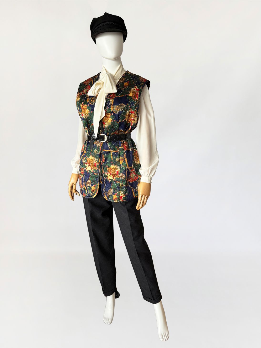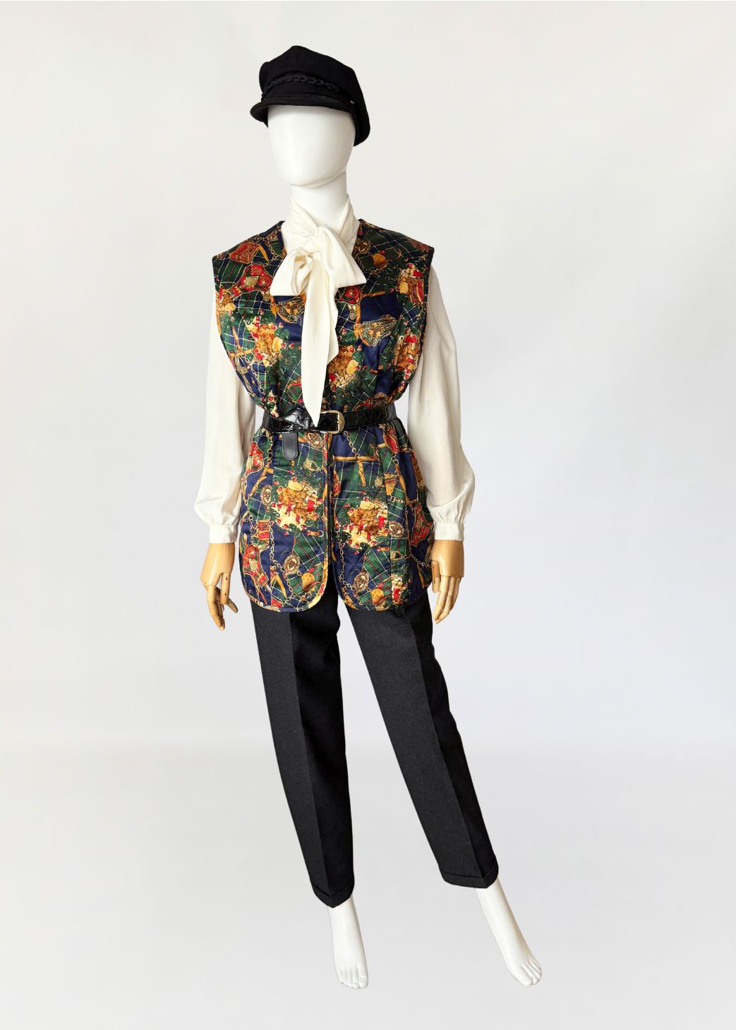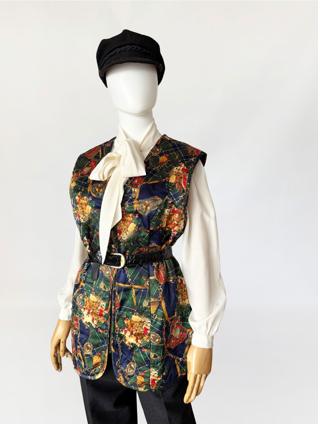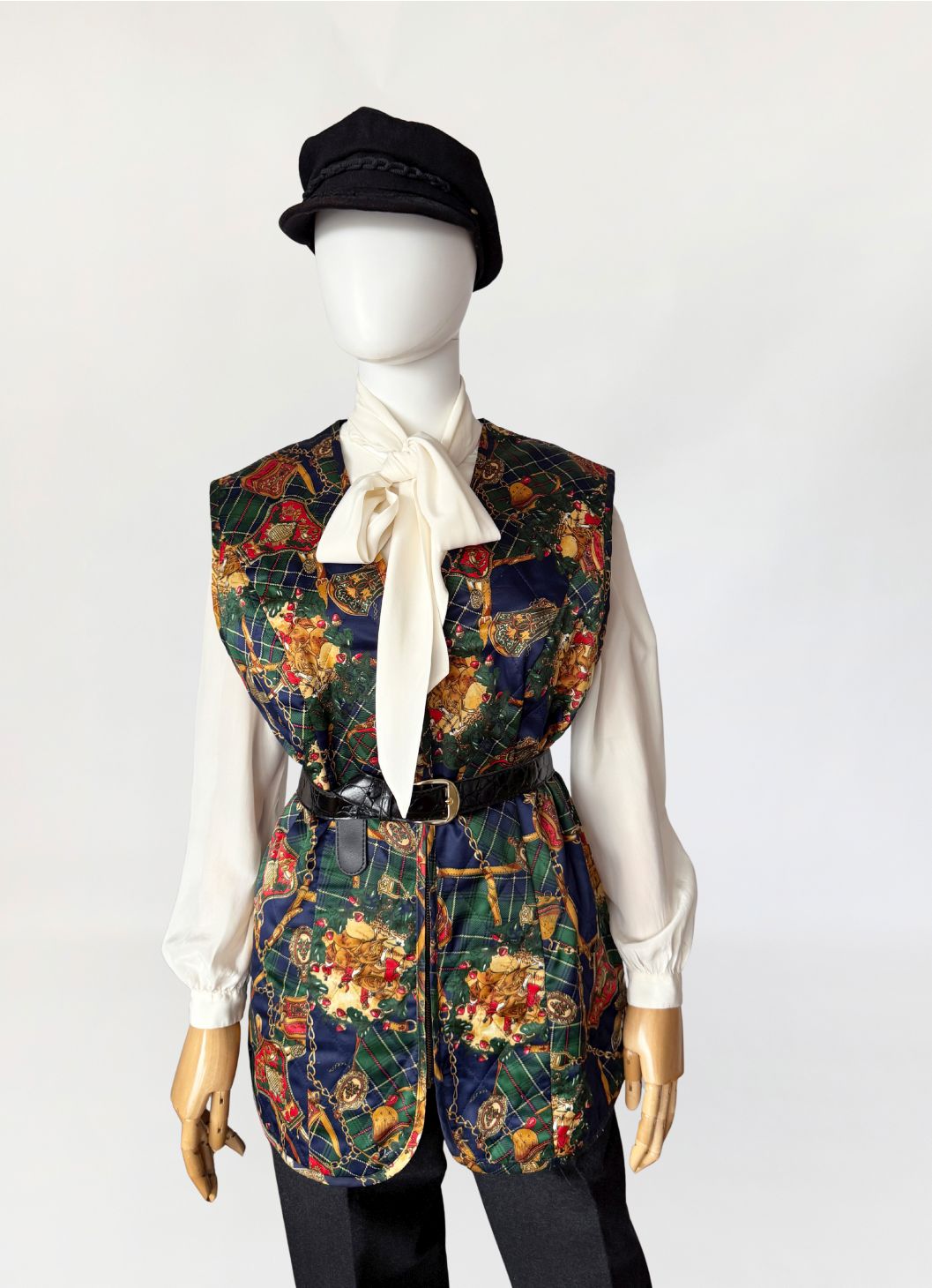 Kamizelka vintage z lat 80-tych wykonana z satynowej tkaniny w misterny wzór utrzymany w stylistyce equestrian baroque, łączącej motywy jeździeckie, szkocką kratę i dekoracyjny przepych. Na tle zielono-granatowej kraty tartanowej rozmieszczono ornamenty w formie złotych łańcuchów, uprzęży, medalionów i herbowych emblematów. Wśród nich pojawiają się motywy końskich uzd, siodeł, sprzączek i elementów rzemieniarskich, ozdobione detalami w odcieniach czerwieni, złota i ciepłego brązu. Fason prosty, lekko wydłużony, zapinany na zamek. Na całości przeszycia karo tworzące efekt pikowanua. Przeszycia w układzie rombów, tworzące efekt pikowania.