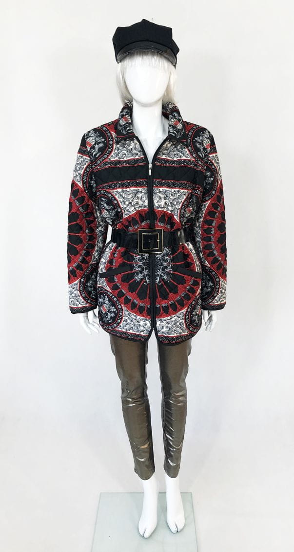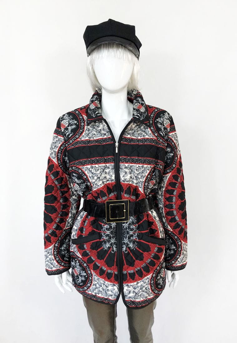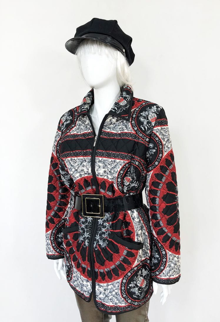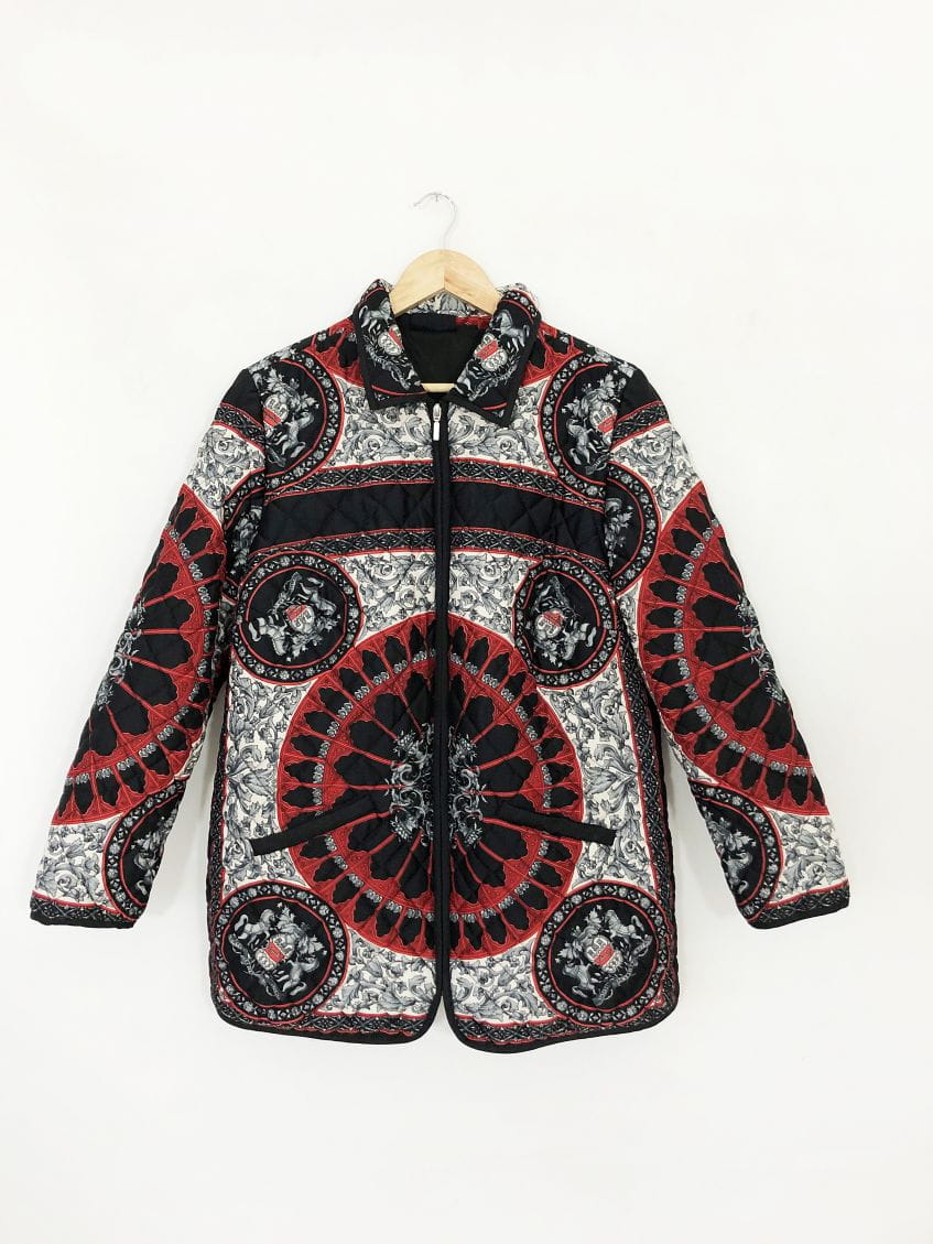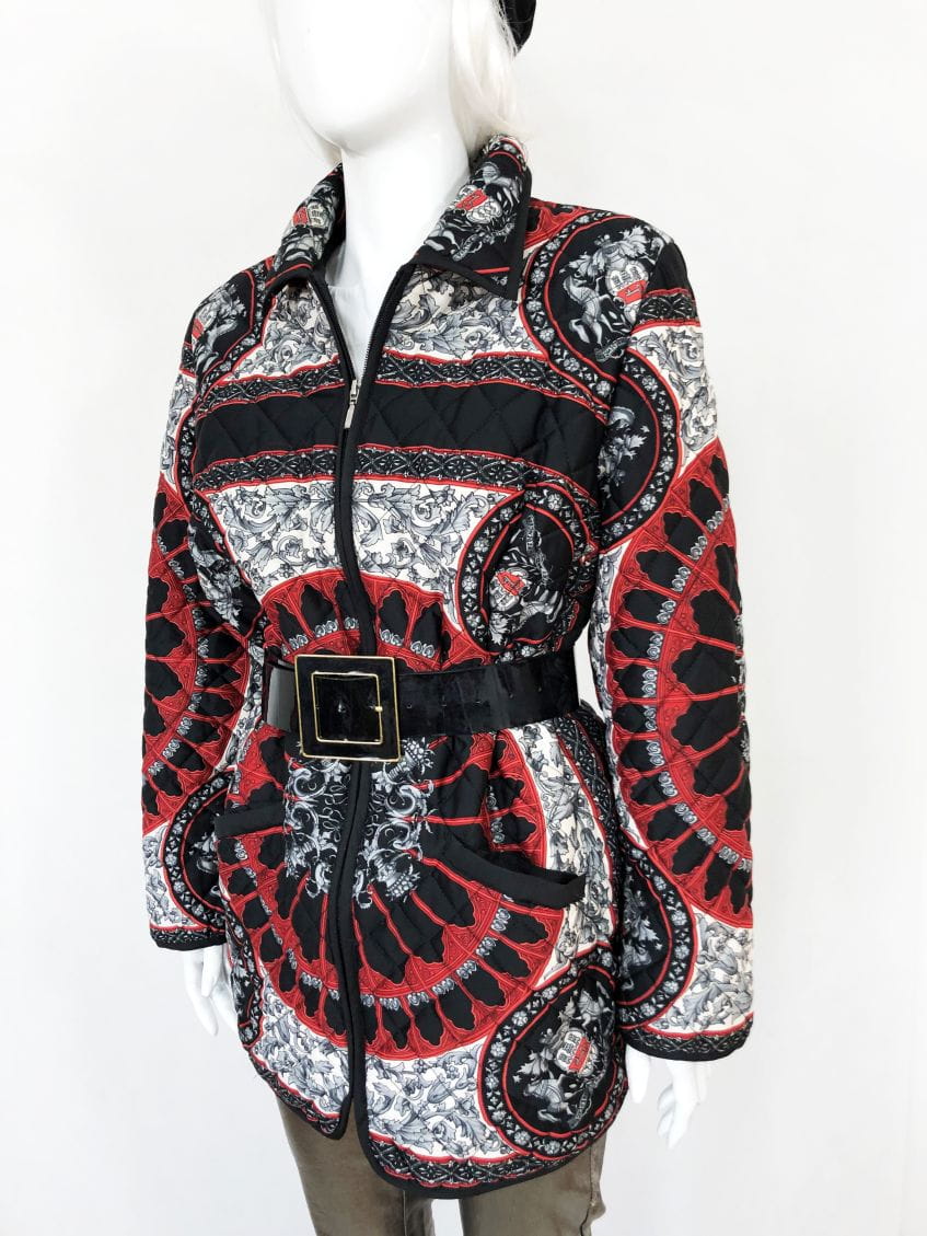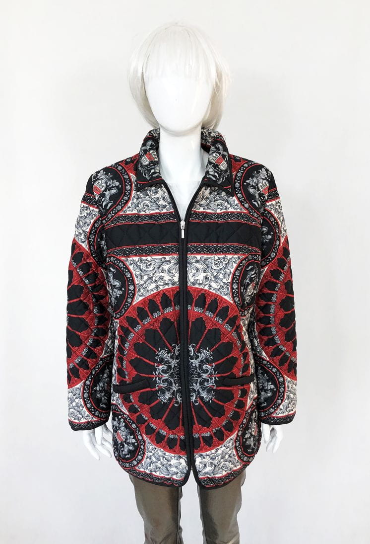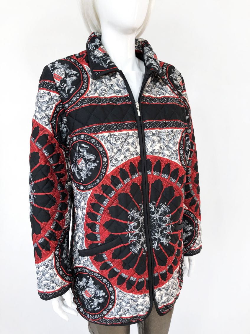 Lekka pikowana kurtka vintage we wzory w klimatach Hermes. Zasuwana na zamek. U góry kołnierz. Po bokach u dołu kieszenie.