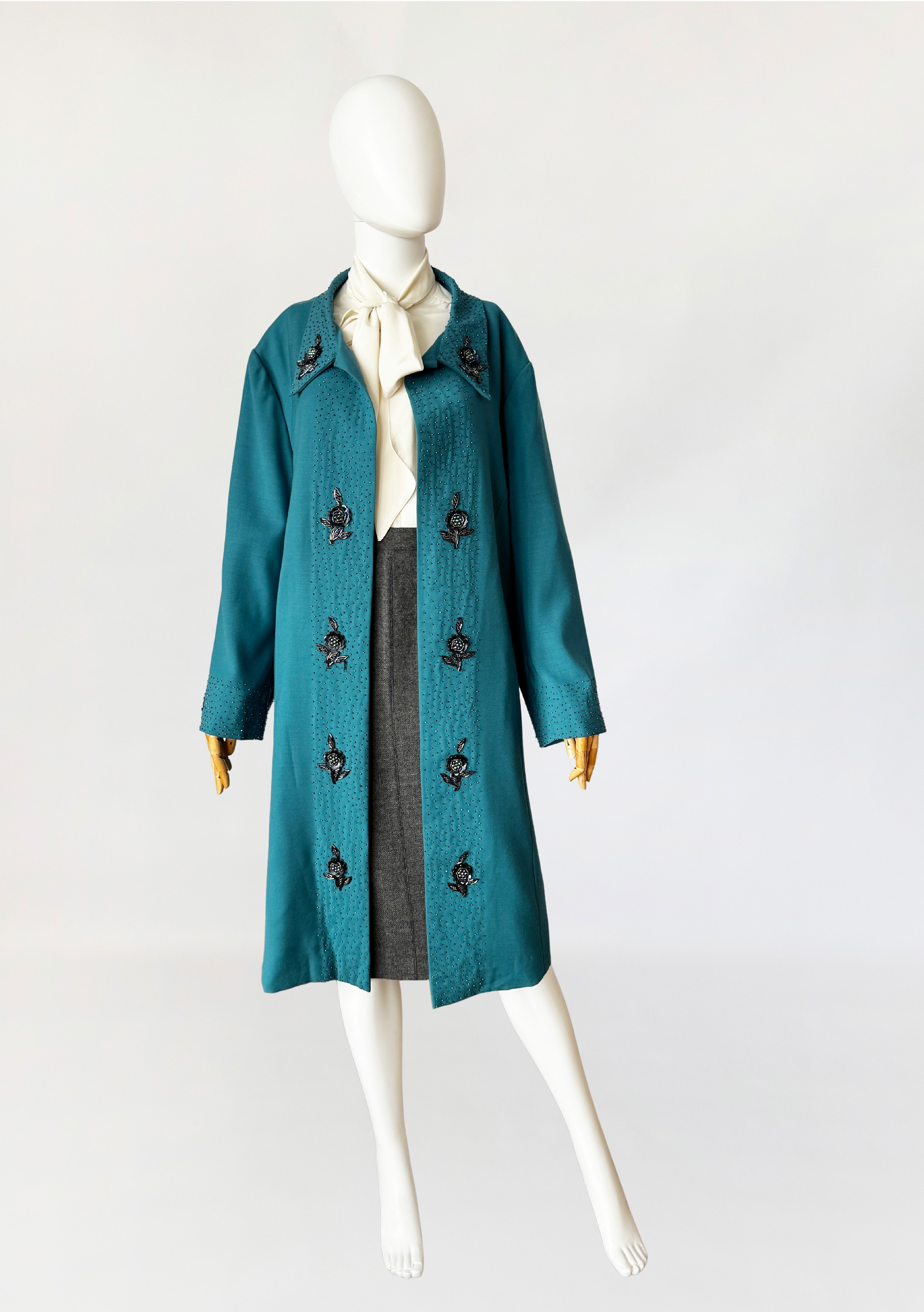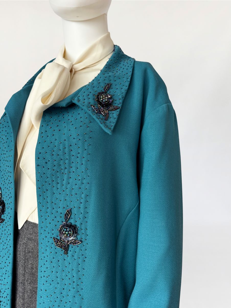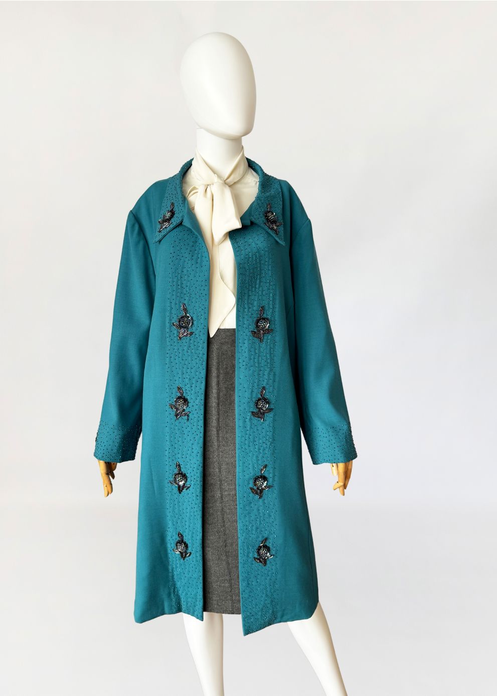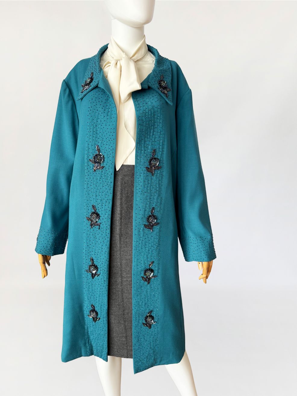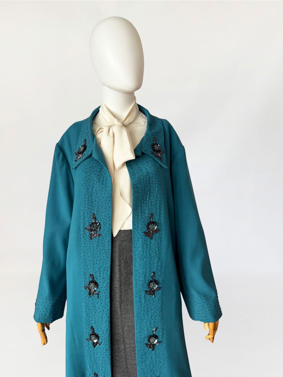 Lekki płaszcz, okrycie vintage z lat 60-tych wykonany z lekkiej wełnianej tkaniny. Model o fasonie open front, z długimi rękawami i klasycznym kołnierzem. Front bogato zdobionymi biżuteryjnymi aplikacjami rozmieszczonymi symetrycznie na całej długości. Tego samego typu zdobienia obecne na kołnierzu oraz mankietach. Tył gładki, z centralnym szwem konstrukcyjnym.