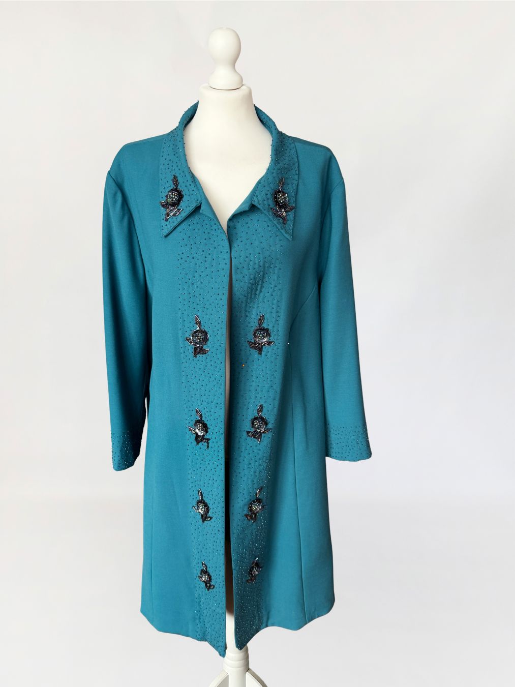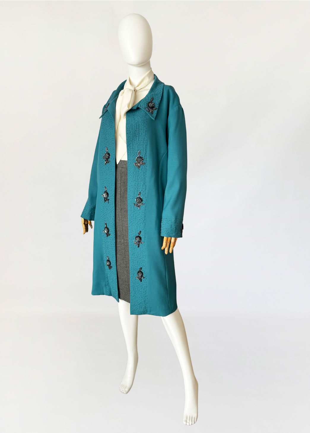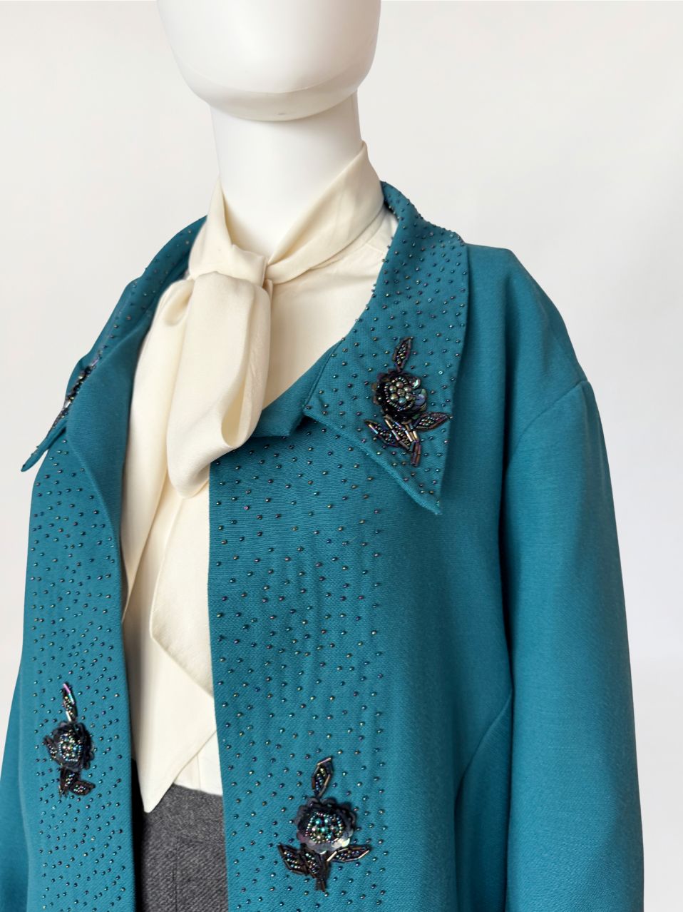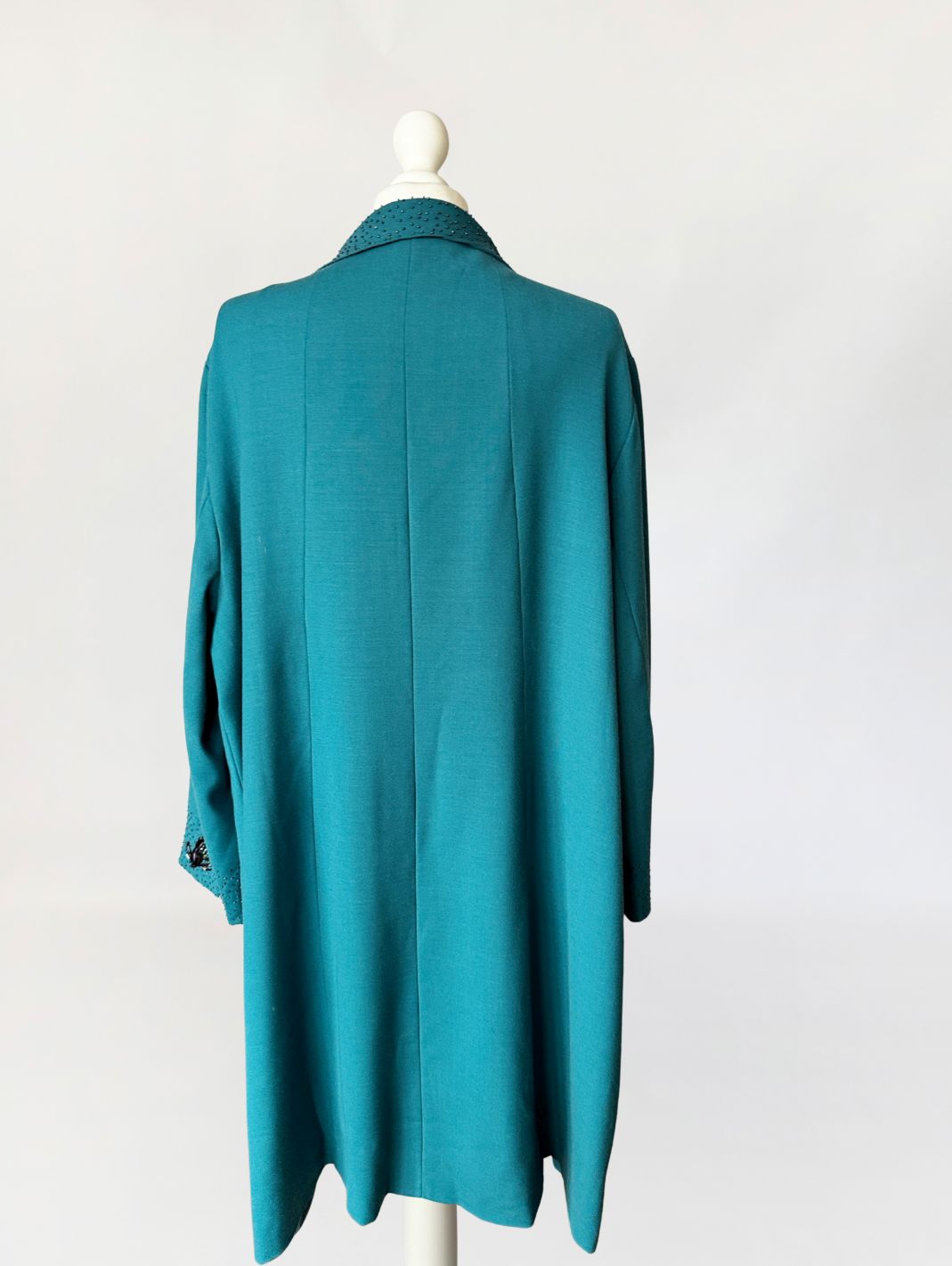 Lekki płaszcz, okrycie vintage z lat 60-tych wykonany z lekkiej wełnianej tkaniny. Model o fasonie open front, z długimi rękawami i klasycznym kołnierzem. Front bogato zdobionymi biżuteryjnymi aplikacjami rozmieszczonymi symetrycznie na całej długości. Tego samego typu zdobienia obecne na kołnierzu oraz mankietach. Tył gładki, z centralnym szwem konstrukcyjnym.