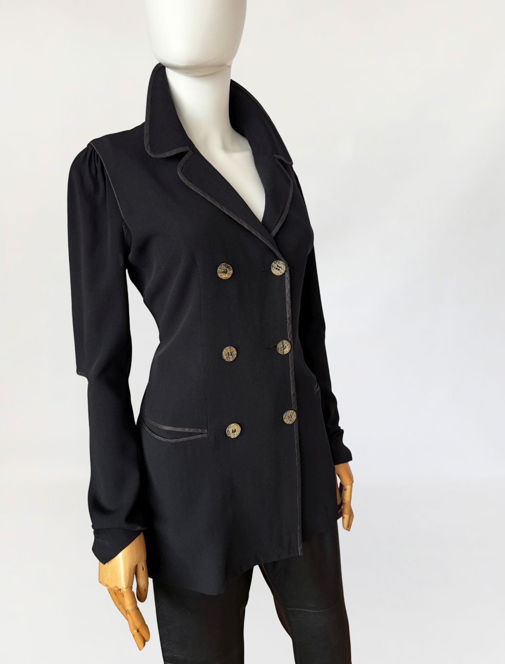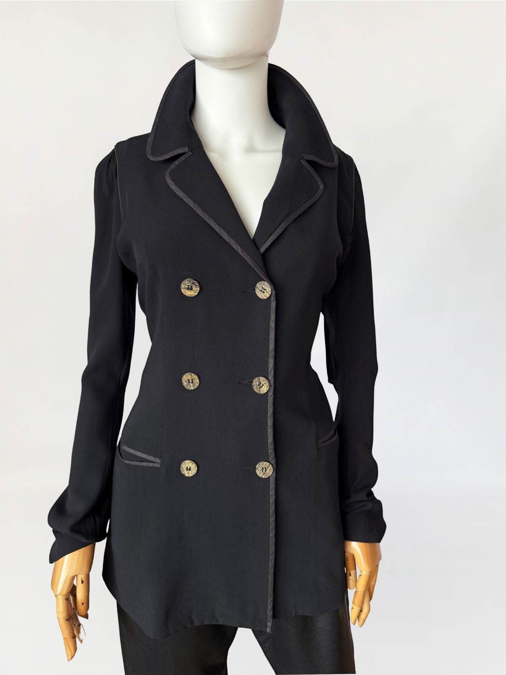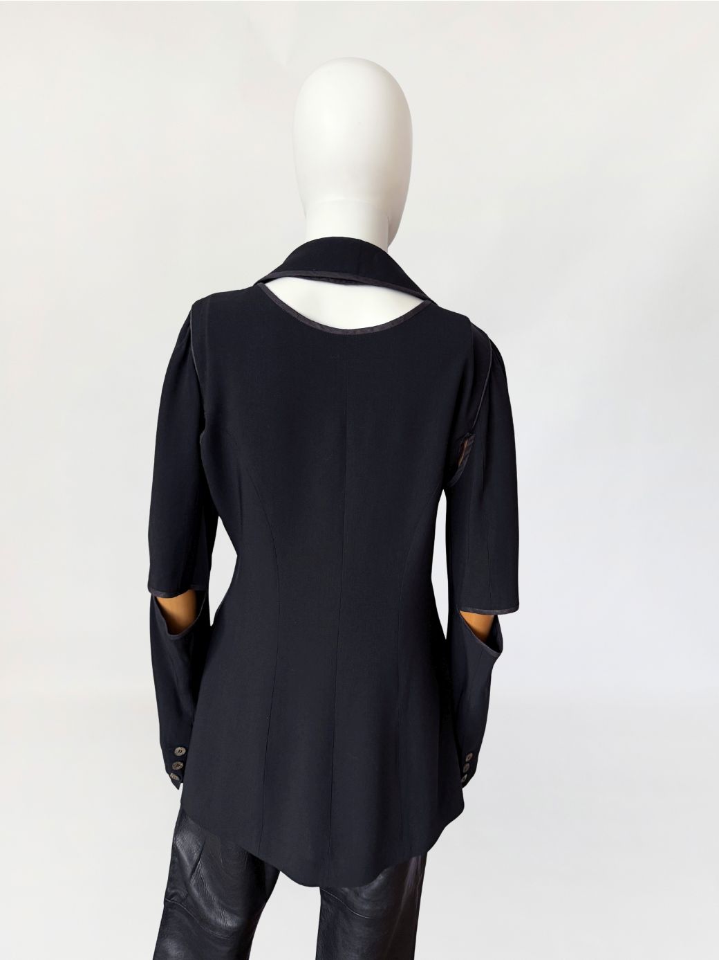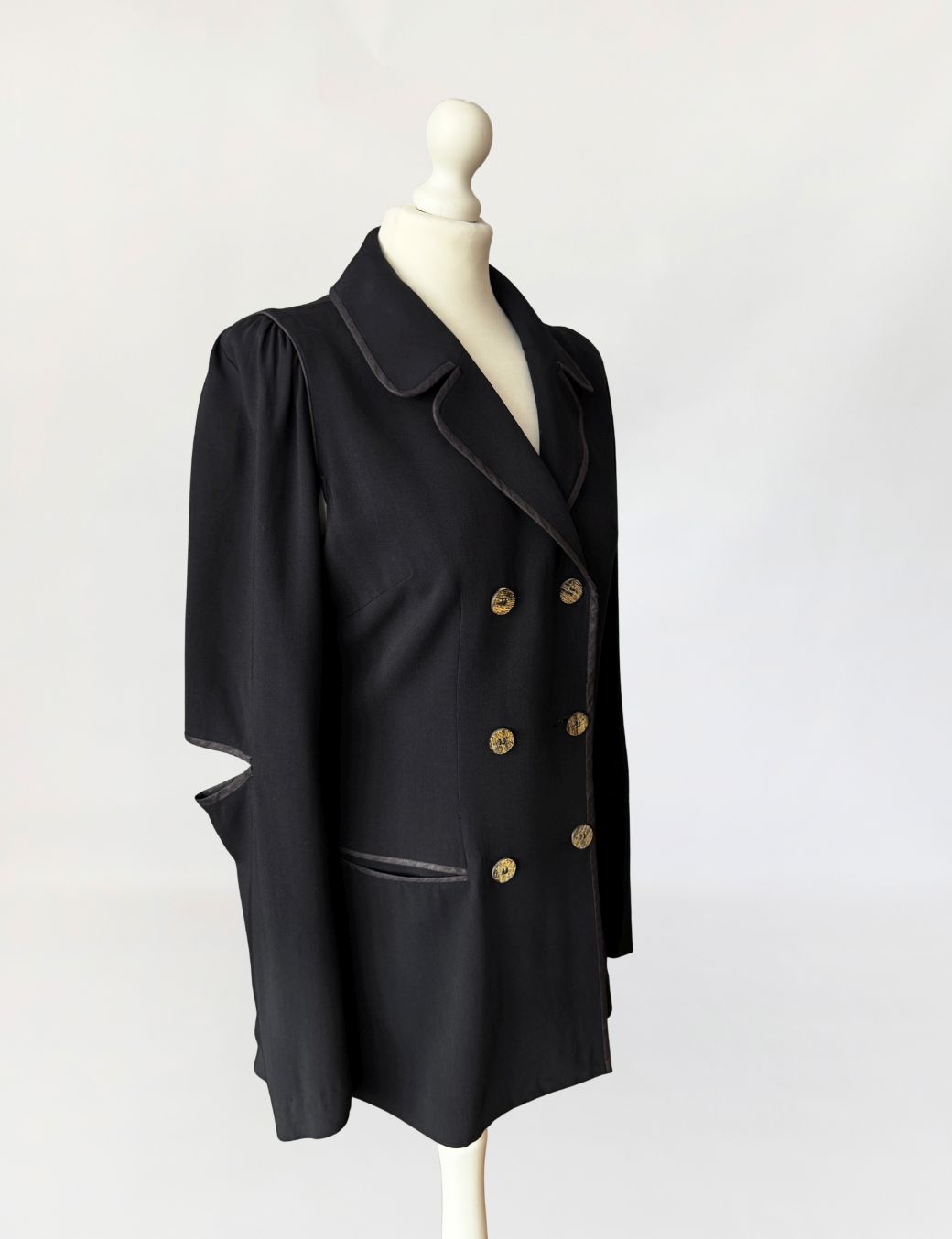 Marynarka vintage francuskiego domu mody Plein Sud. Ikoniczna marka, której estetyka i renoma ukształtowały się w latach 80-tych i 90-tych. Dziś oryginalne egzemplarze należą do rzadko spotykanych kolekcjonerskich pozycji. Wykonana z wełnianej w kolorze czarnym. Awangardowy model z konstrukcyjnymi wycięciami: na łokciach, pod pachami oraz na karku, odsłaniające fragmenty sylwetki i wpisane w formę marynarki. Fason taliowany, dwurzędowy, z kołnierzem rewersowym wykończonym kontrastową lamówką. Długie rękawy, klasycznie wszyte, z guzikami przy mankietach. Tył z pionowymi cięciami modelującymi i centralnym szwem.