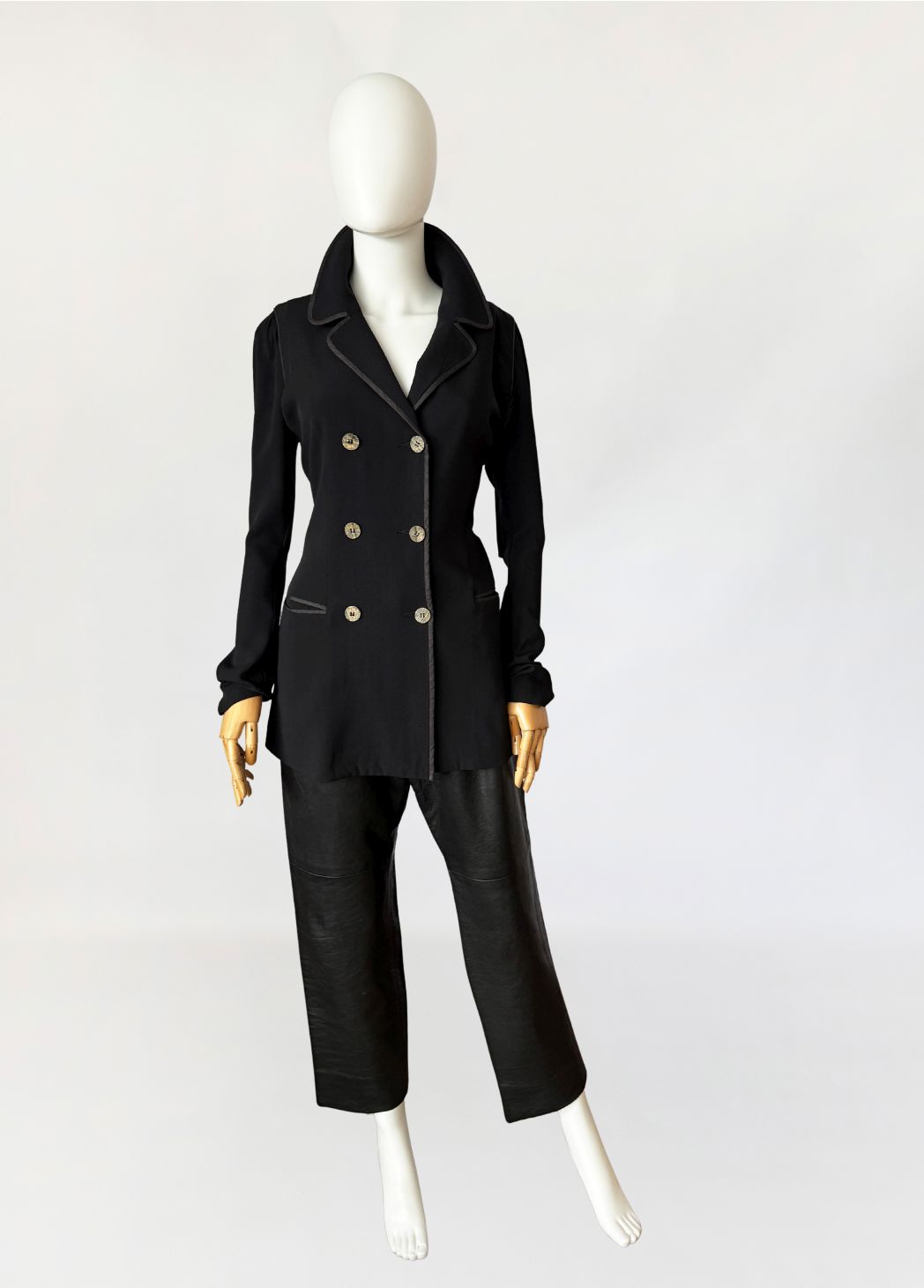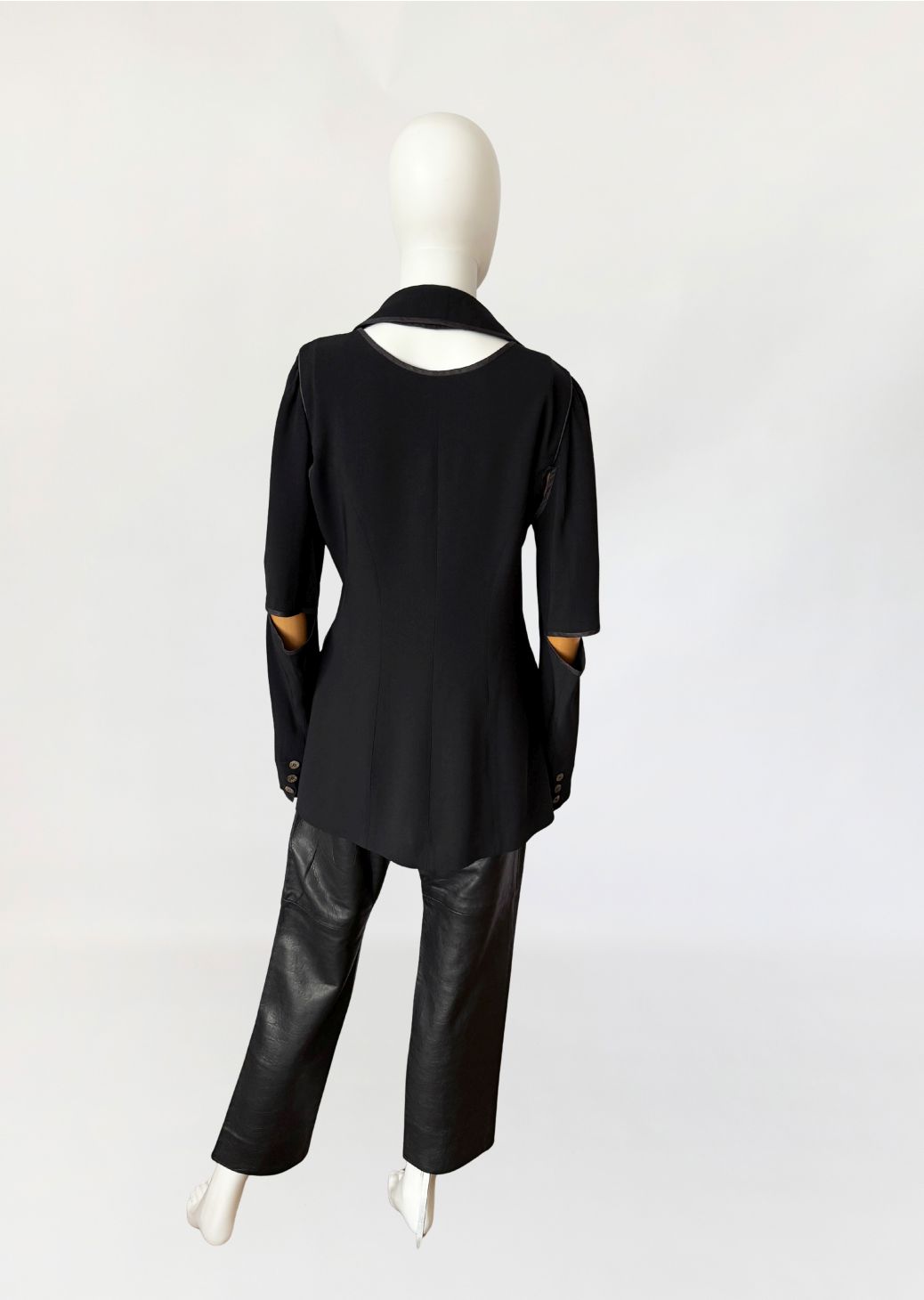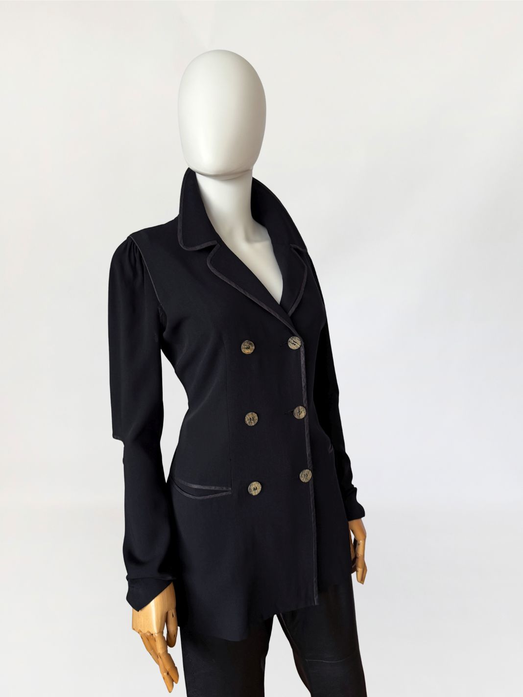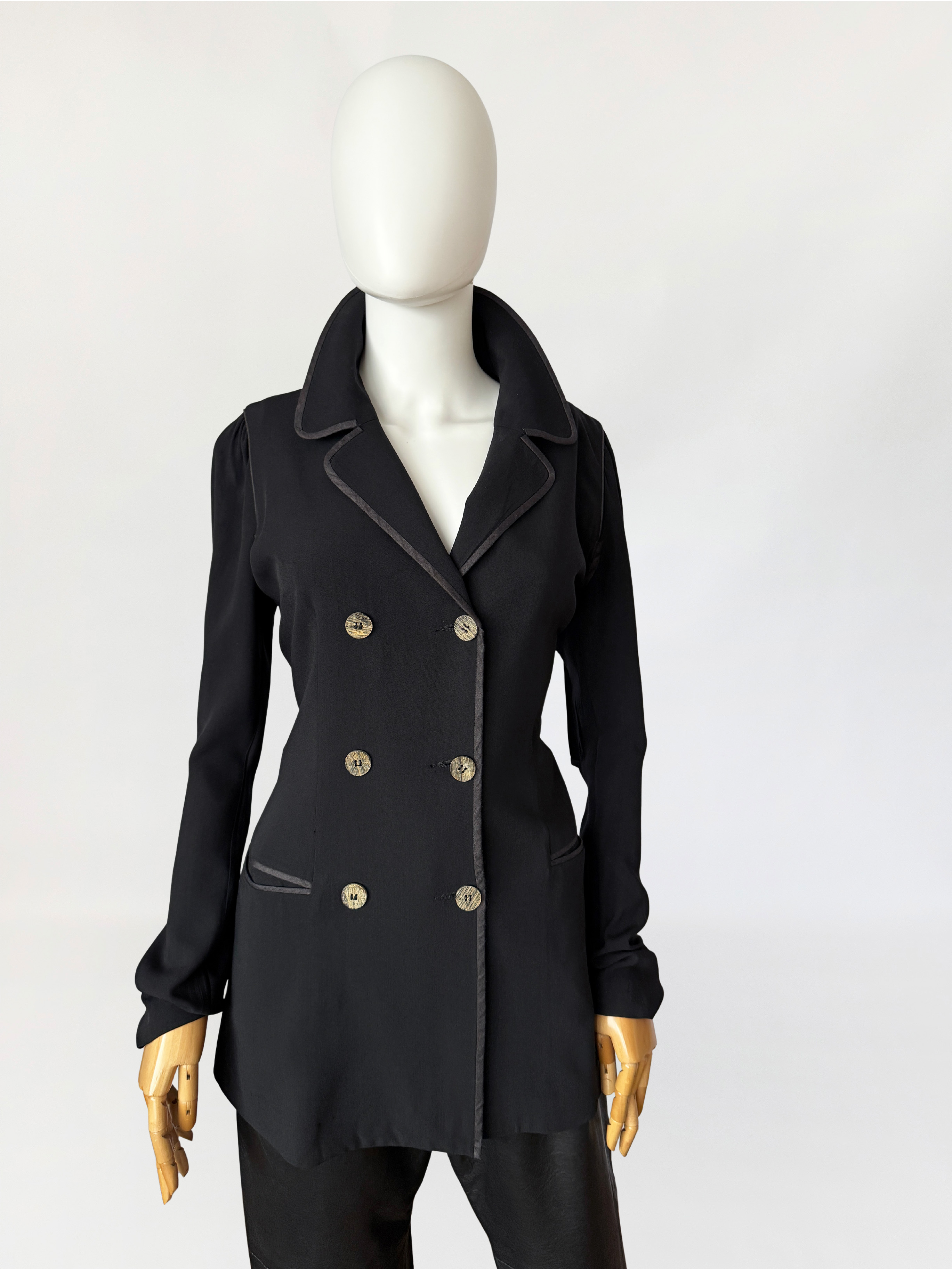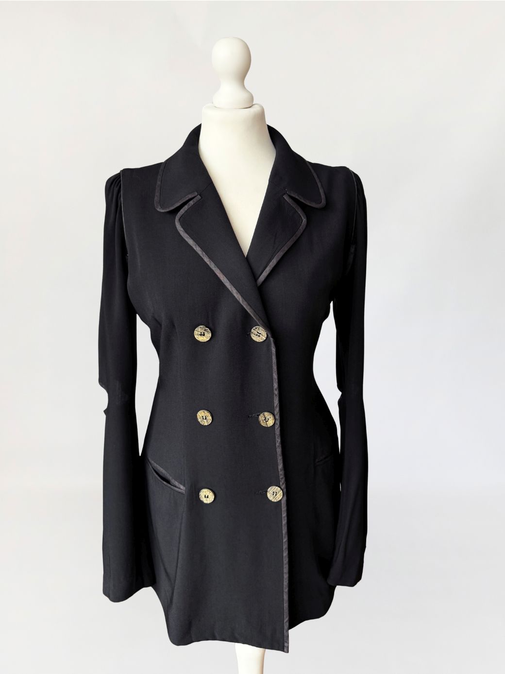 Marynarka vintage francuskiego domu mody Plein Sud. Ikoniczna marka, której estetyka i renoma ukształtowały się w latach 80-tych i 90-tych. Dziś oryginalne egzemplarze należą do rzadko spotykanych kolekcjonerskich pozycji. Wykonana z wełnianej w kolorze czarnym. Awangardowy model z konstrukcyjnymi wycięciami: na łokciach, pod pachami oraz na karku, odsłaniające fragmenty sylwetki i wpisane w formę marynarki. Fason taliowany, dwurzędowy, z kołnierzem rewersowym wykończonym kontrastową lamówką. Długie rękawy, klasycznie wszyte, z guzikami przy mankietach. Tył z pionowymi cięciami modelującymi i centralnym szwem.