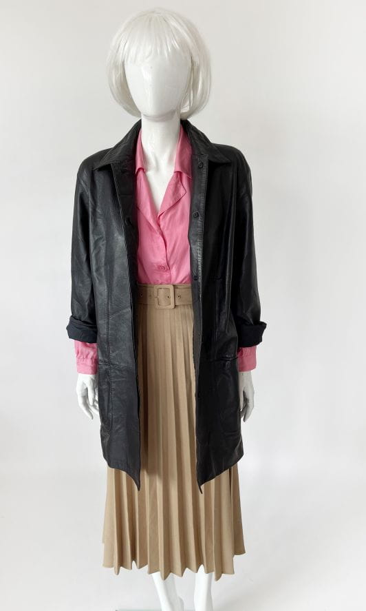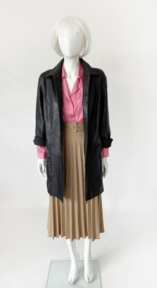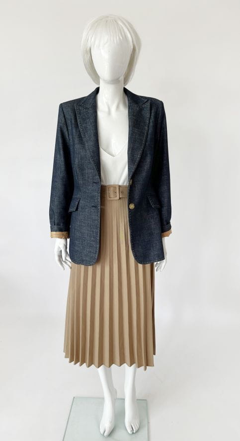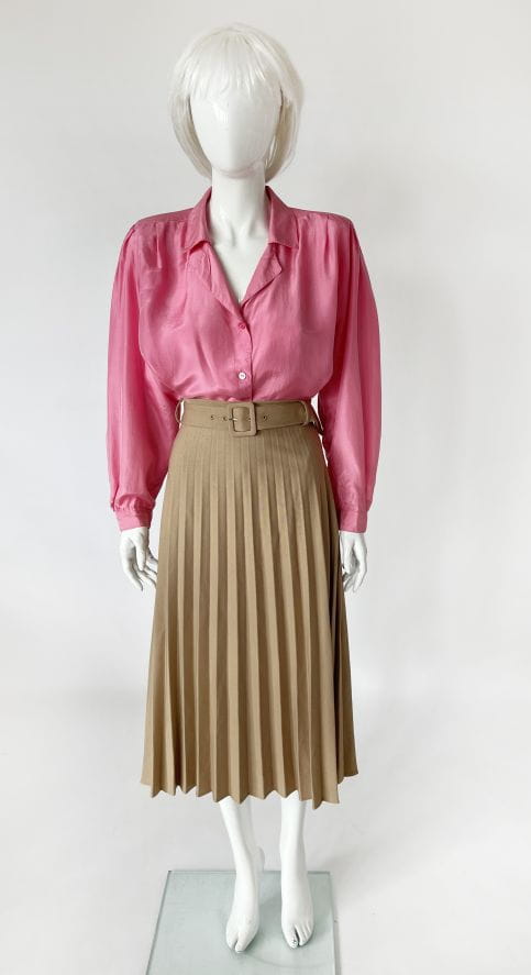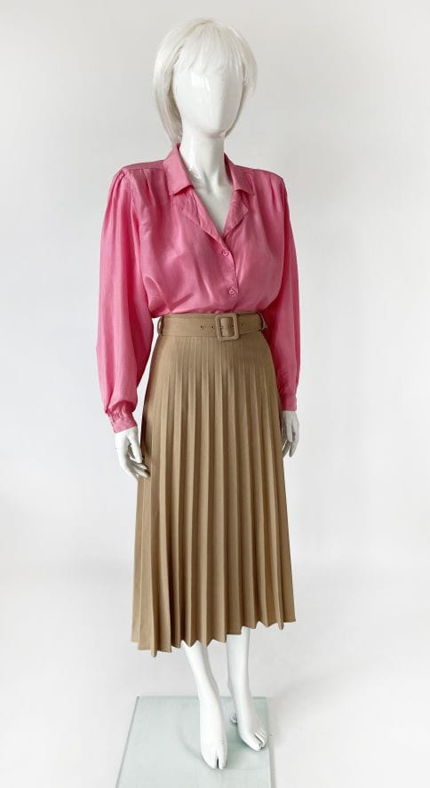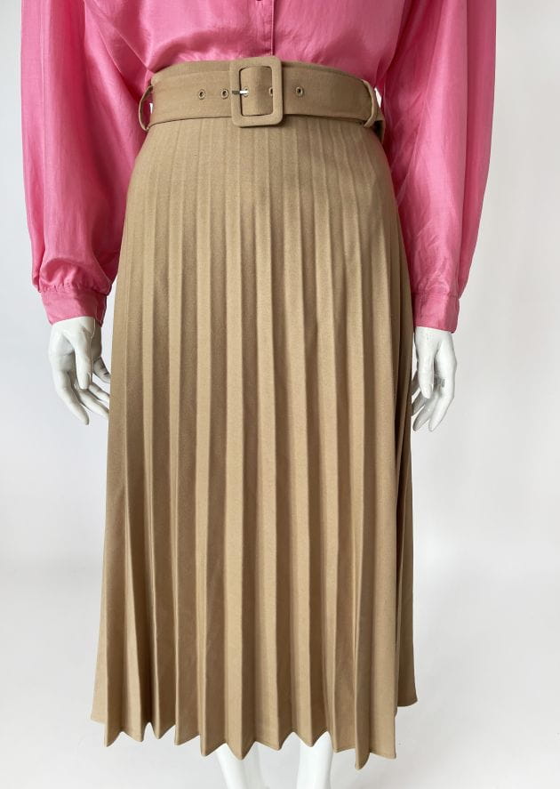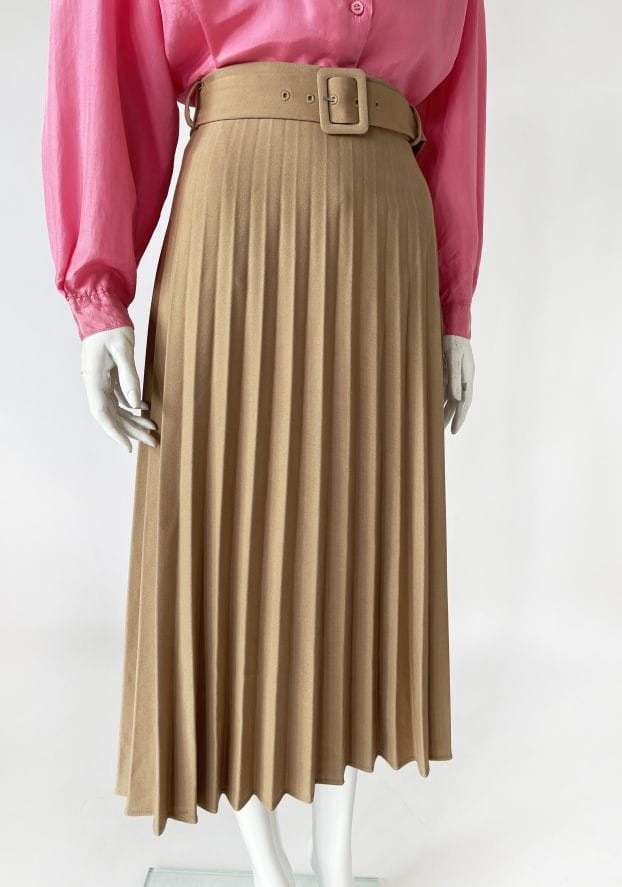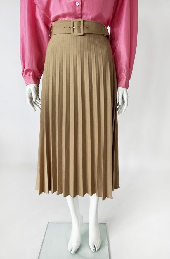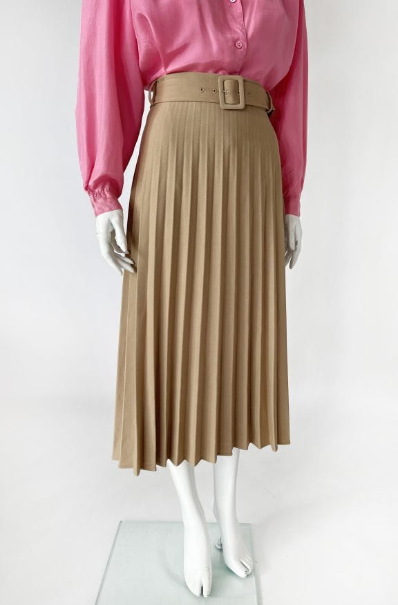 Plisowana spódnica midi w kolorze beżowym. W komplecie pasek. Nie ma podszewki.