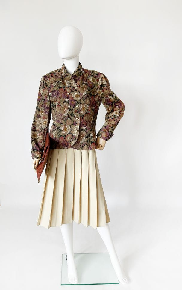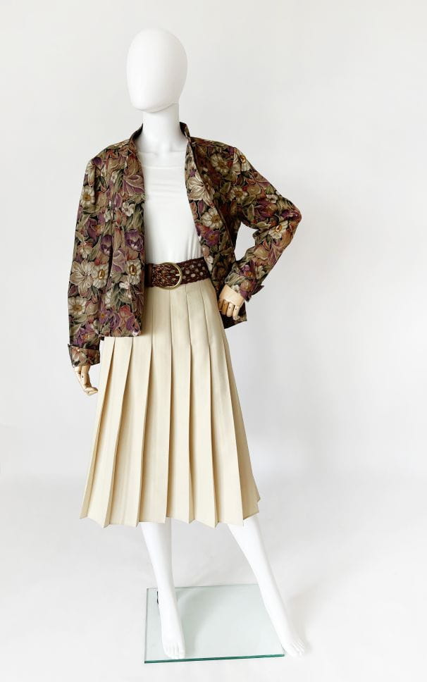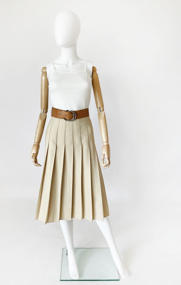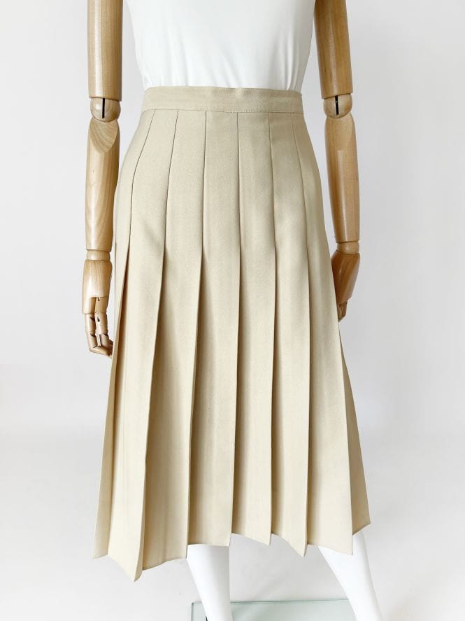 Plisowana spódnica vintage wykonana ze sztywniejszej tkaniny w kolorze piaskowym. Trapezowy fason o długości midi. Model z podszewką.