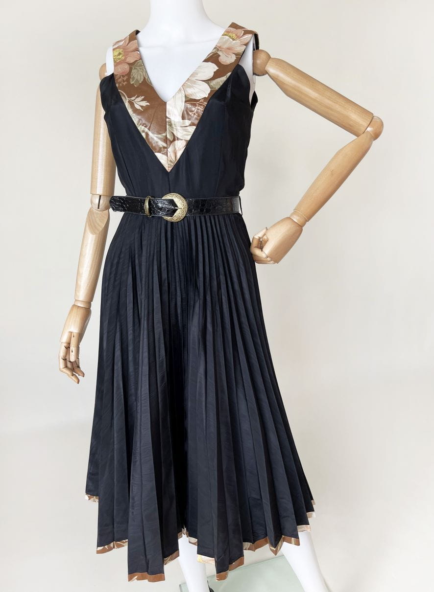 Sukienka Bridget of Strawberry Studio vintage z lat 70-tych. Dopasowana góra z kwiatową wstawką na ramiączkach i dekolcie. Odcinana w talii, dół rozłożysty, gęsto plisowany. Tkanina jest lekka, ale sztywna dzięki czemu doskonale utrzymuje fason. Pasek nie jest elementem kompletu.