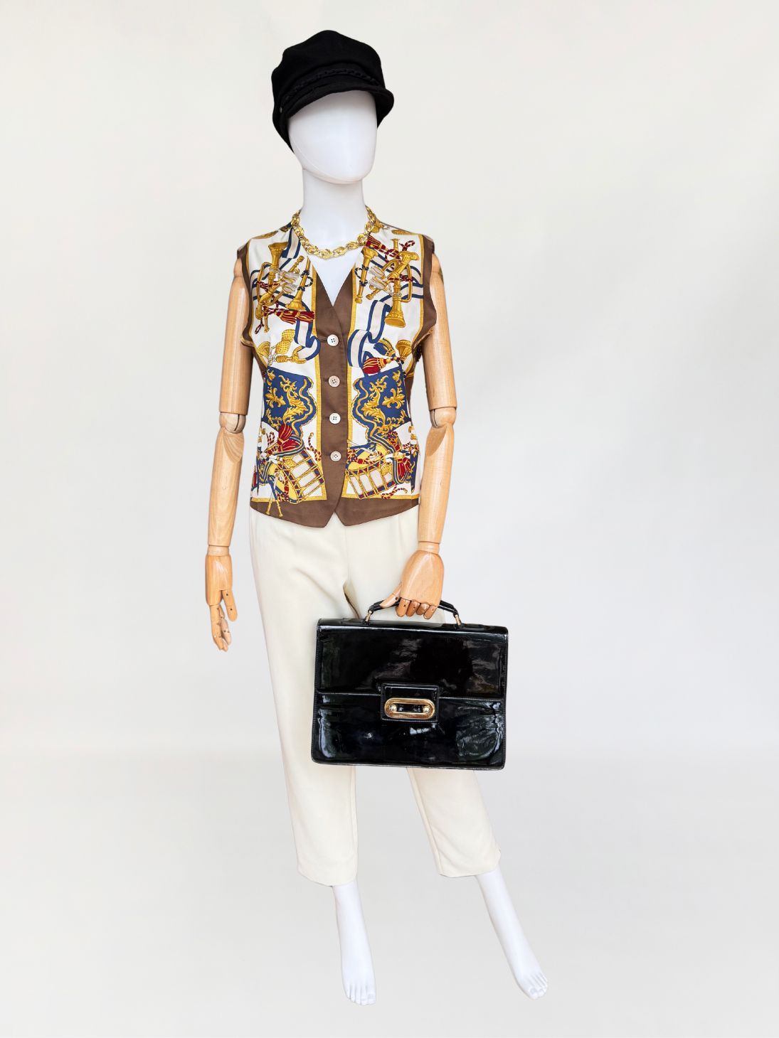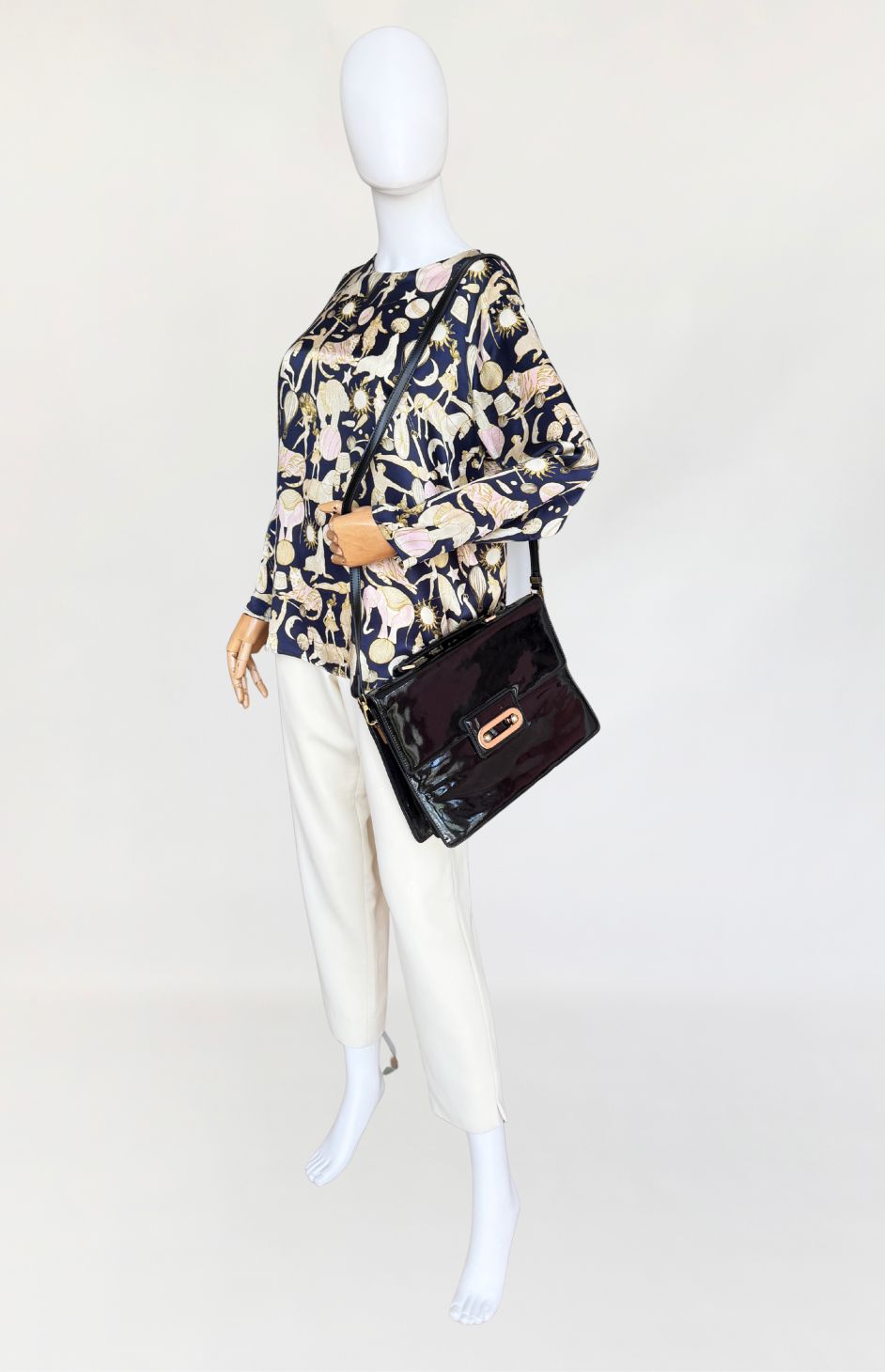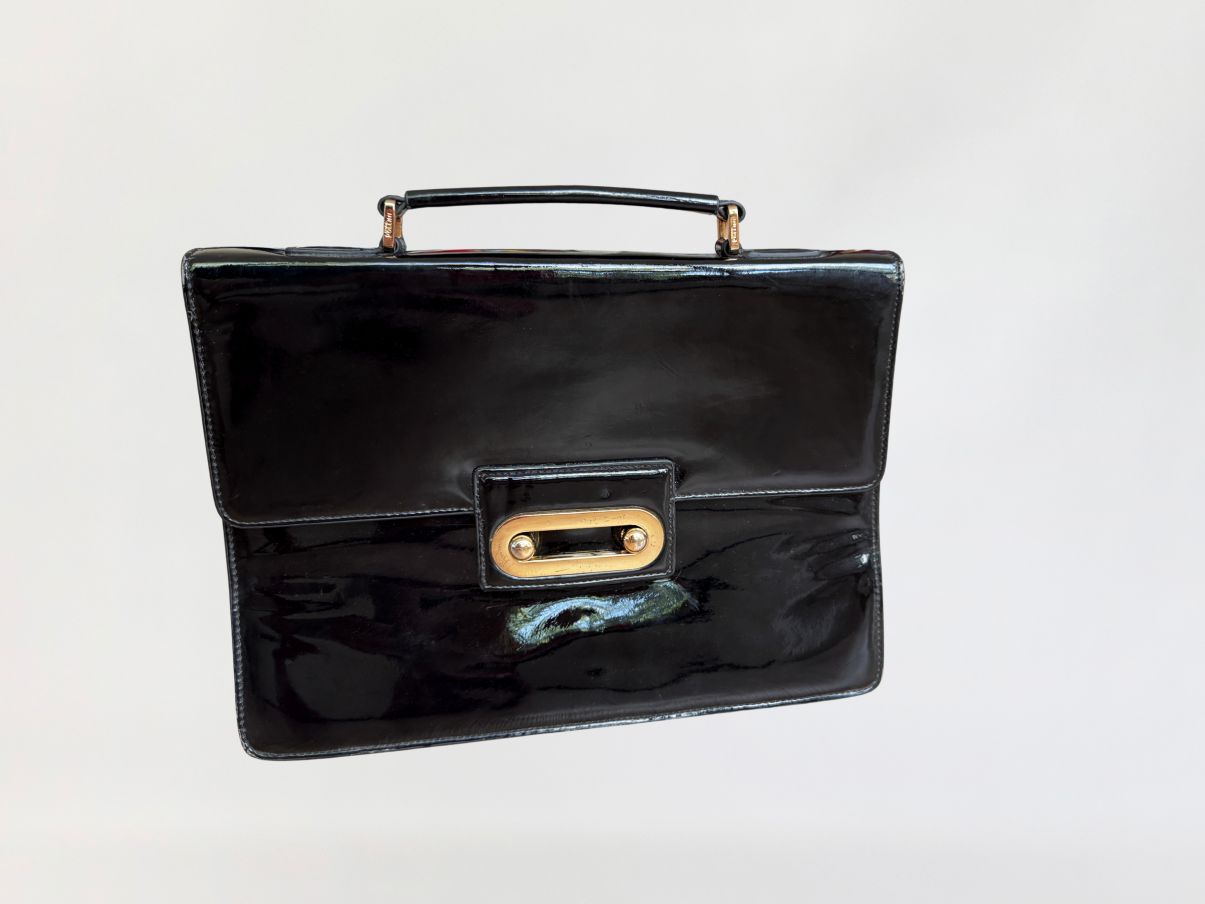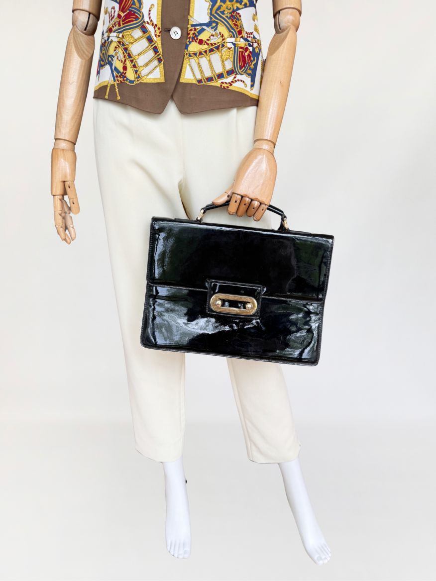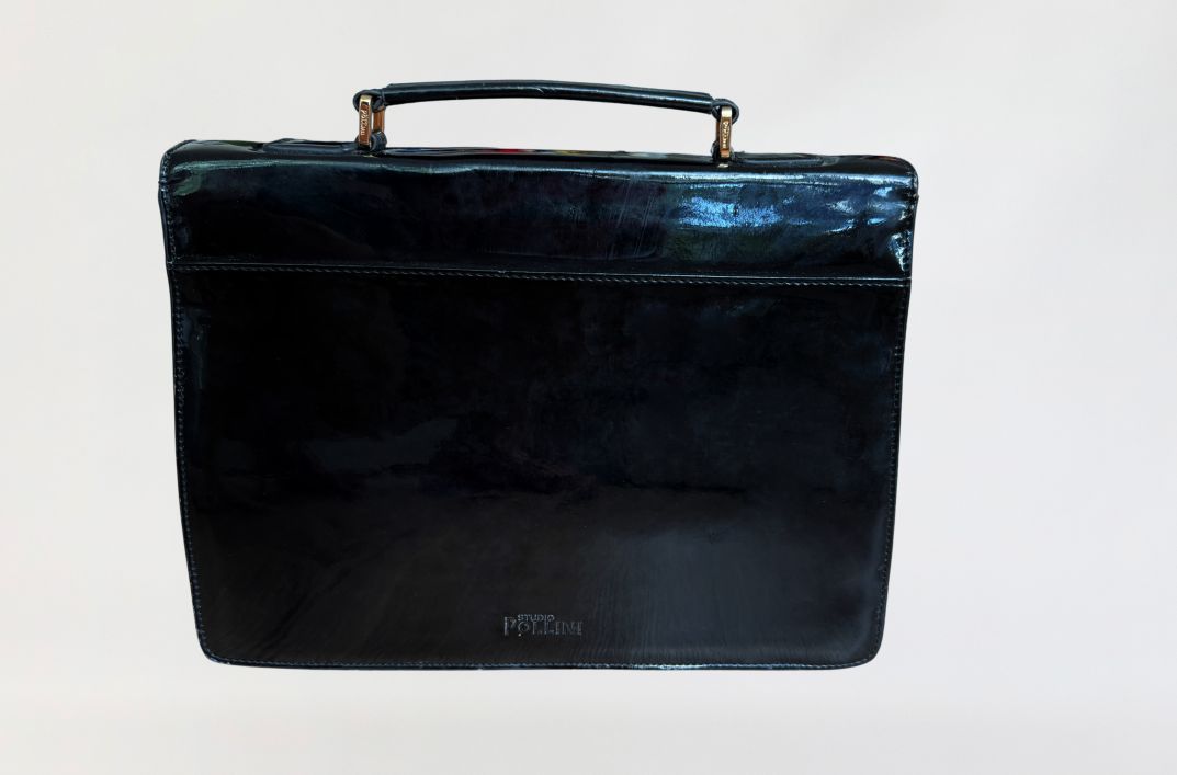 Włoska torba typu teczka luksusowej marki Pollini. Wykonana z naturalnej lakierowanej skóry w klasycznym czarnym kolorze. Model o eleganckiej, usztywnianej konstrukcji, z metalowymi okuciami w złotym kolorze. Pojemne wnętrze z dwiema głównymi komorami, zasuwaną kieszenią środkową i dodatkowymi przegródkami na drobne akcesoria. Mieści format A4. W zestawie brak paska.