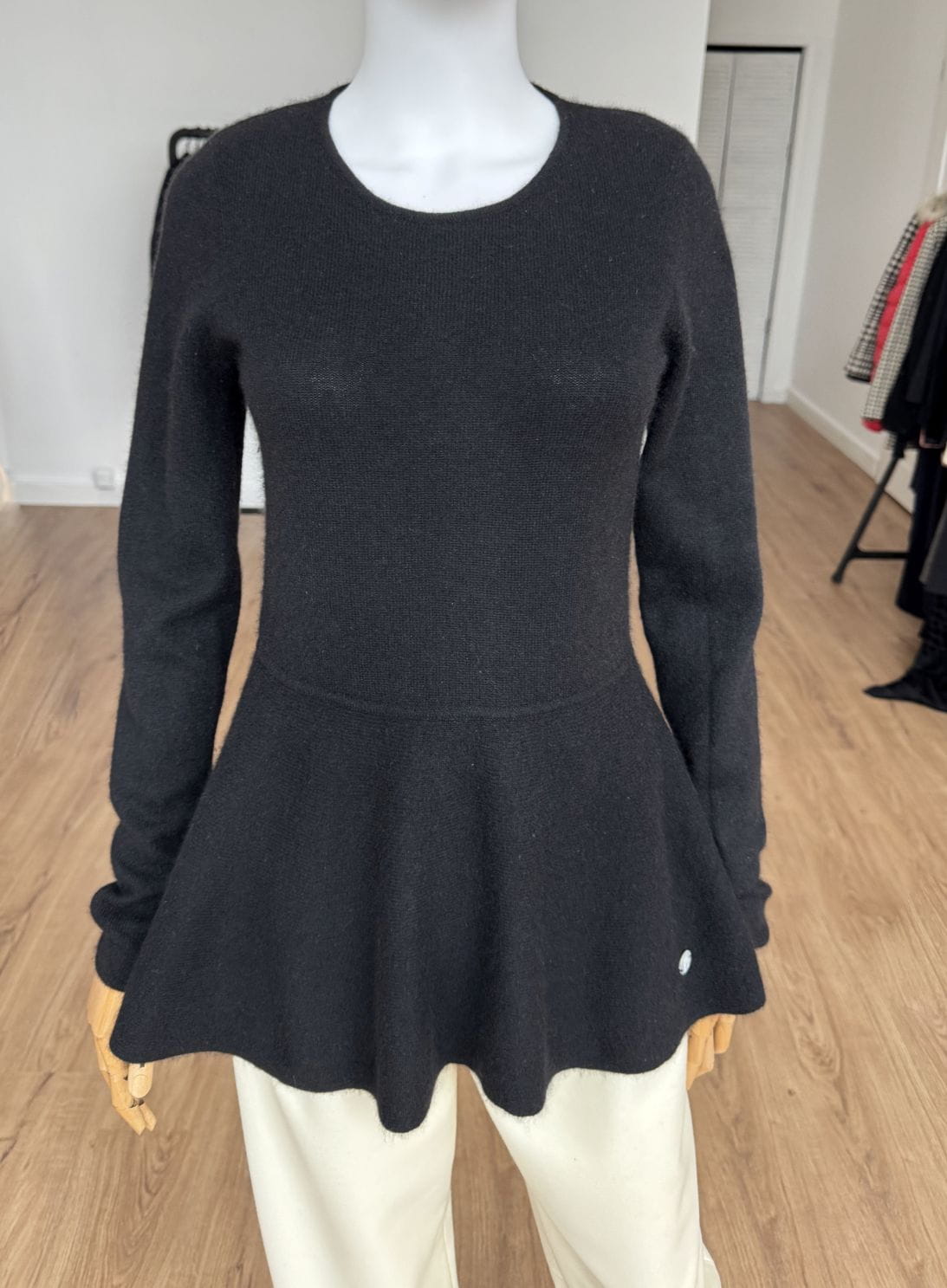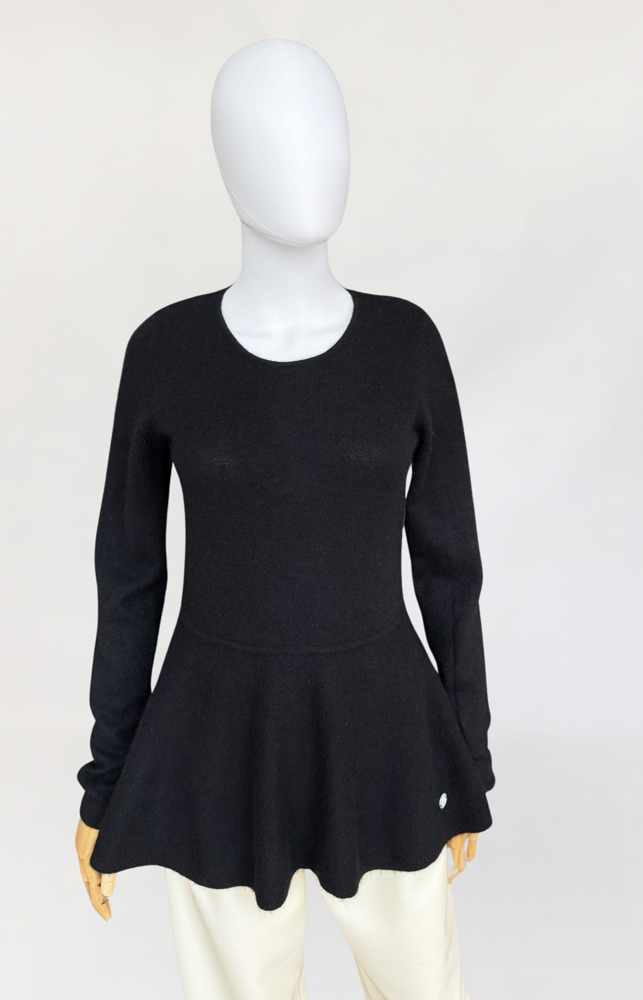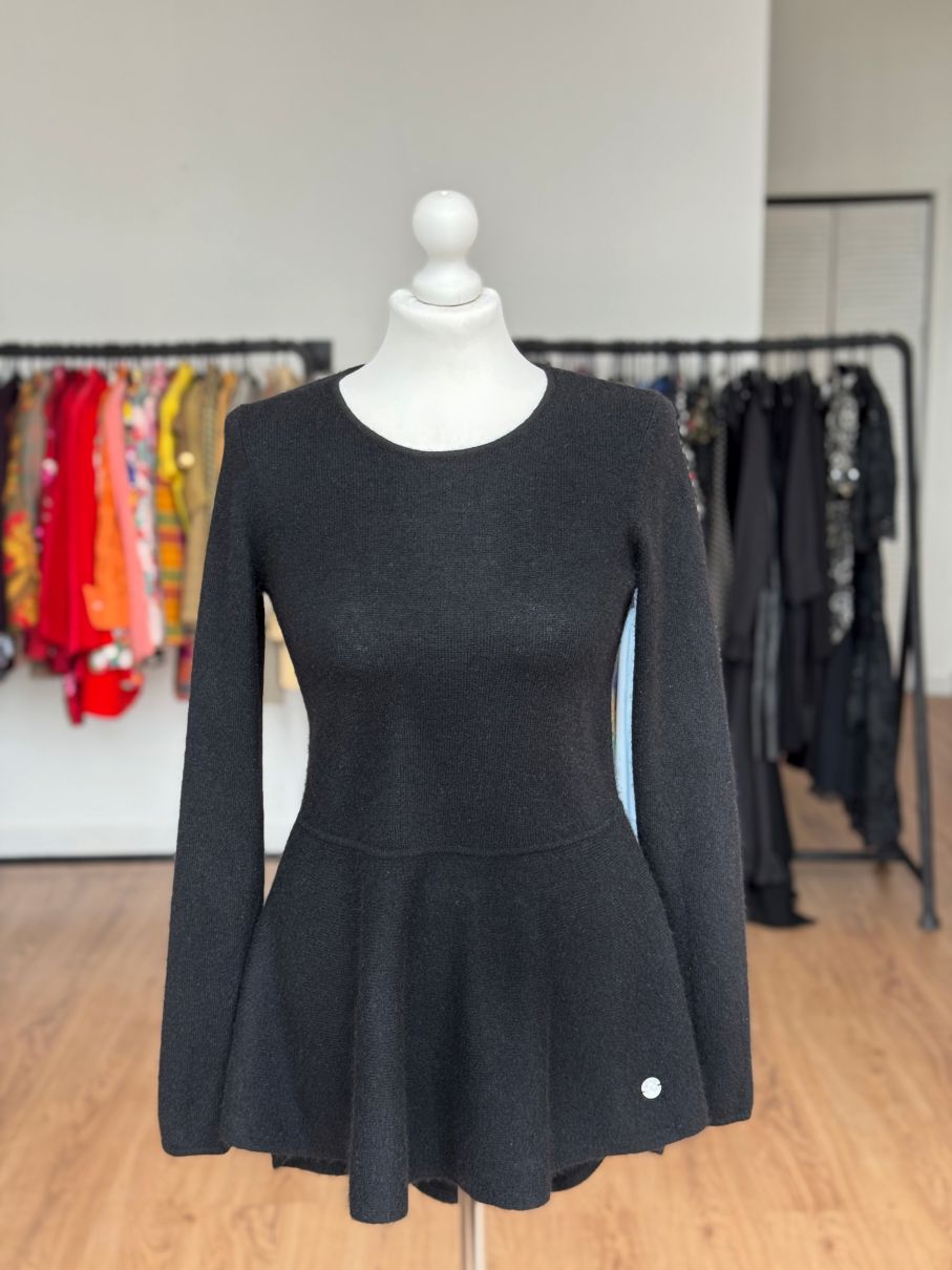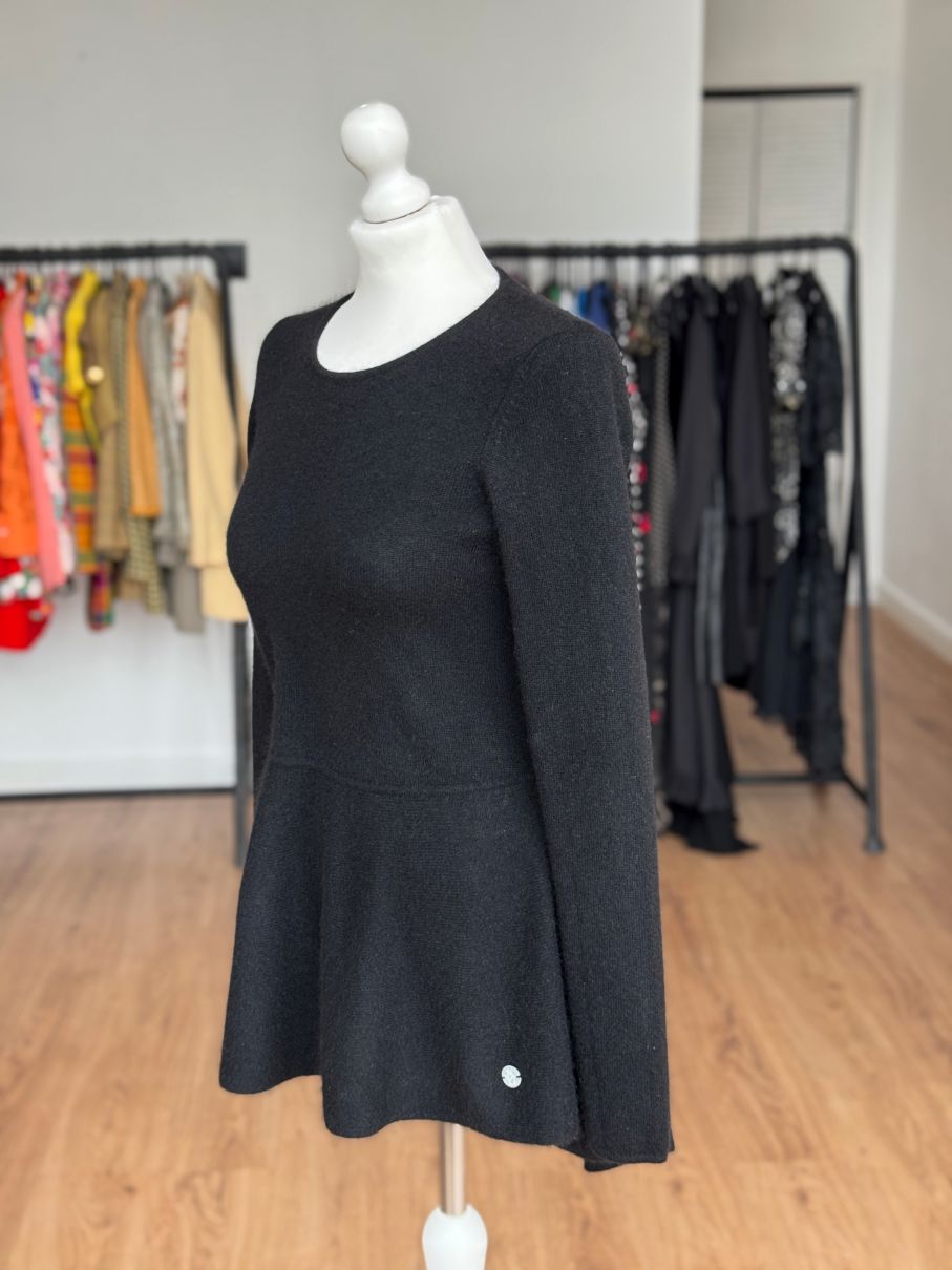 Sweter projektu renomowanej szwajcarskiej marki Princess Goes Hollywood. Wykonany w całości z puchatego miękkiego kaszmiru. Klasyczna góra z okrągłym dekoltem i długimi rękawami. Ciekawy fason, odcinany w pasie, z rozkloszowaną baskinką o asymetrycznej długości (tył dłuższy, wygląda jak tren). Całość w klasycznej czerni.