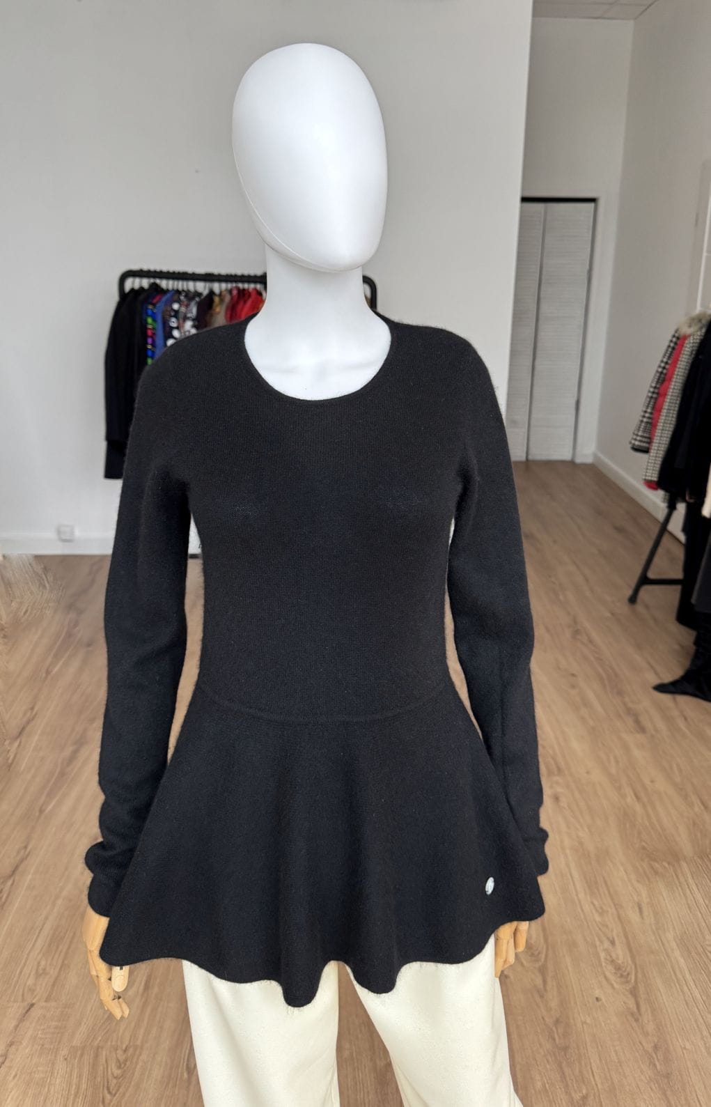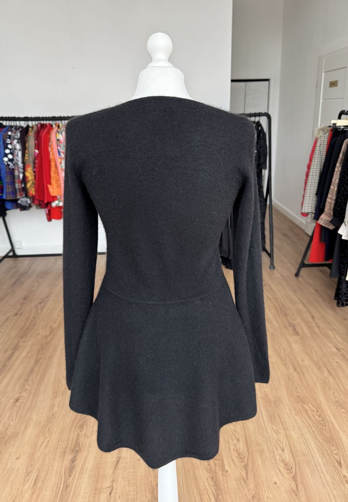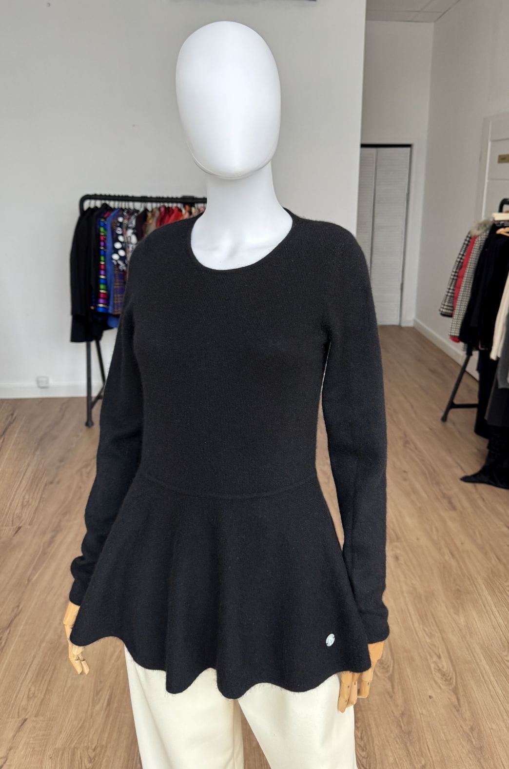 Sweter projektu renomowanej szwajcarskiej marki Princess Goes Hollywood. Wykonany w całości z puchatego miękkiego kaszmiru. Klasyczna góra z okrągłym dekoltem i długimi rękawami. Ciekawy fason, odcinany w pasie, z rozkloszowaną baskinką o asymetrycznej długości (tył dłuższy, wygląda jak tren). Całość w klasycznej czerni.