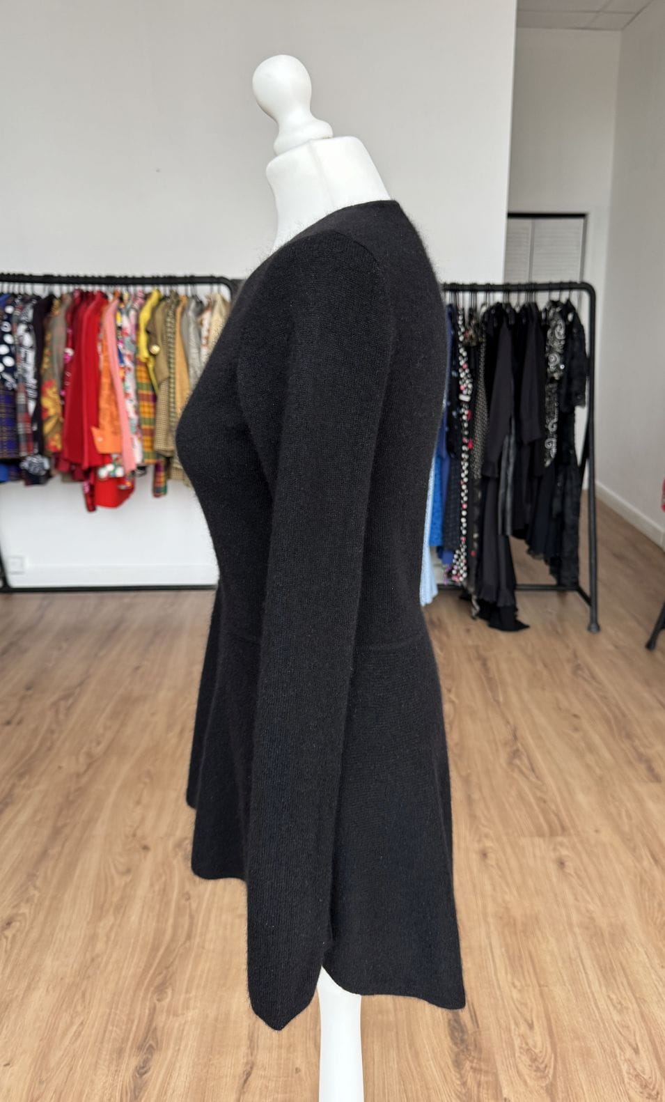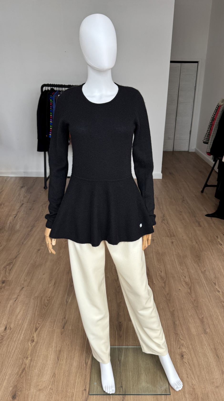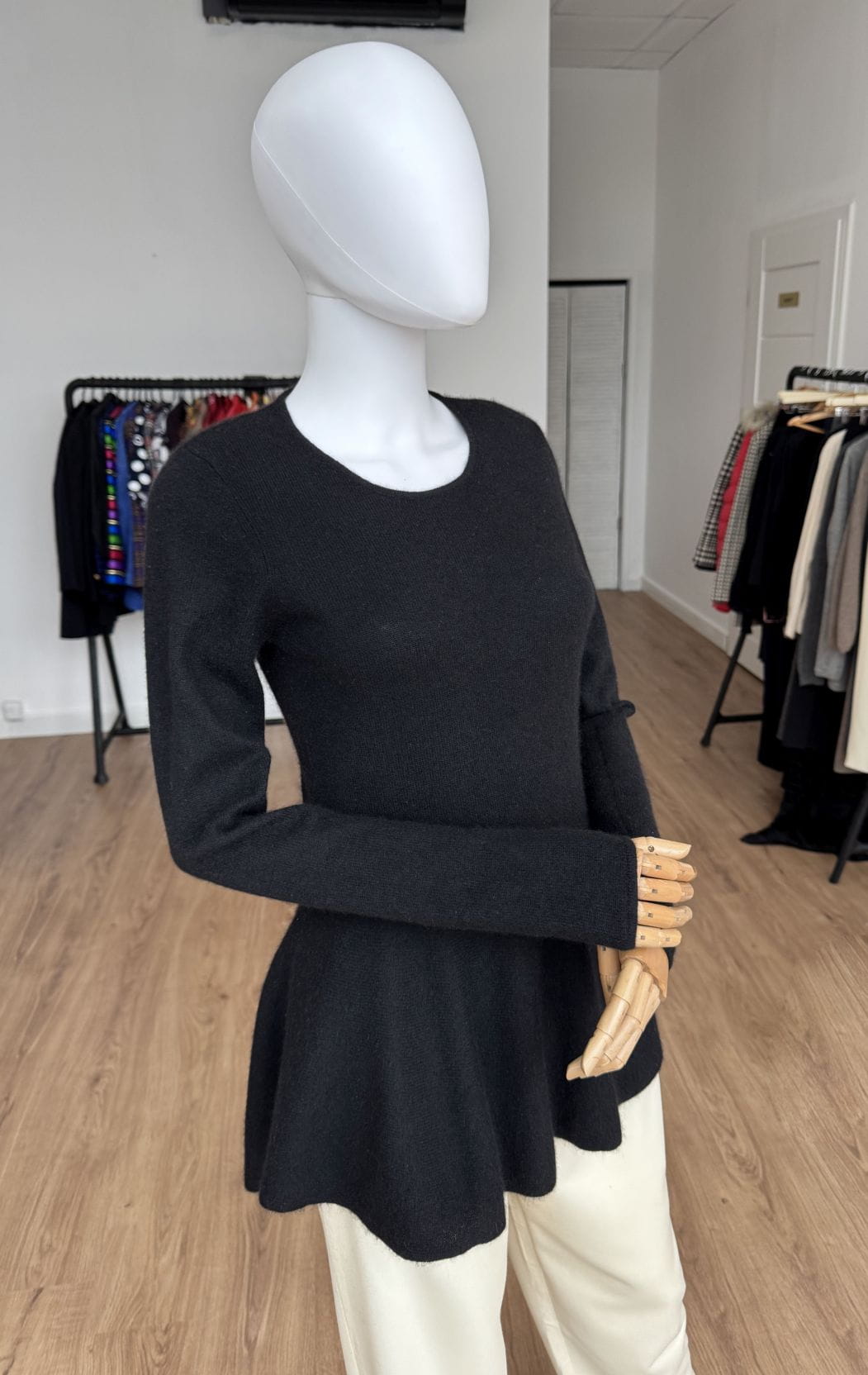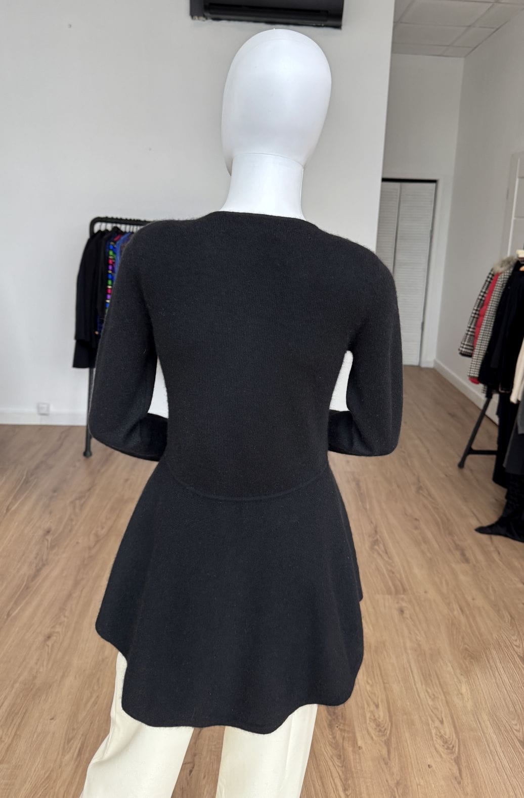 Sweter projektu renomowanej szwajcarskiej marki Princess Goes Hollywood. Wykonany w całości z puchatego miękkiego kaszmiru. Klasyczna góra z okrągłym dekoltem i długimi rękawami. Ciekawy fason, odcinany w pasie, z rozkloszowaną baskinką o asymetrycznej długości (tył dłuższy, wygląda jak tren). Całość w klasycznej czerni.