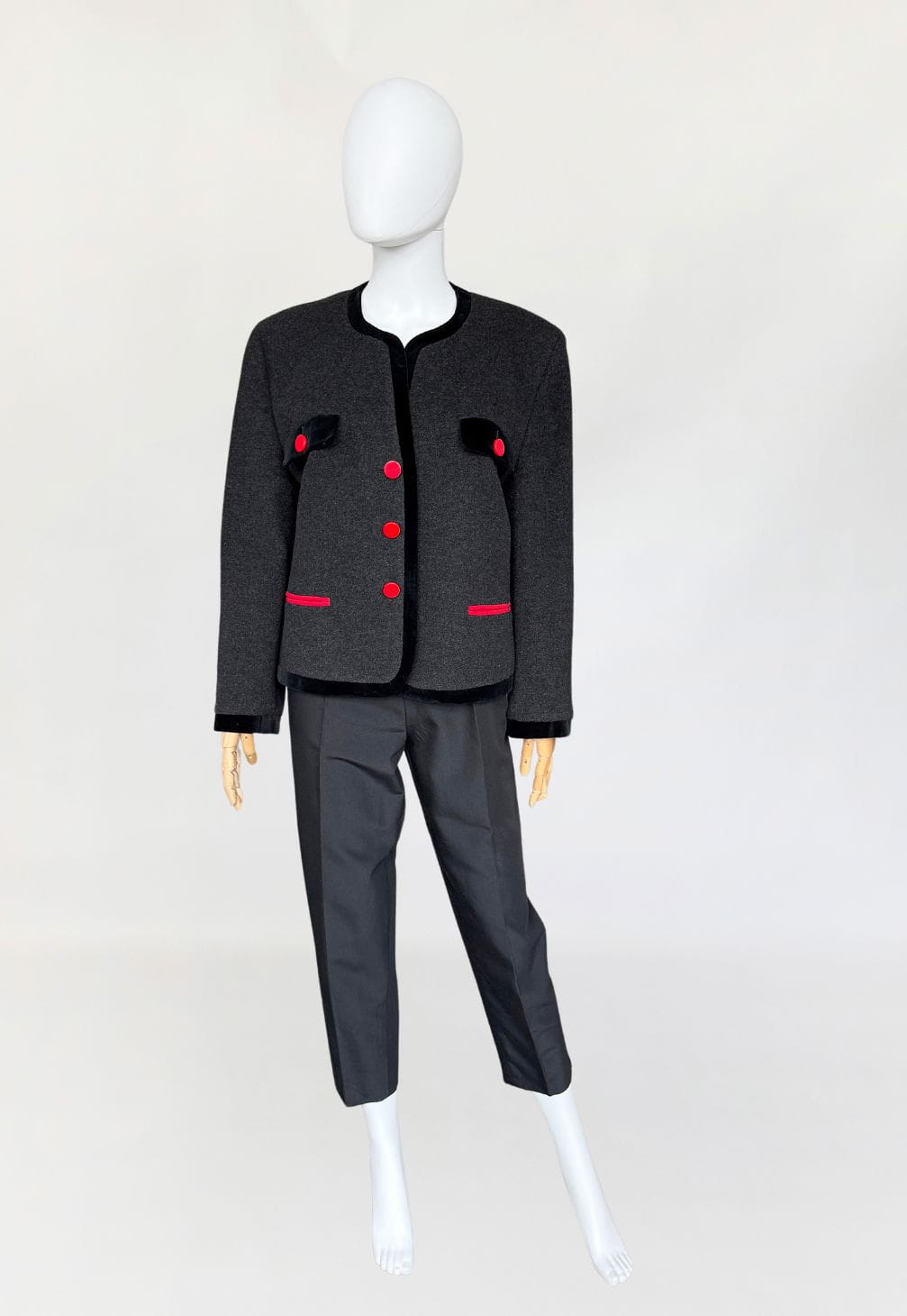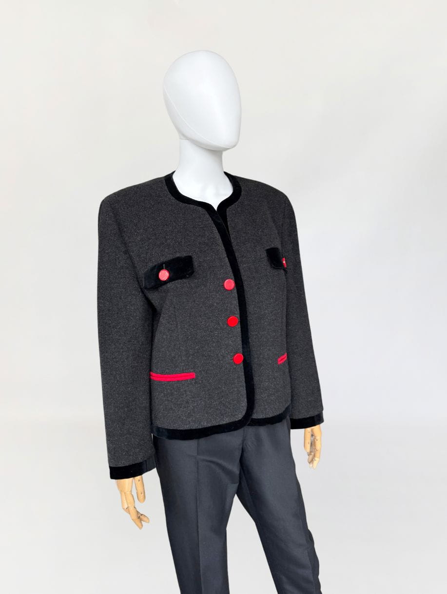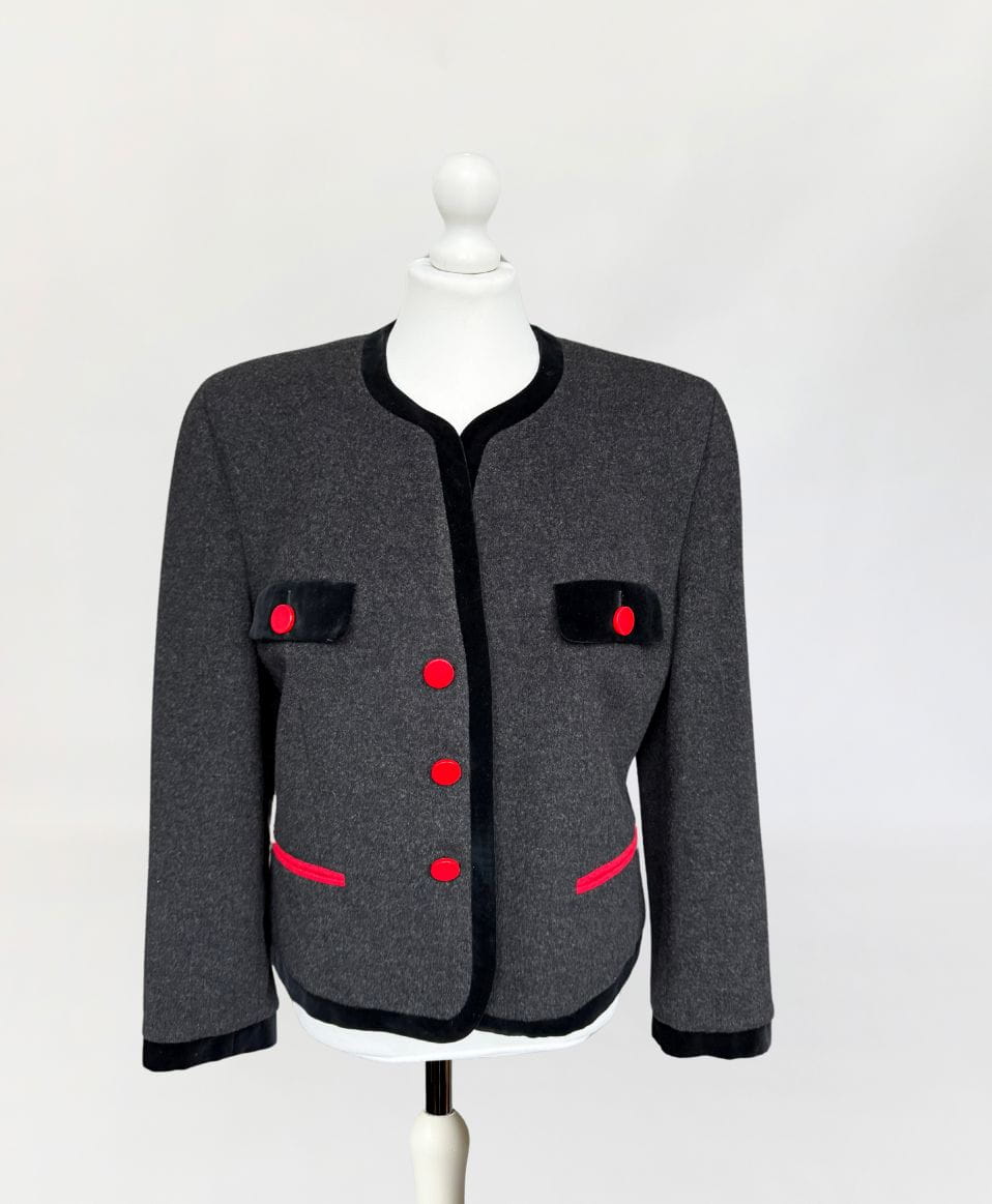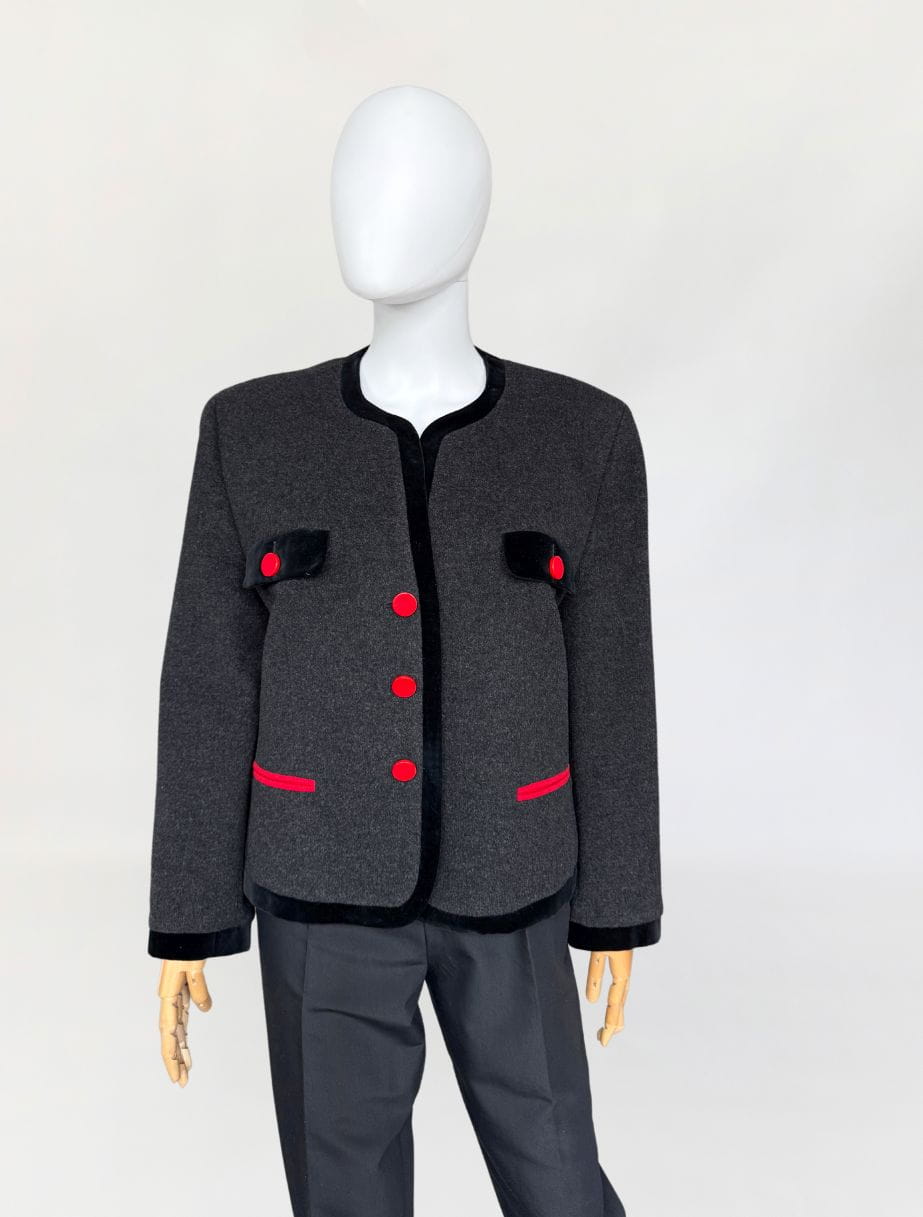 Włoski żakiet vintage z lat 80-tych, o pudełkowym fasonie z okrągłym dekoltem. Wykonany z doskonałej gatunkowo, miękkiej tkaniny w grafitowym kolorze, z czarną aksamitną lamówką i kontrastowymi czerwonymi guzikami. Długie rękawy z poduszkami w ramionach.