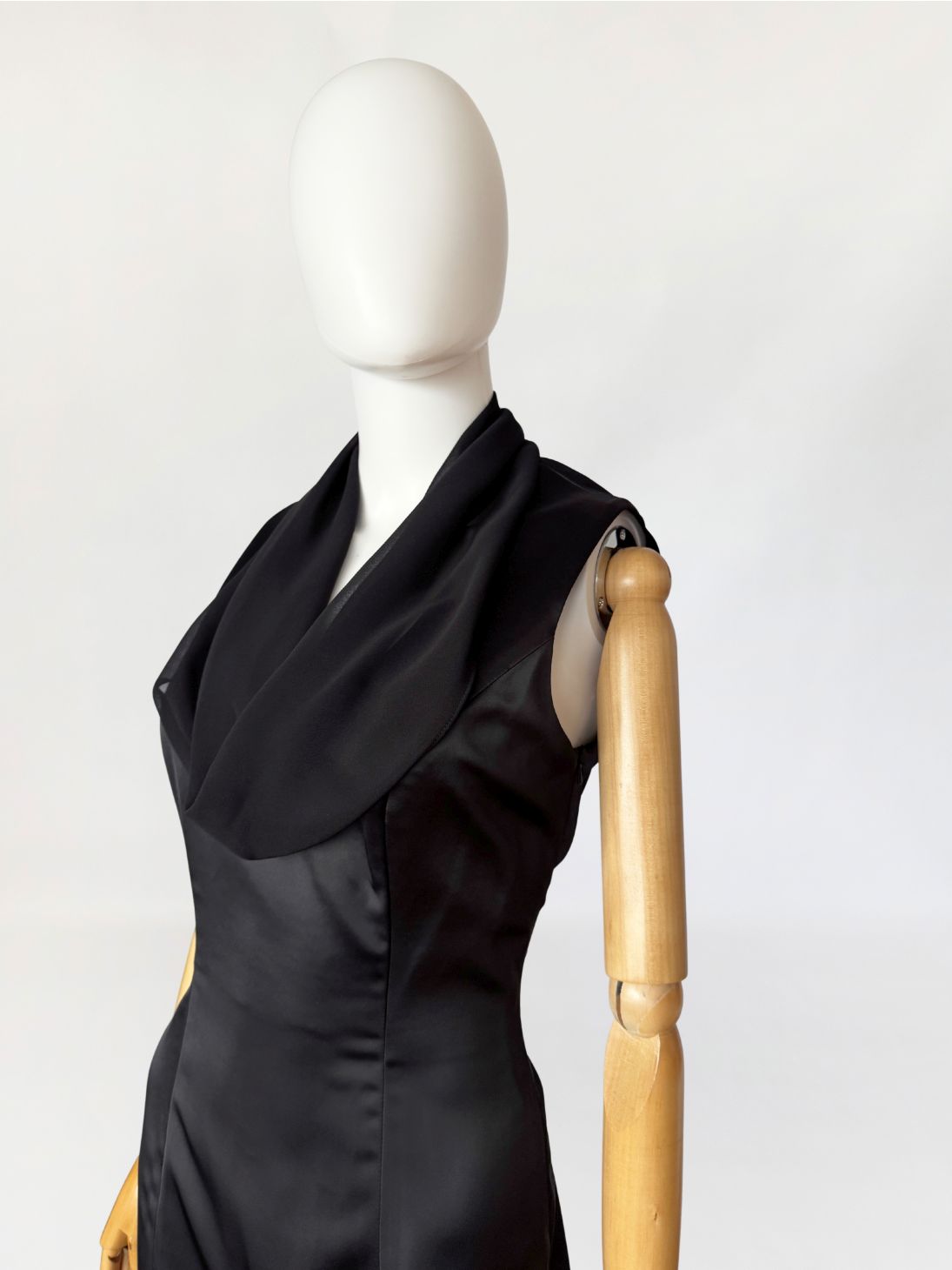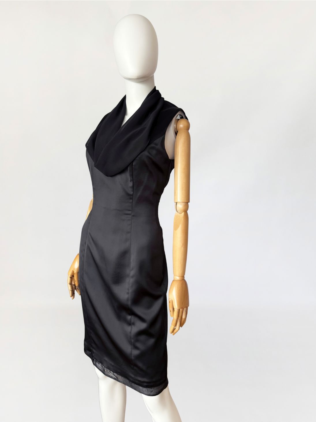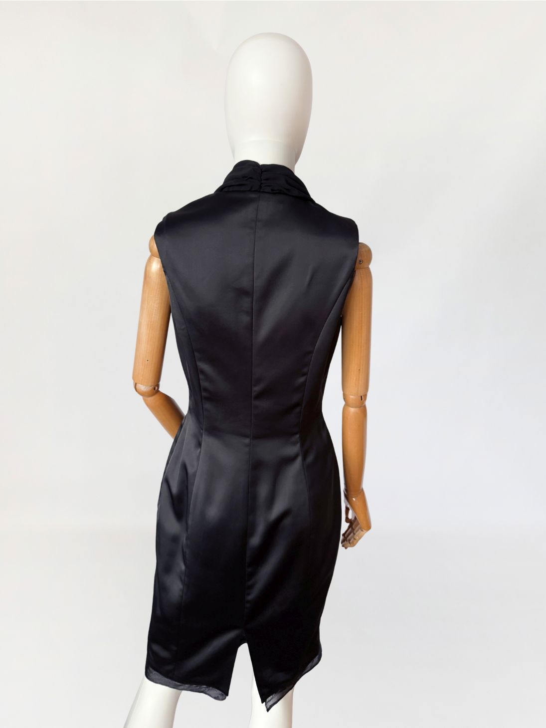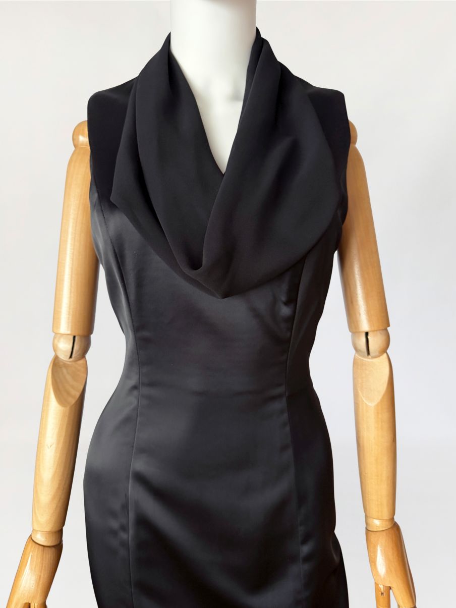 Sukienka vintage luksusowego włoskiego domu mody Renato Balestra, wykonana z antracytowej tkaniny o satynowym splocie. Model bez rękawów, o dopasowanej, smukłej linii, formowanej za pomocą pionowych cięć modelujących poprowadzonych przez przód i tył. Góra wykończona szyfonowym, swobodnie układającym się, drapowanym kołnierzem typu waterfall, z pogłębioną linią dekoltu. Tył z centralnym szwem konstrukcyjnym oraz krytym rozporkiem u dołu. Długość midi. Dół wykończony delikatną, półtransparentną lamówką z organzy.