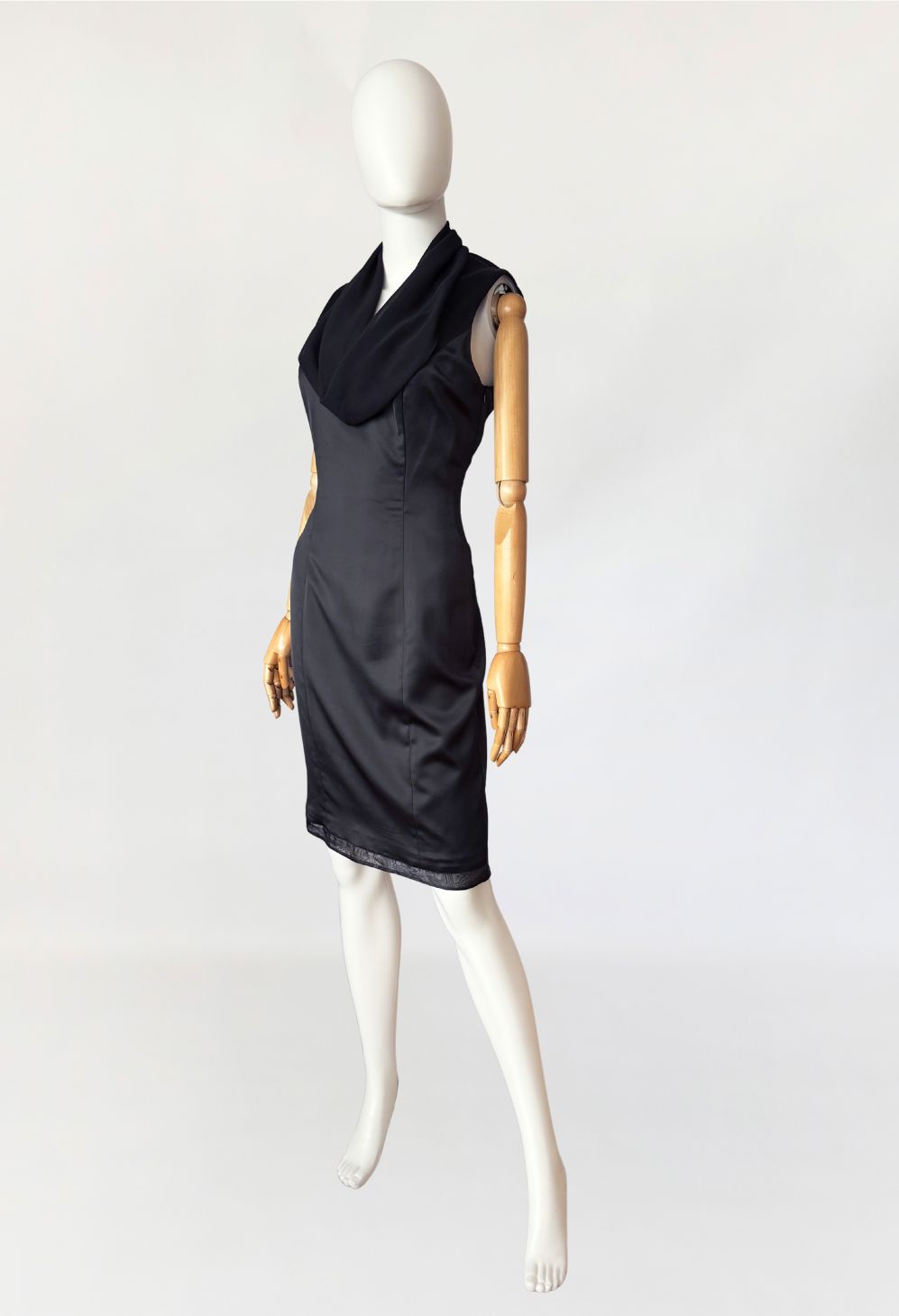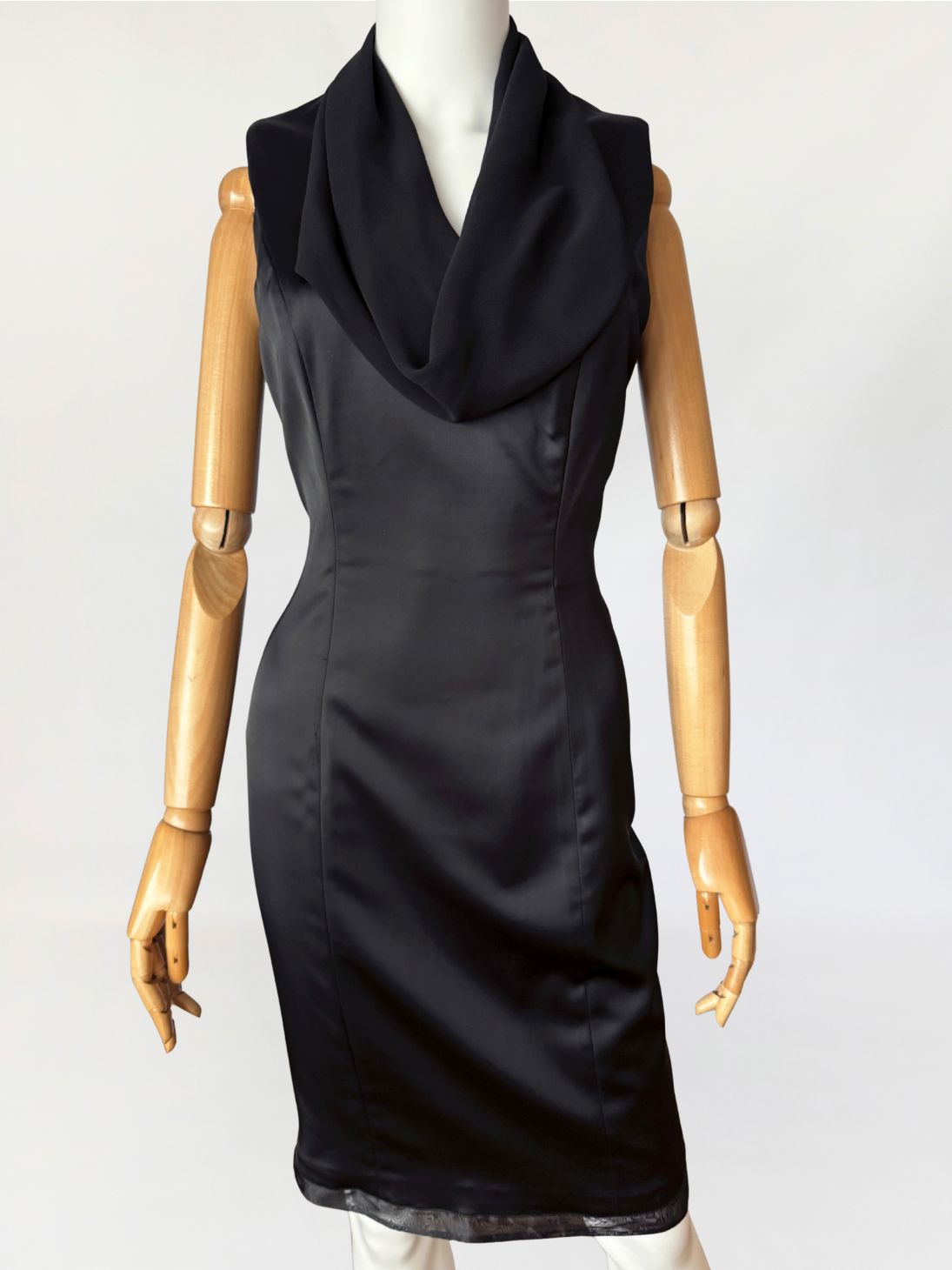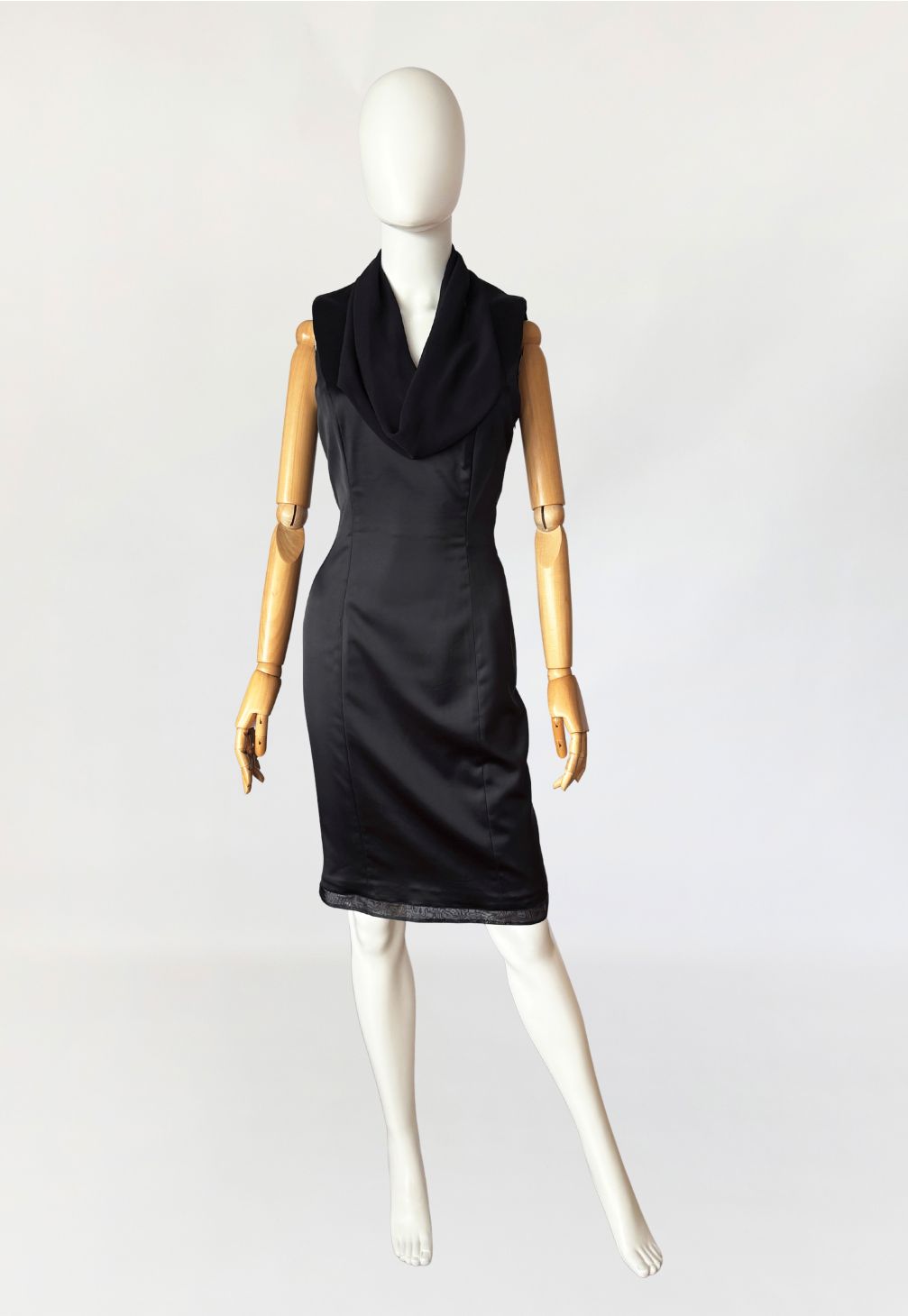 Sukienka vintage luksusowego włoskiego domu mody Renato Balestra, wykonana z antracytowej tkaniny o satynowym splocie. Model bez rękawów, o dopasowanej, smukłej linii, formowanej za pomocą pionowych cięć modelujących poprowadzonych przez przód i tył. Góra wykończona szyfonowym, swobodnie układającym się, drapowanym kołnierzem typu waterfall, z pogłębioną linią dekoltu. Tył z centralnym szwem konstrukcyjnym oraz krytym rozporkiem u dołu. Długość midi. Dół wykończony delikatną, półtransparentną lamówką z organzy.