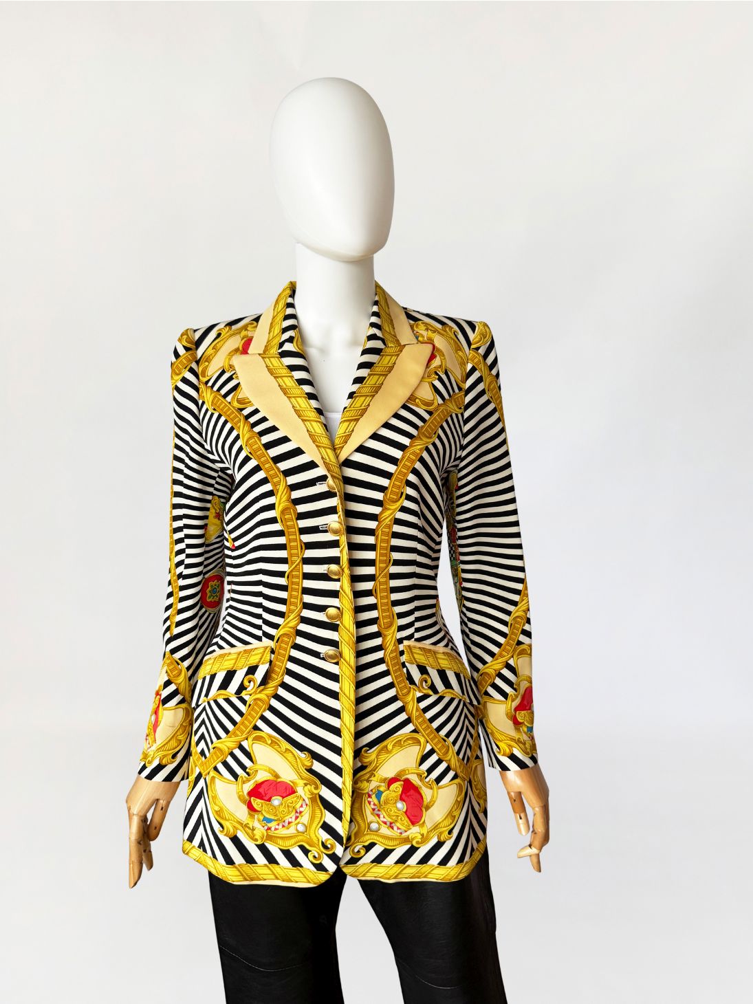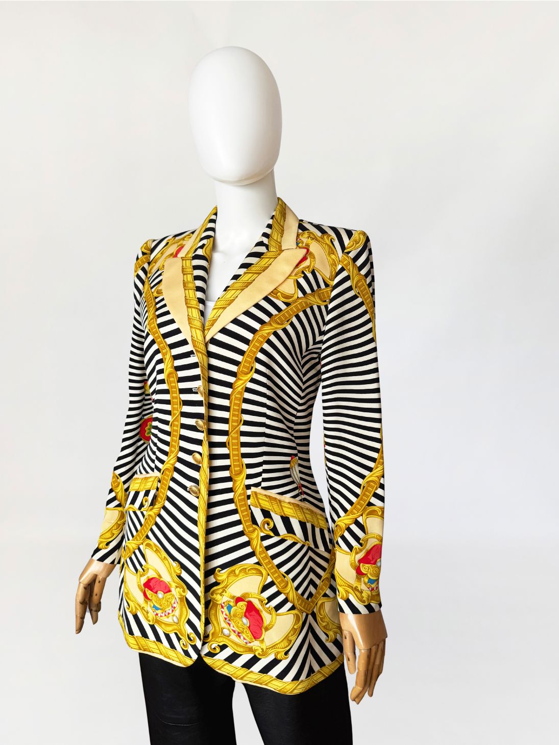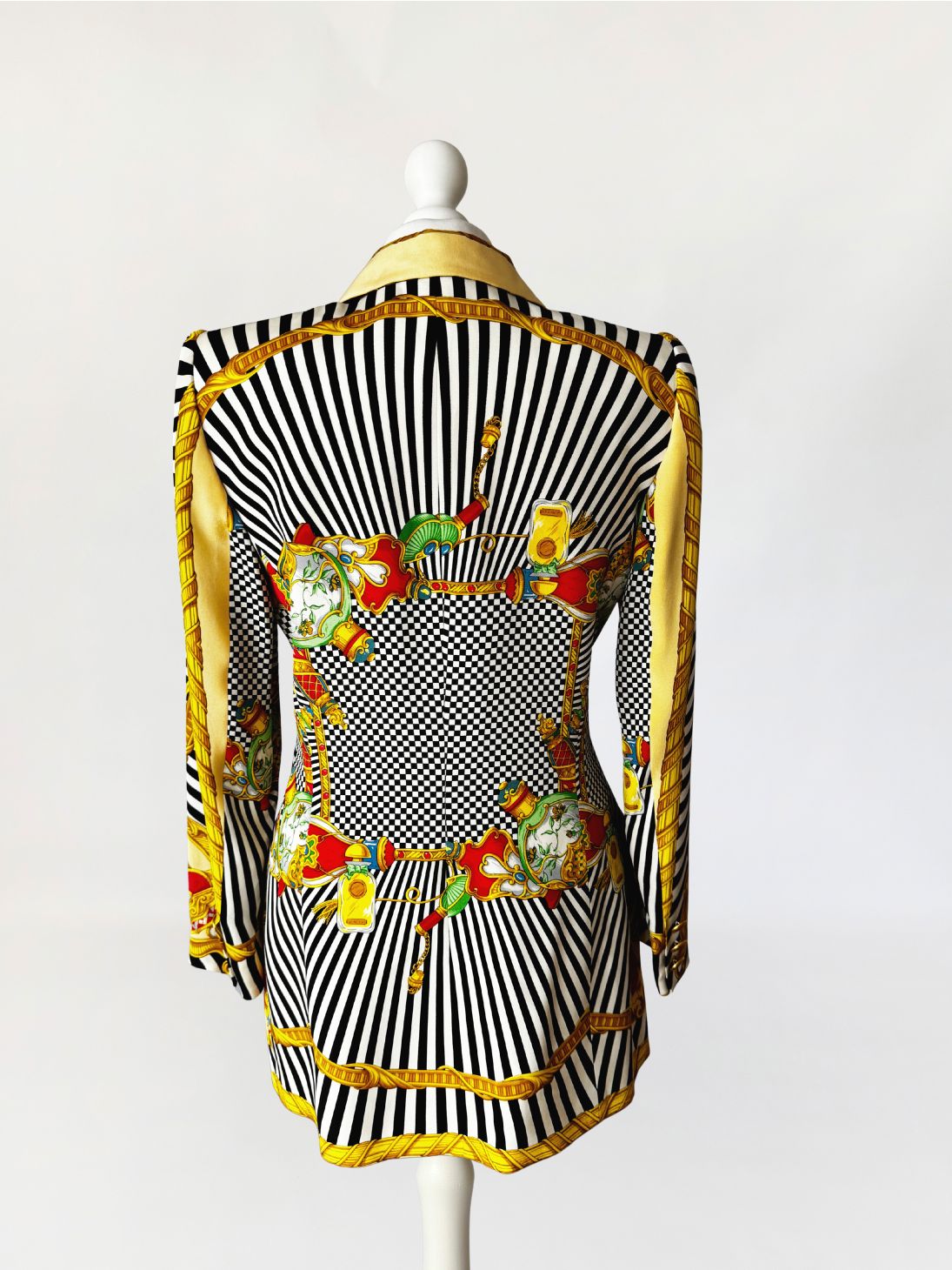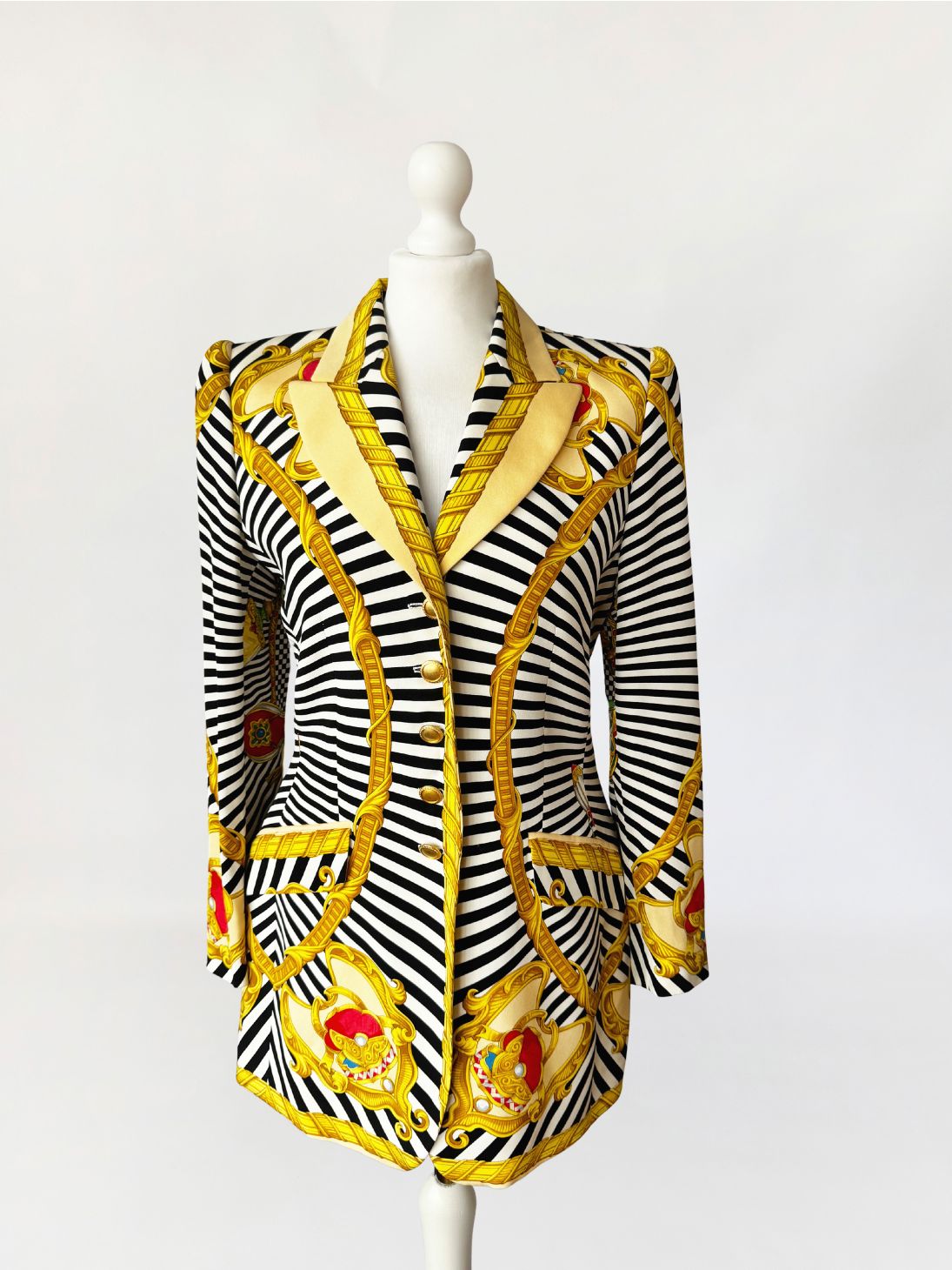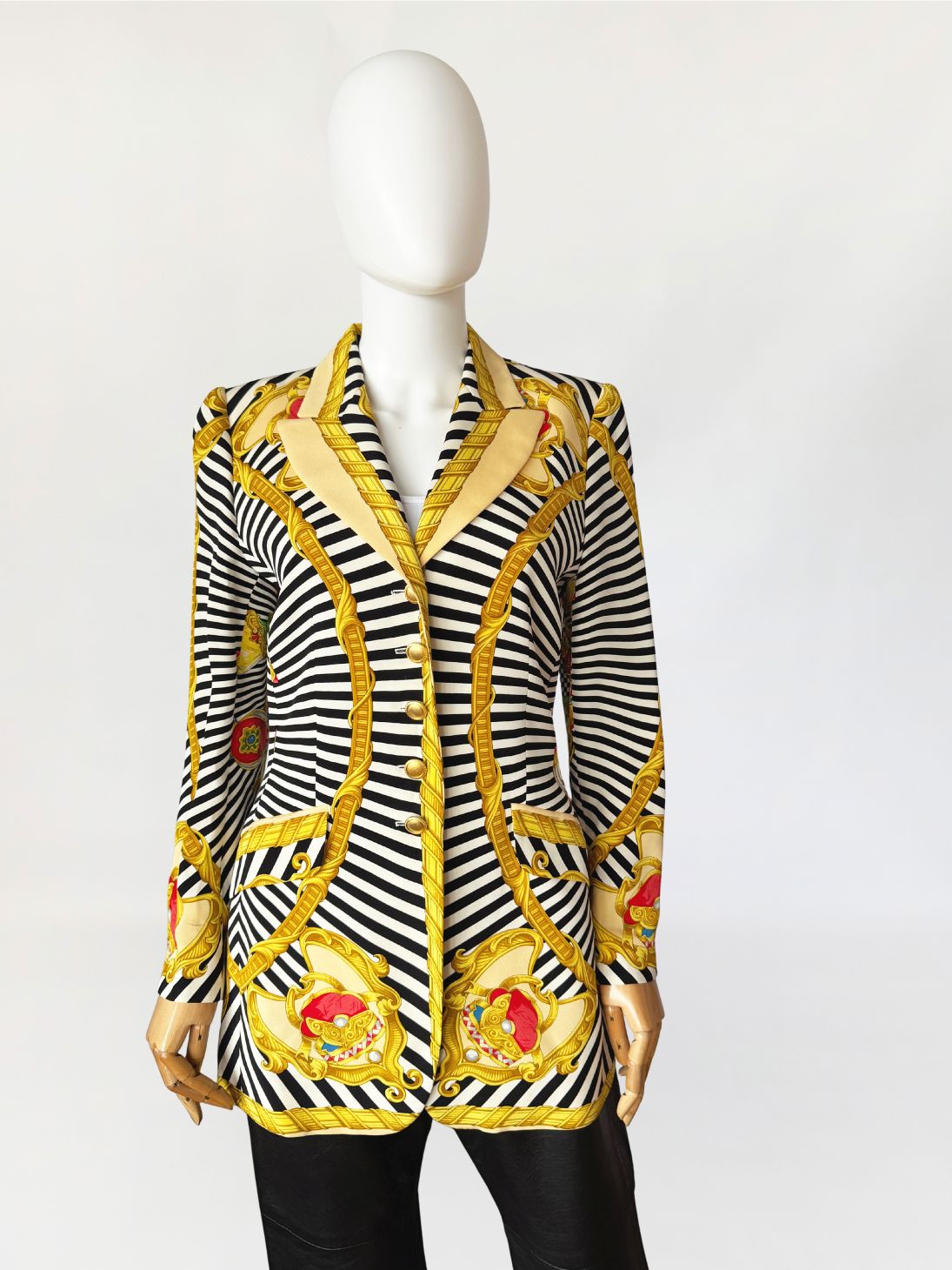 Marynarka vintage z lat 80-tych projektu marki Renzo. Wykonana z lekkiej jedwabnej tkaniny drukowanej w kontrastowy wzór czarno-białych pasów i szachownicy, oraz motywów barokowych w odcieniach złota, czerwieni i zieleni, rozmieszczonych panelowo. Dłuższy taliowany fason z długimi, klasycznie wszytymi rękawami. Ramiona lekko usztywnione, doskonale wyprofilowane. Zapinana na rząd metalowych guzików w złotym kolorze. W dolnej części kieszenie z klapami.
