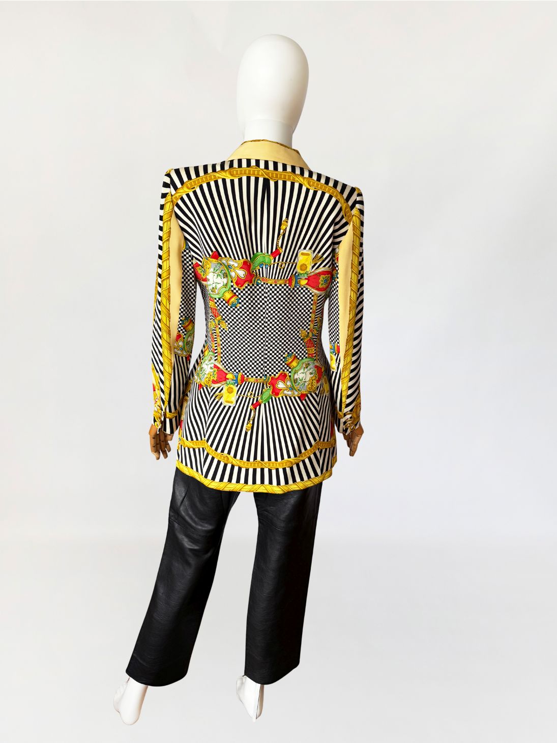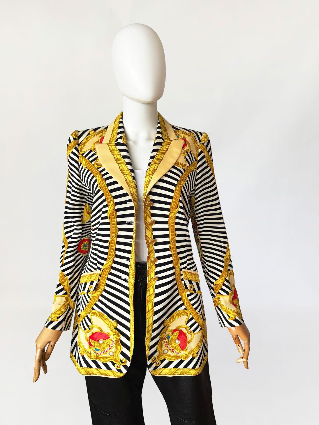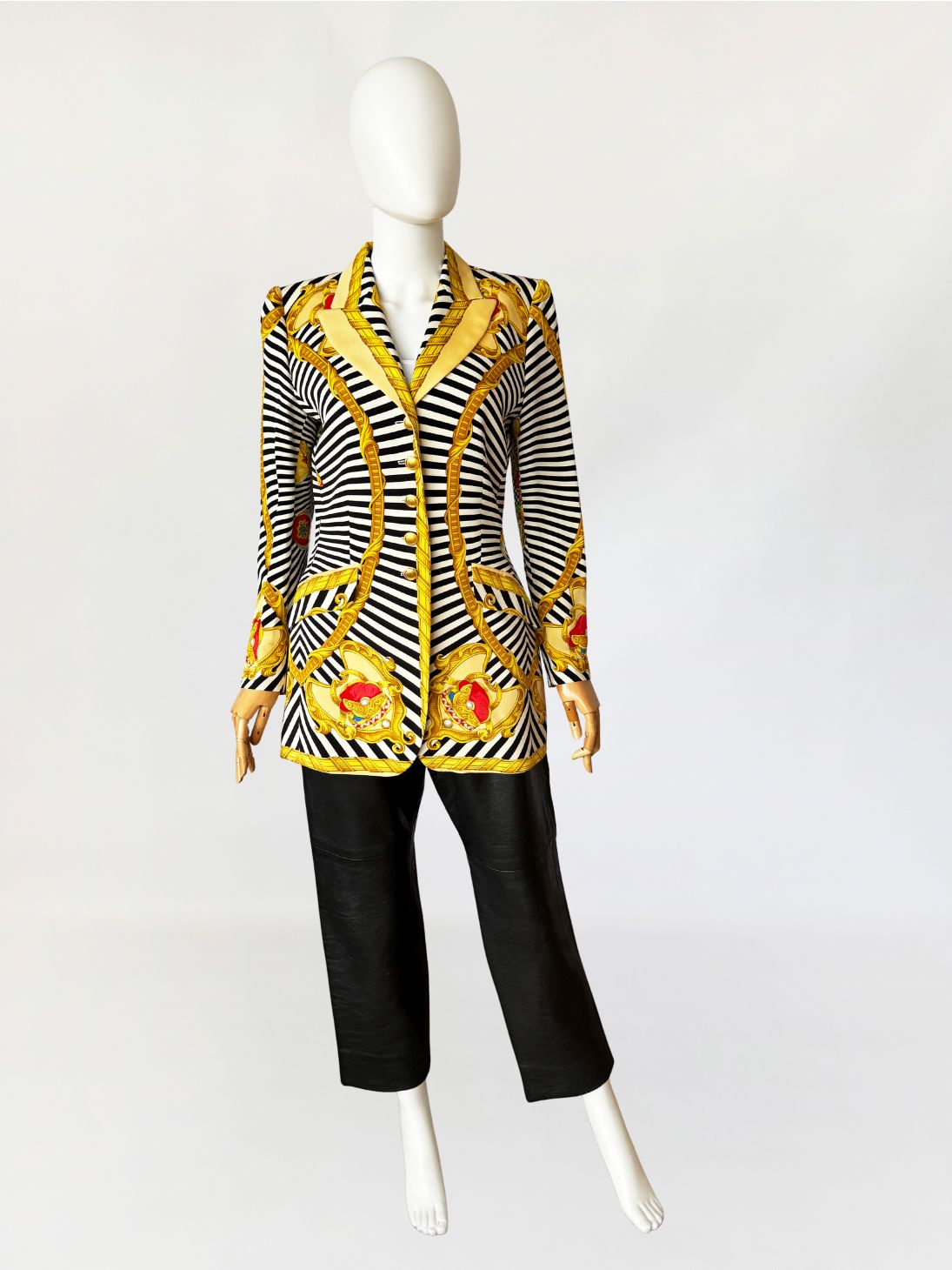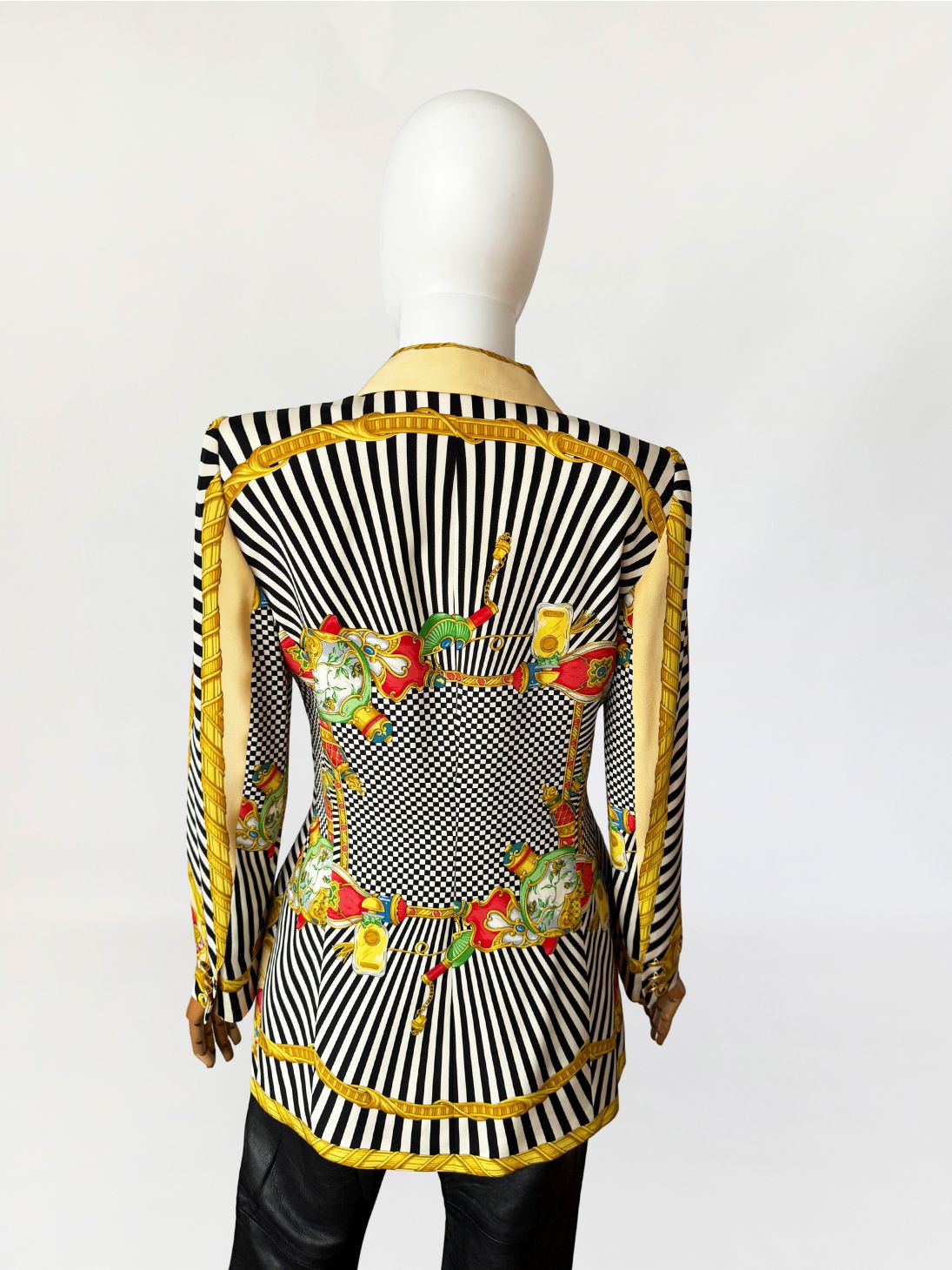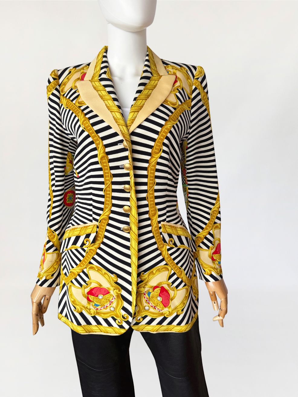 Marynarka vintage z lat 80-tych projektu marki Renzo. Wykonana z lekkiej jedwabnej tkaniny drukowanej w kontrastowy wzór czarno-białych pasów i szachownicy, oraz motywów barokowych w odcieniach złota, czerwieni i zieleni, rozmieszczonych panelowo. Dłuższy taliowany fason z długimi, klasycznie wszytymi rękawami. Ramiona lekko usztywnione, doskonale wyprofilowane. Zapinana na rząd metalowych guzików w złotym kolorze. W dolnej części kieszenie z klapami.