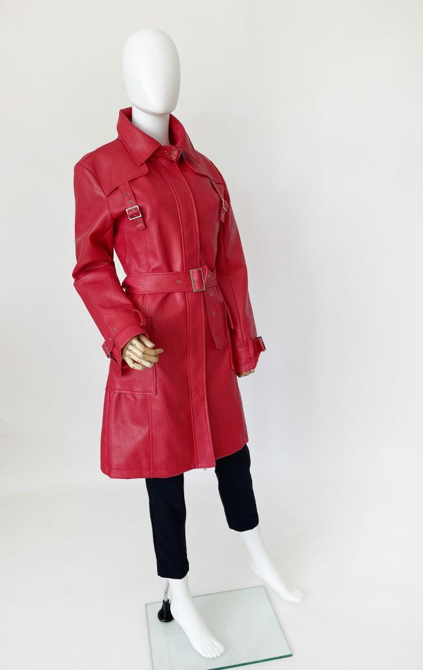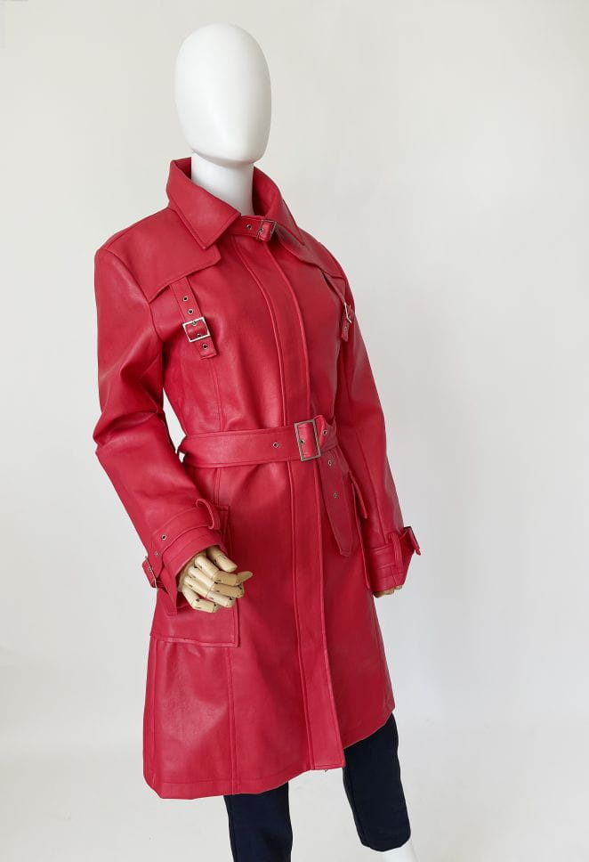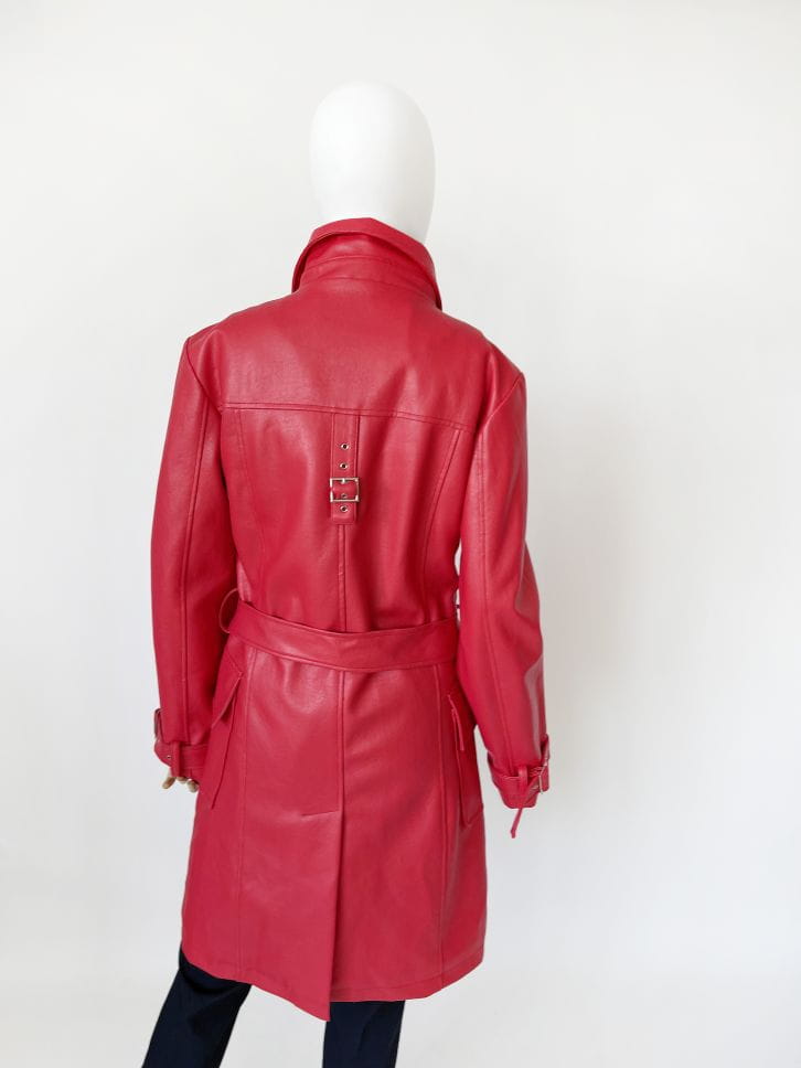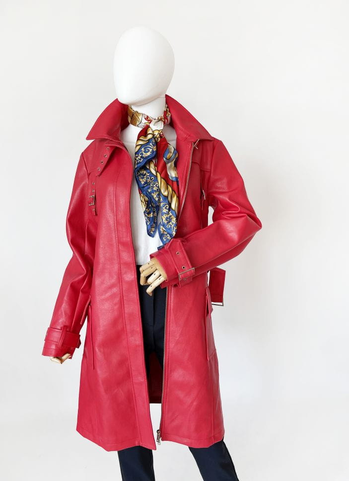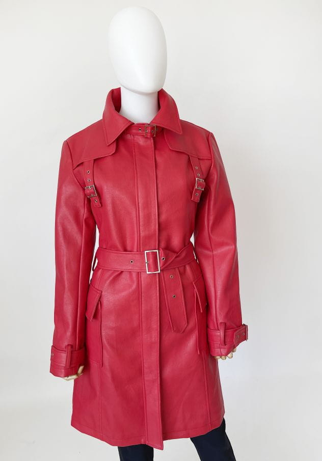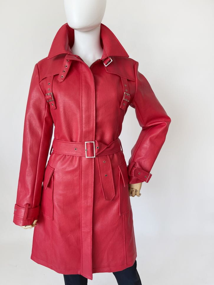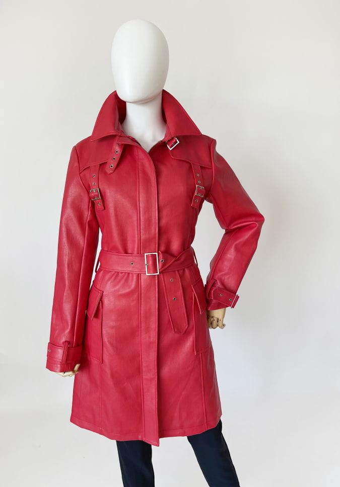 Włoski płaszcz projektu marki Rino&Pelle, wykonany z (naprawdę) solidnej, miękkiej sztucznej skóry w kolorze czerwonym. Model z lekko rockowym akcentem, u góry po obu stronach, oraz na plecach dekoracyjne pasy z klamrami. Prosty fason, przepinany regulowanym paskiem. Na wysokości bioder duże kieszenie z patkami.
