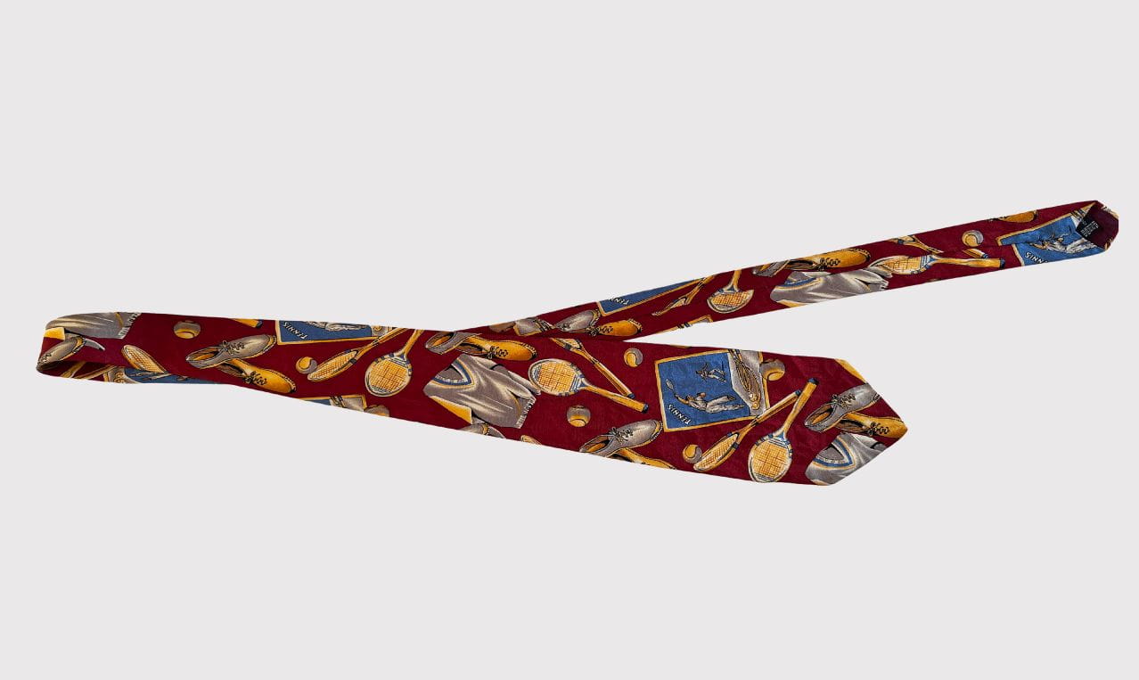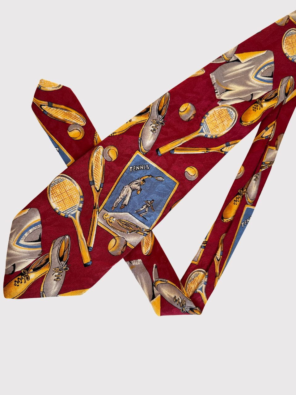 Unikatowy włoski krawat vintage z lat 90-tych od Roberto Mocellini. Wykonany z jedwabnej tkaniny w barwne wzory w motyw tenisowy.