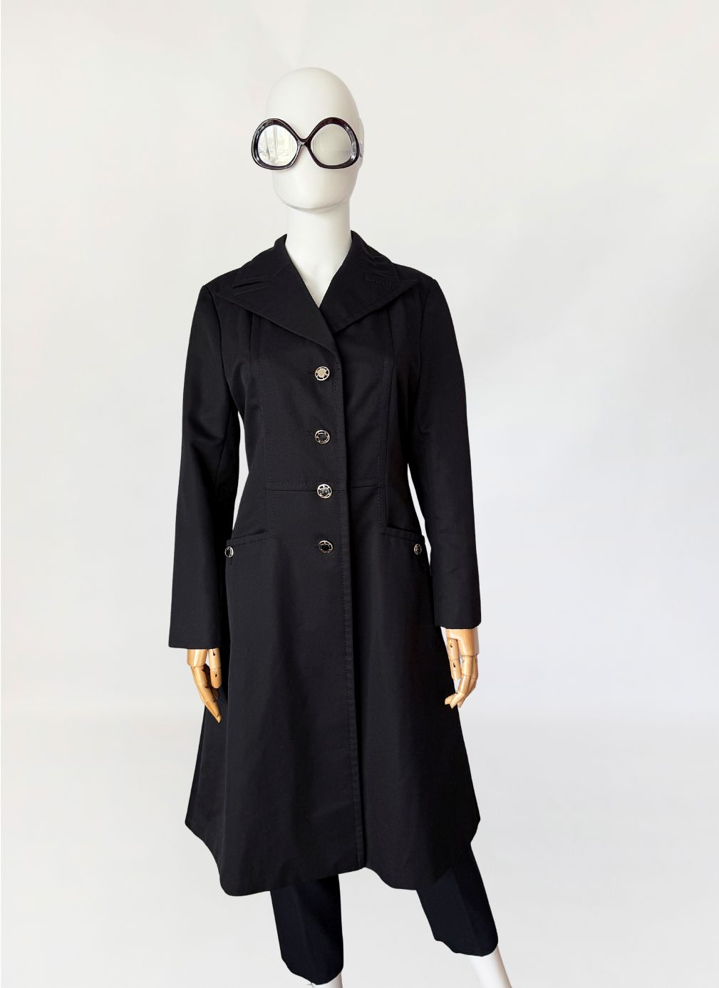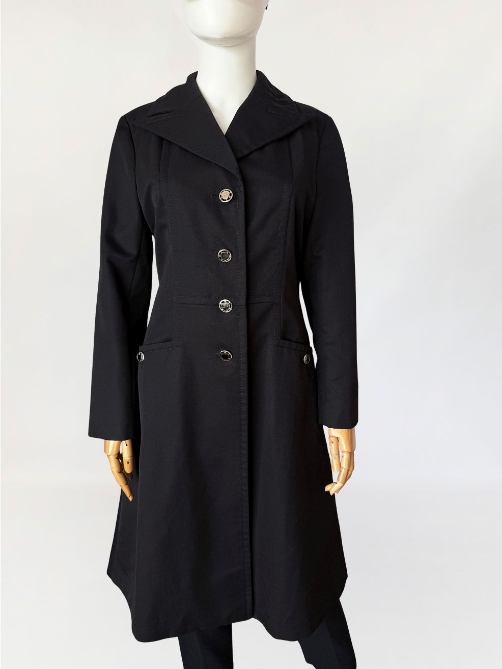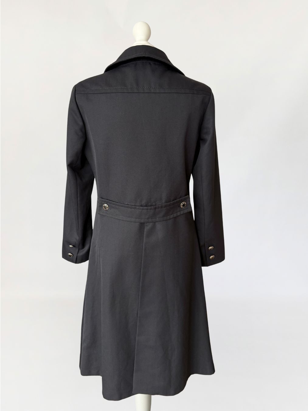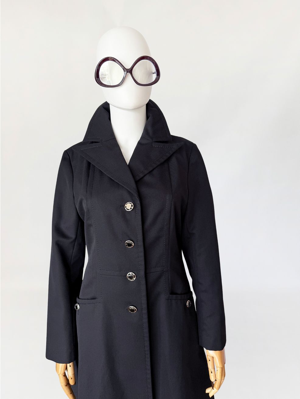 Francuski płaszcz vintage Royal Blizzard. Klasyczny model o długości do kolan, zapinany na rząd metalowych guzików. Kołnierz z wyraźnie zarysowanymi klapami, konstrukcja oparta na pionowych cięciach modelujących sylwetkę. W talii wszyty pasek regulacyjny na plecach, zapinany na guziki. Rękawy długie, proste, z guzikami przy mankietach. Na wysokości bioder kieszenie cięte z patkami, wykończone metalowymi guzikami.