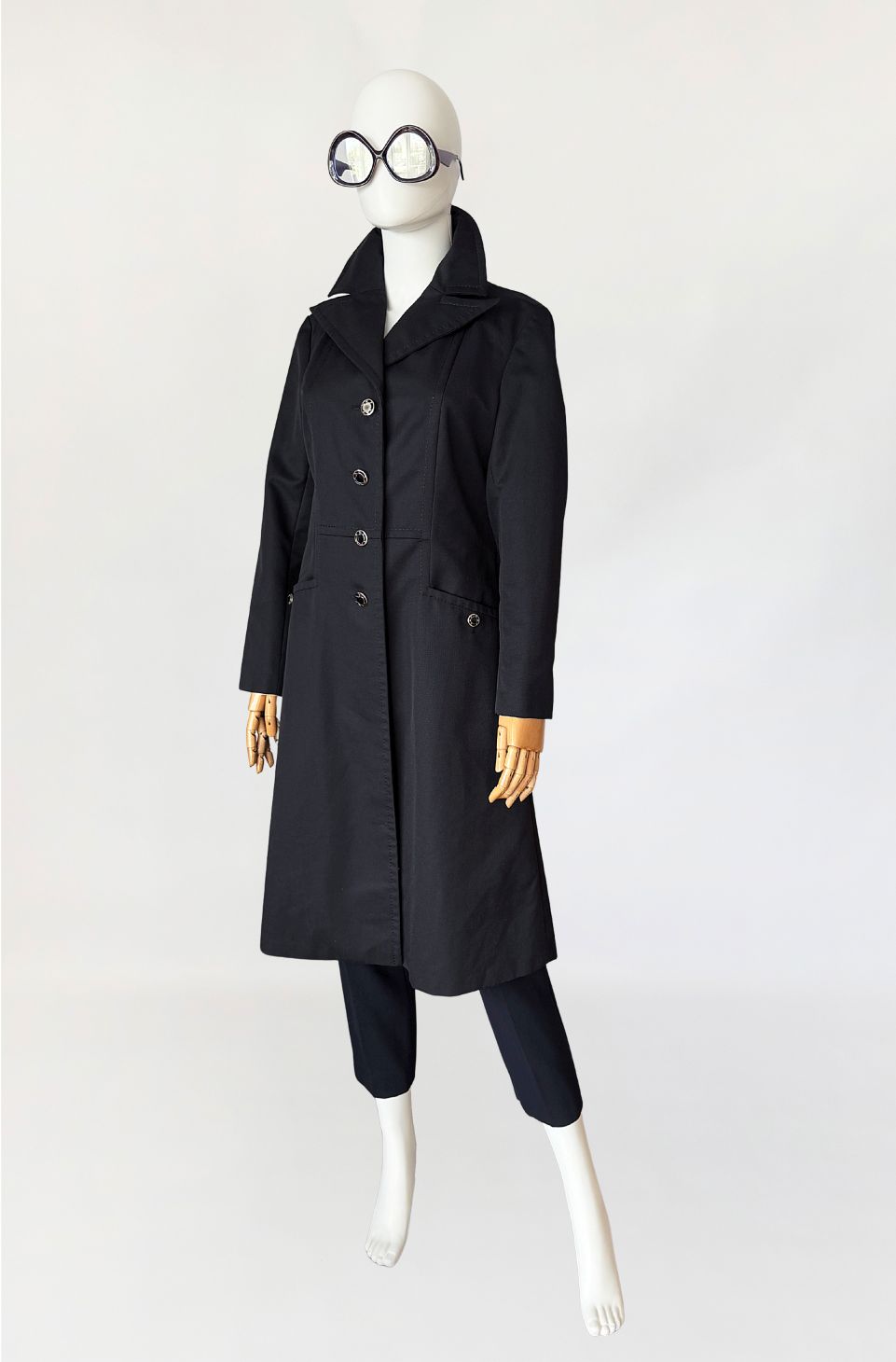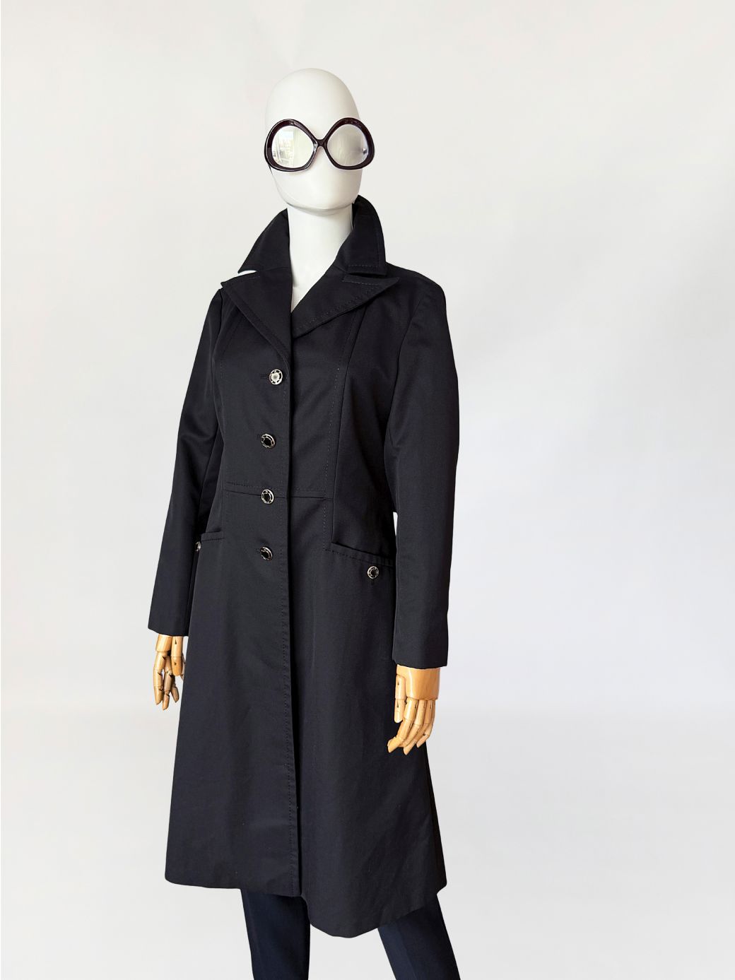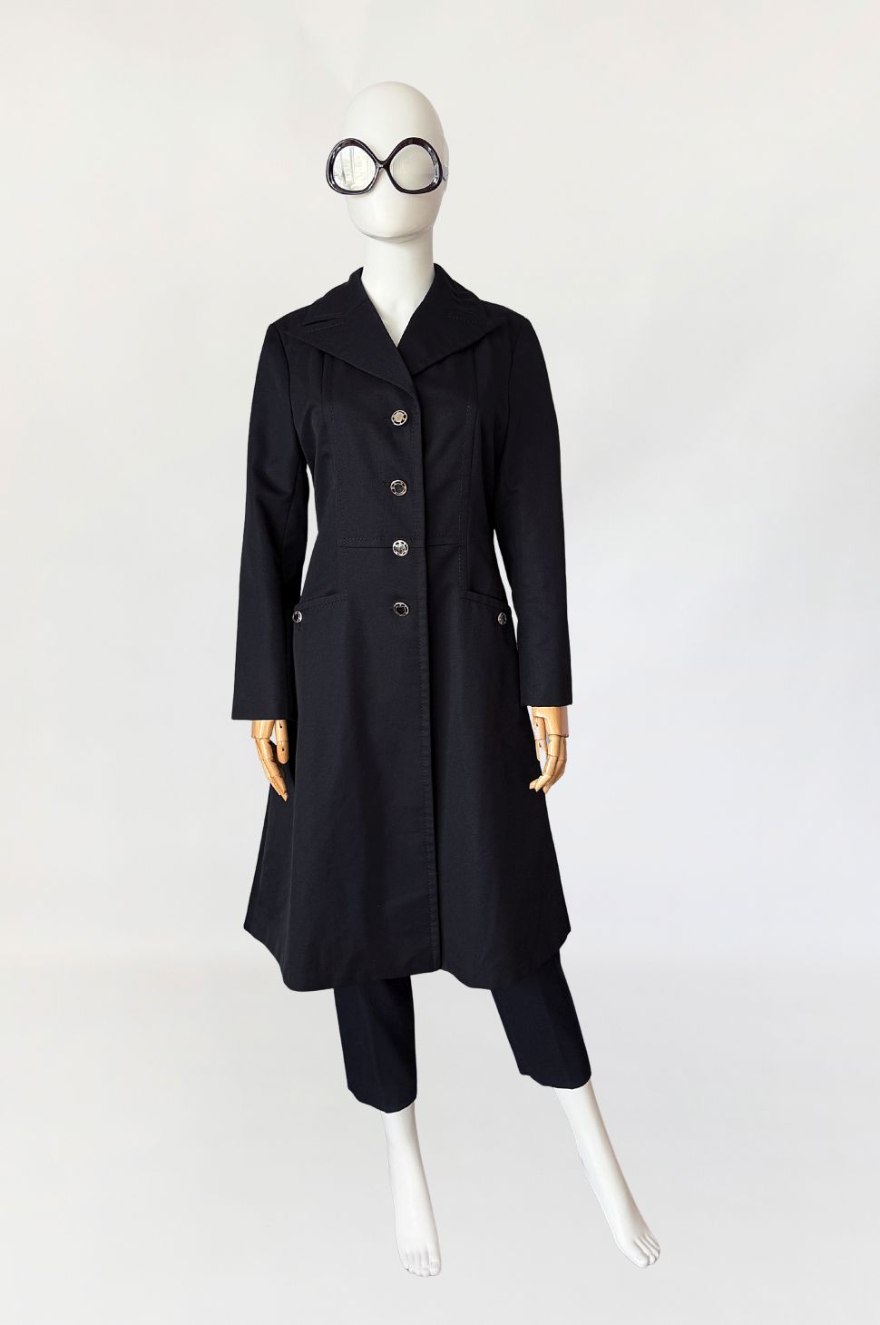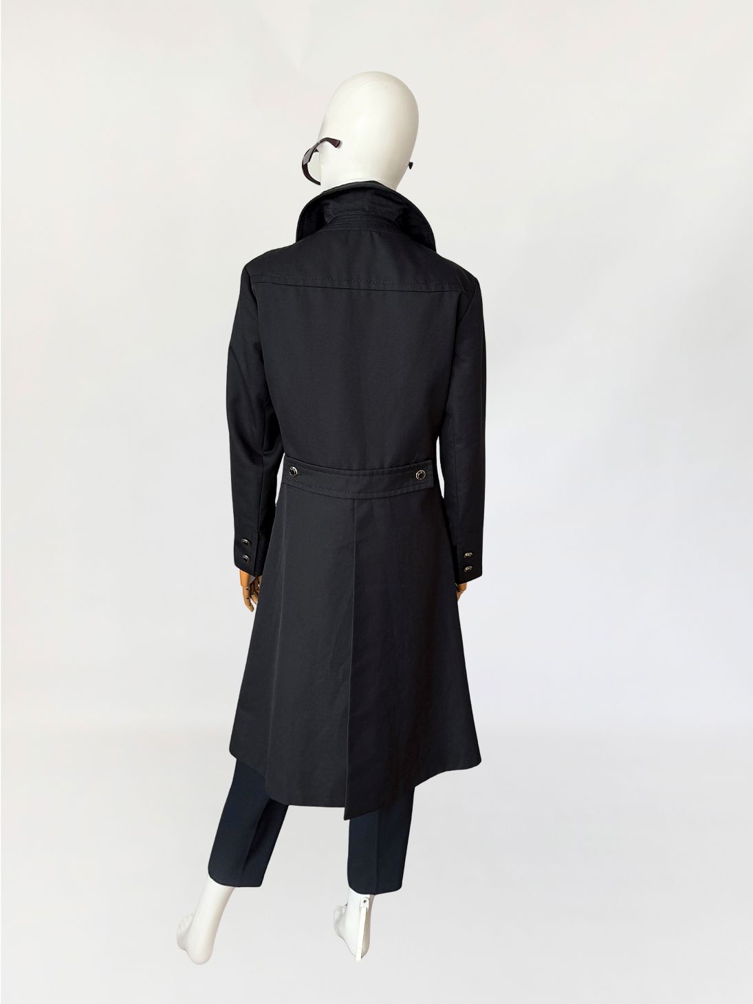Francuski płaszcz vintage Royal Blizzard. Klasyczny model o długości do kolan, zapinany na rząd metalowych guzików. Kołnierz z wyraźnie zarysowanymi klapami, konstrukcja oparta na pionowych cięciach modelujących sylwetkę. W talii wszyty pasek regulacyjny na plecach, zapinany na guziki. Rękawy długie, proste, z guzikami przy mankietach. Na wysokości bioder kieszenie cięte z patkami, wykończone metalowymi guzikami.
