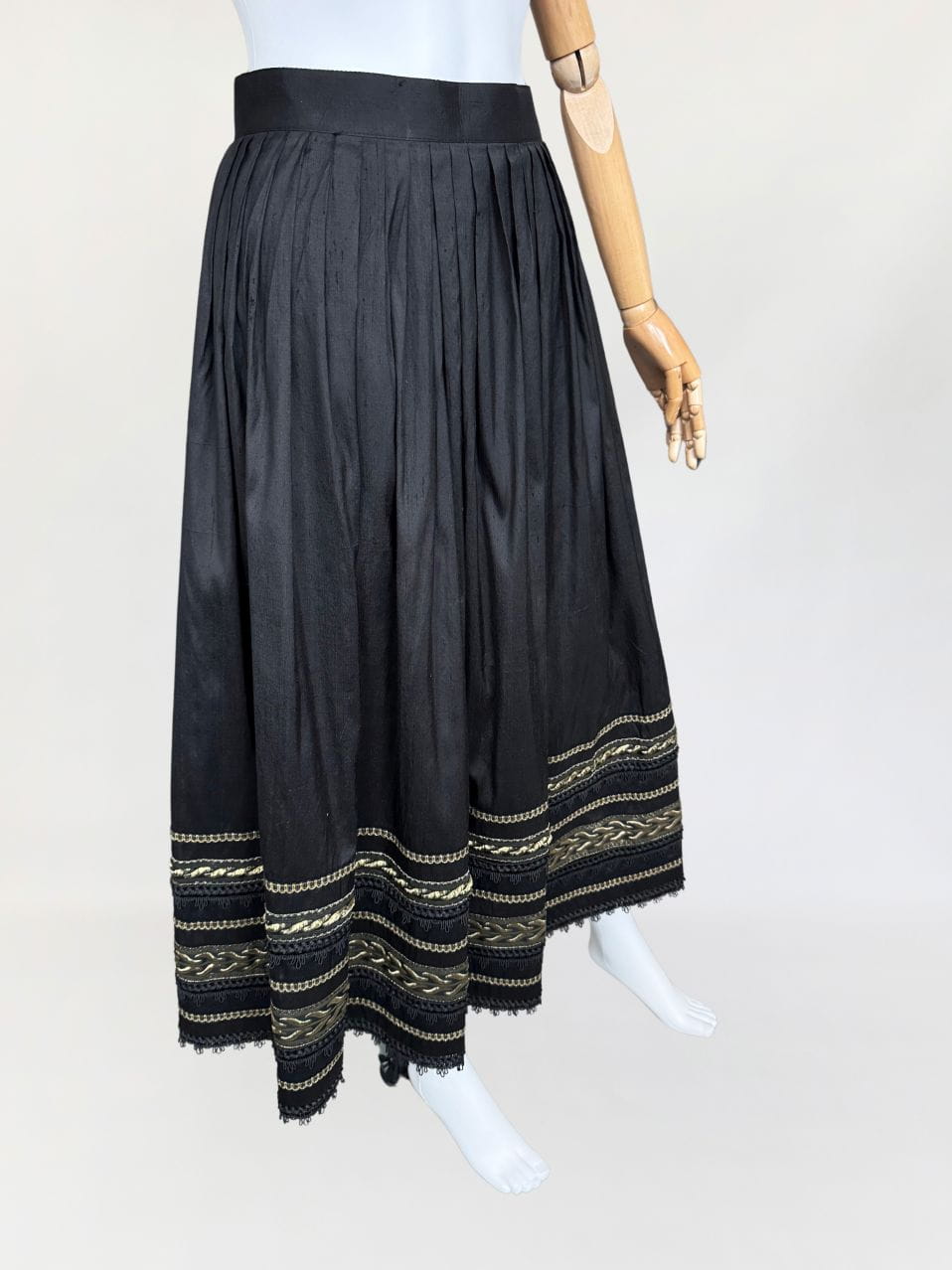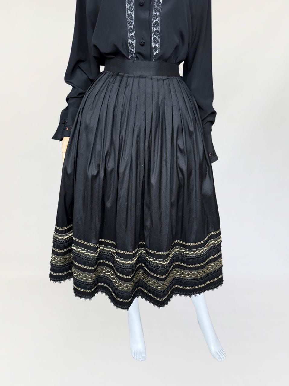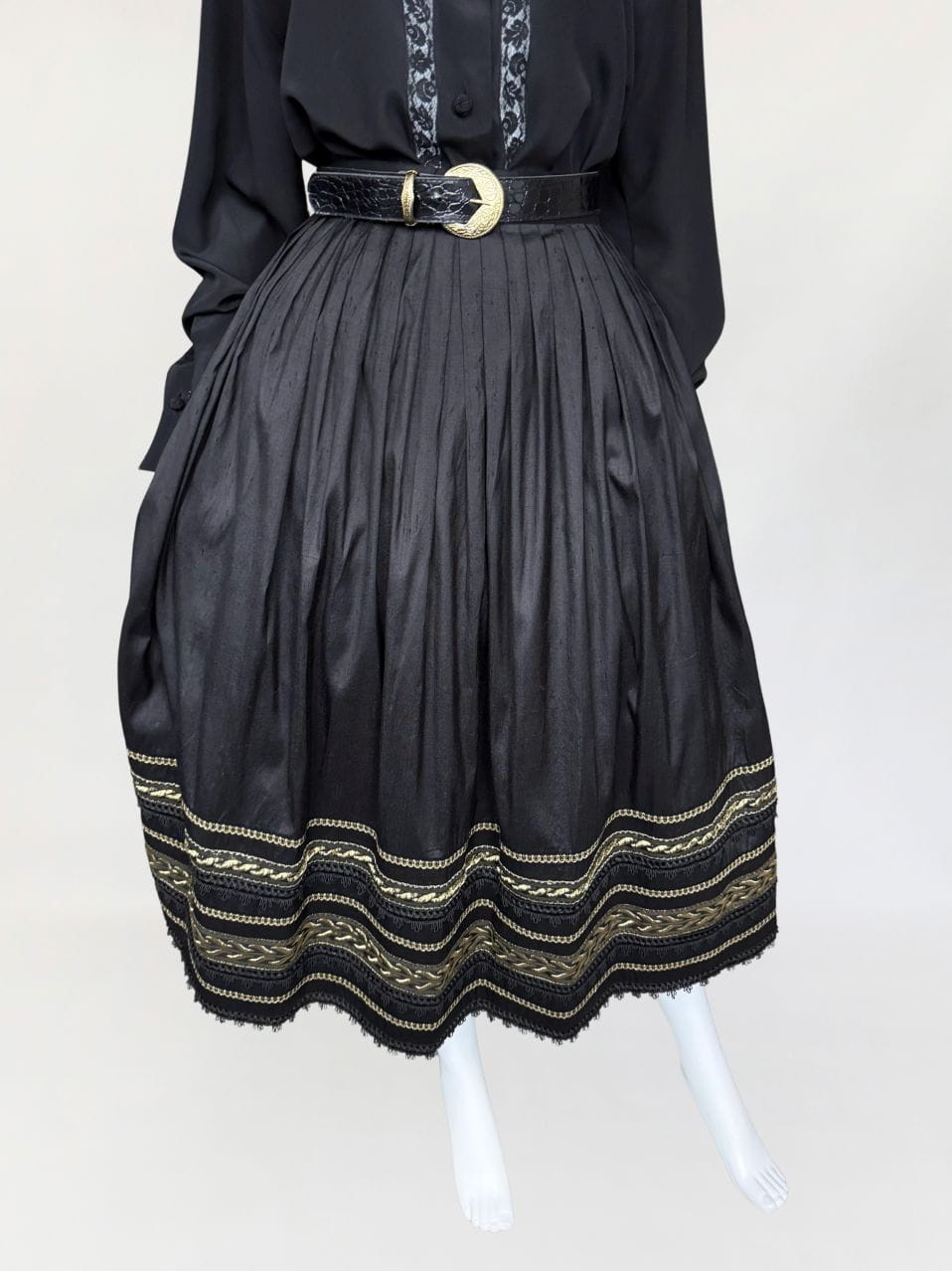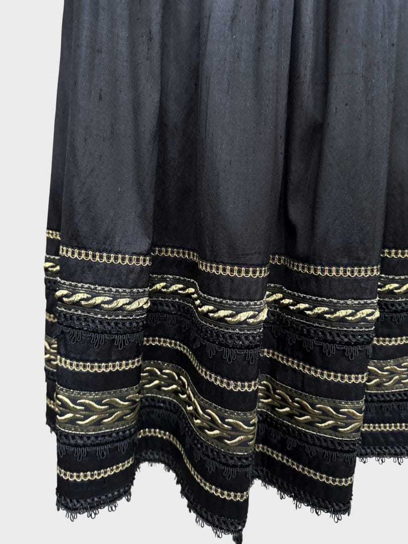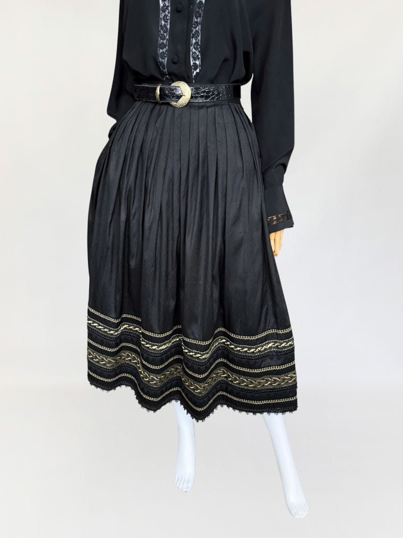 Austriacka spódnica vintage z lat 80-tych. Wykonana z jedwabnego szantungu w kolorze czarnym. Dół zdobiony dekoracyjną złotą i koronkowa lamówką. Mocno rozkloszowany fason o długości midi. Od wewnątrz na podszewka.