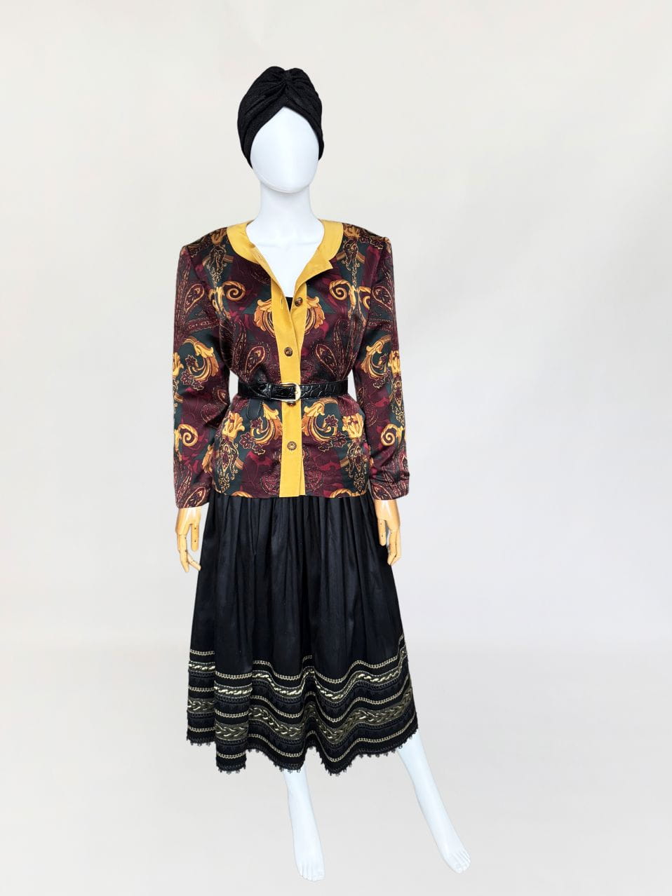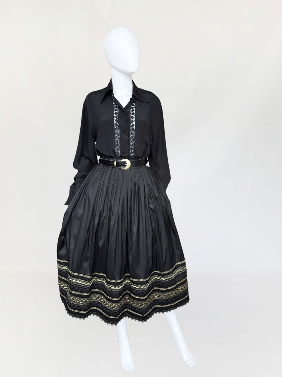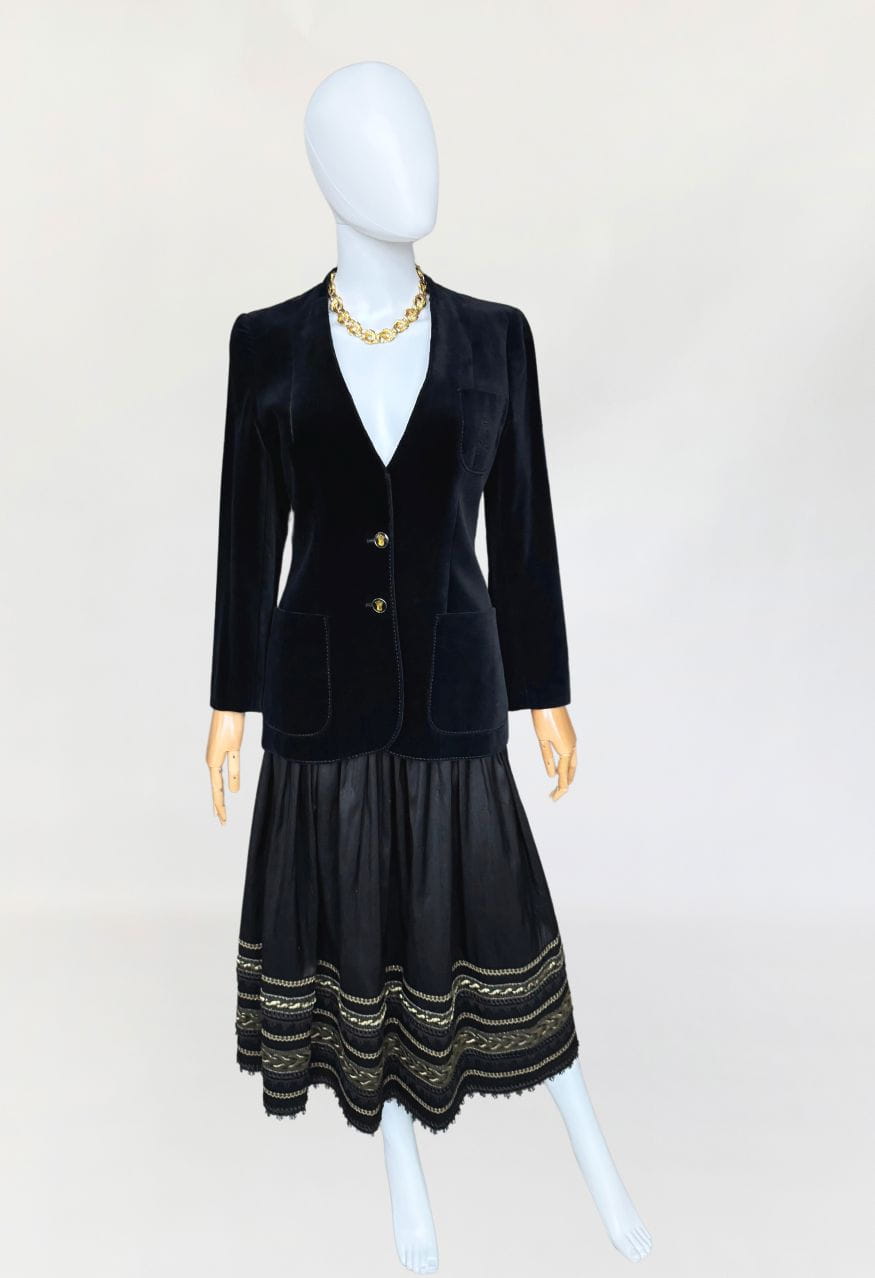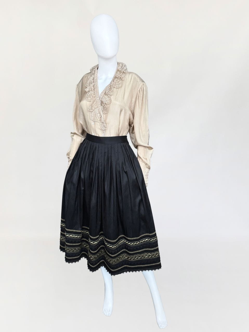 Austriacka spódnica vintage z lat 80-tych. Wykonana z jedwabnego szantungu w kolorze czarnym. Dół zdobiony dekoracyjną złotą i koronkowa lamówką. Mocno rozkloszowany fason o długości midi. Od wewnątrz na podszewka.