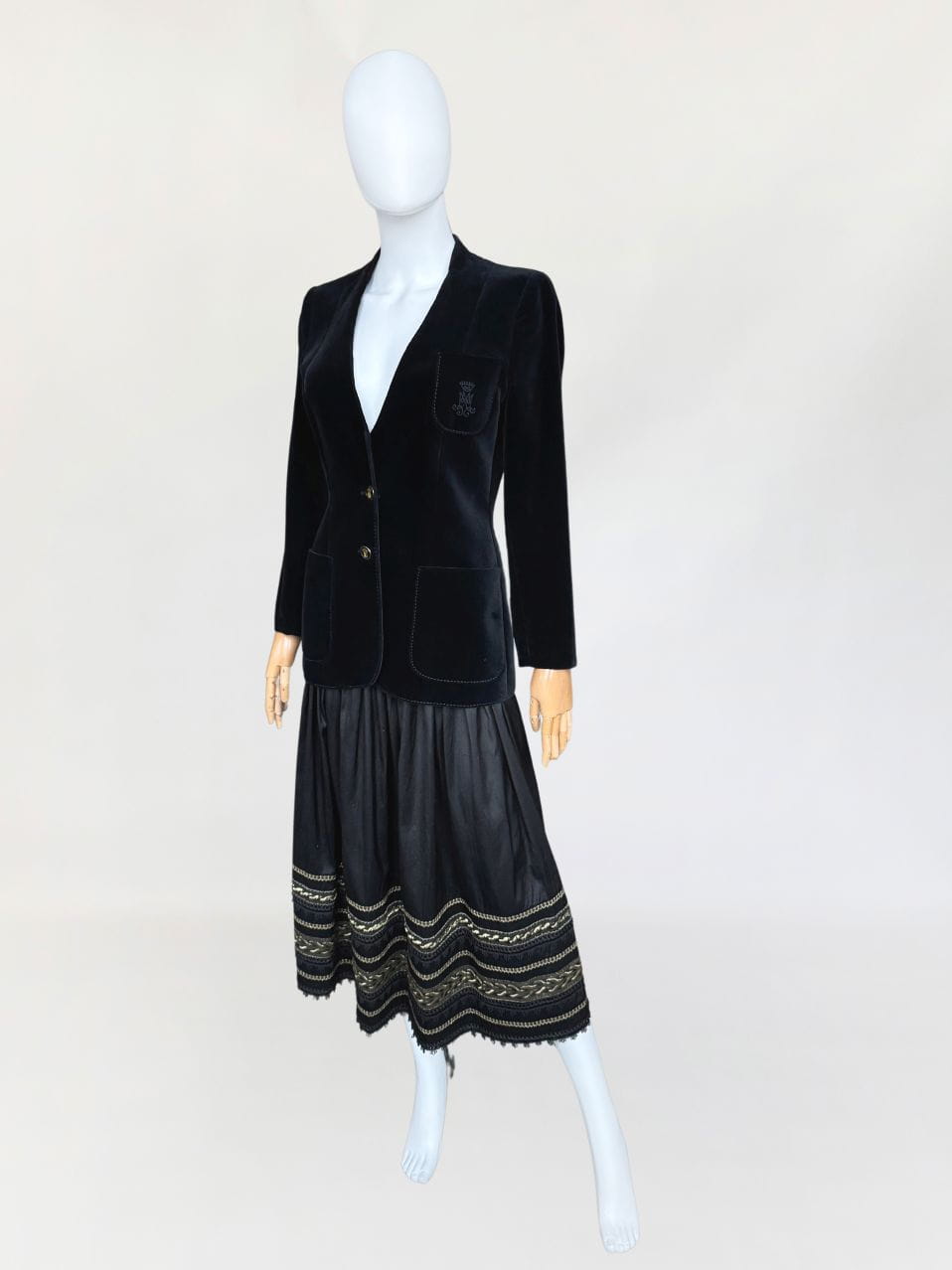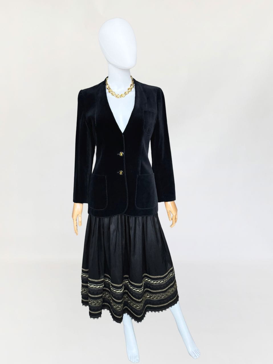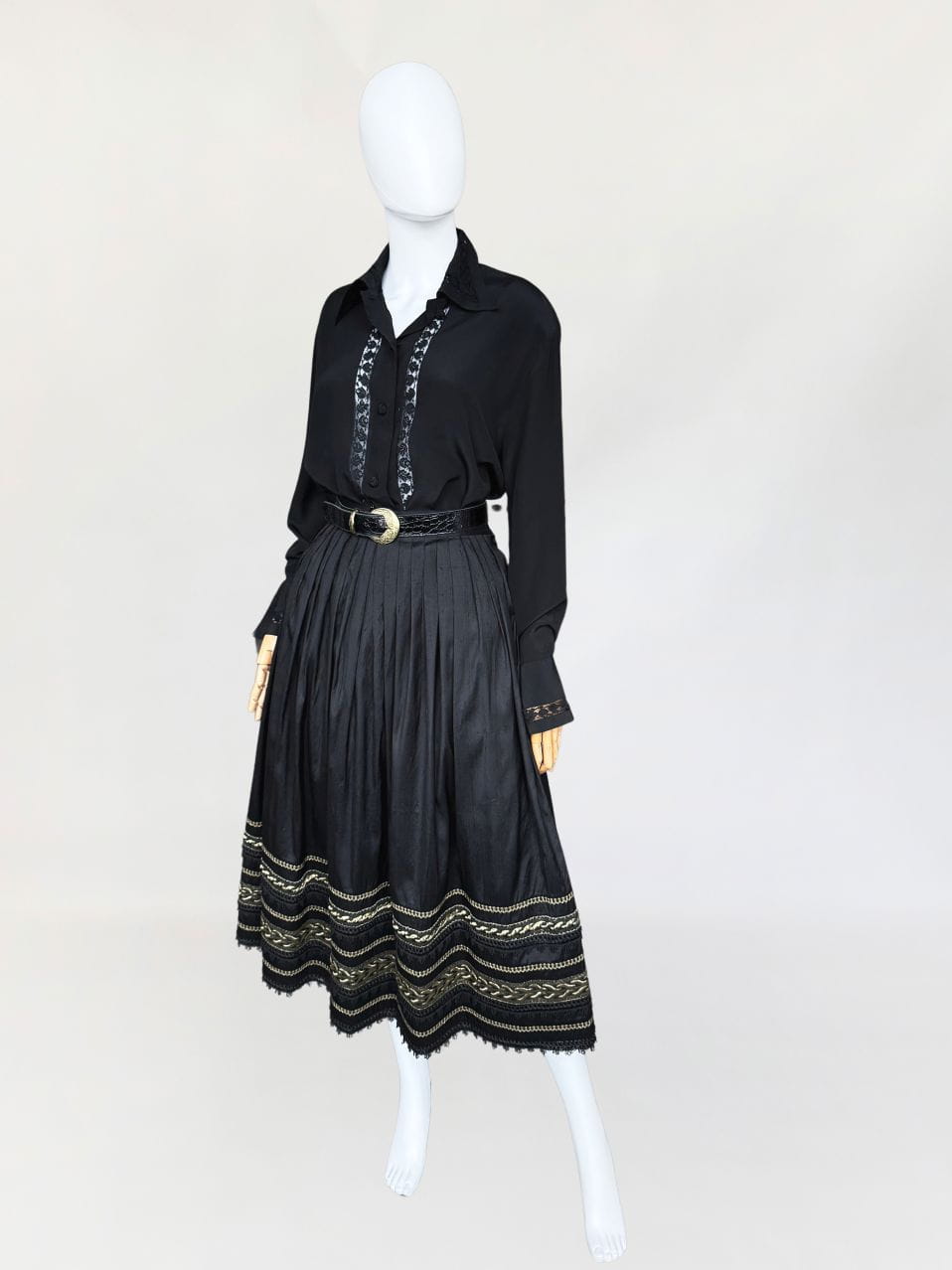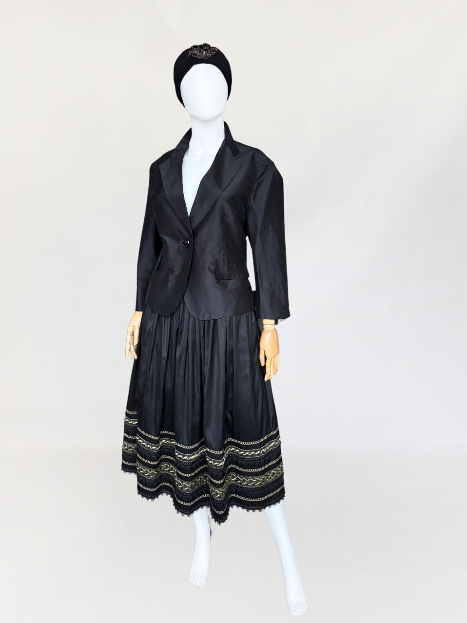 Austriacka spódnica vintage z lat 80-tych. Wykonana z jedwabnego szantungu w kolorze czarnym. Dół zdobiony dekoracyjną złotą i koronkowa lamówką. Mocno rozkloszowany fason o długości midi. Od wewnątrz na podszewka.