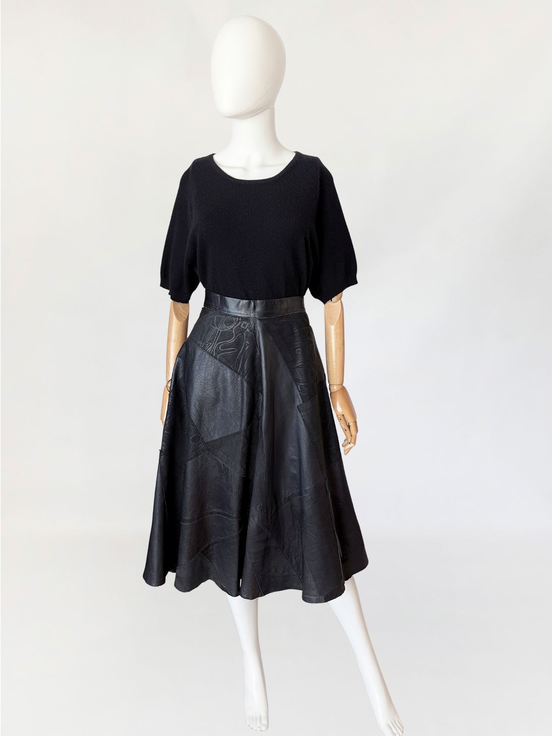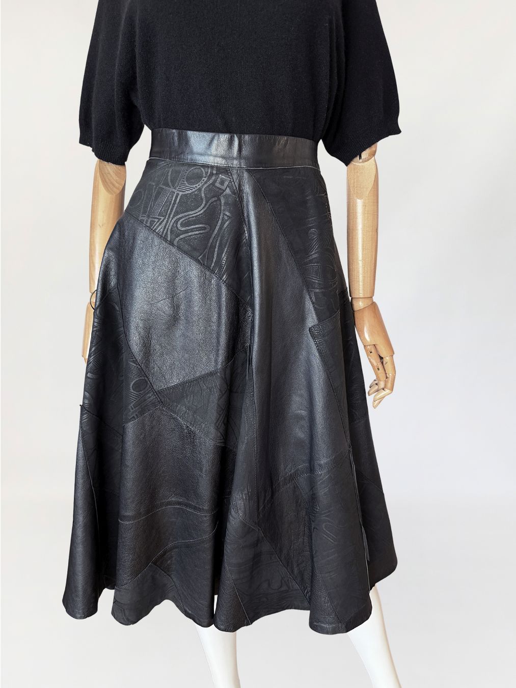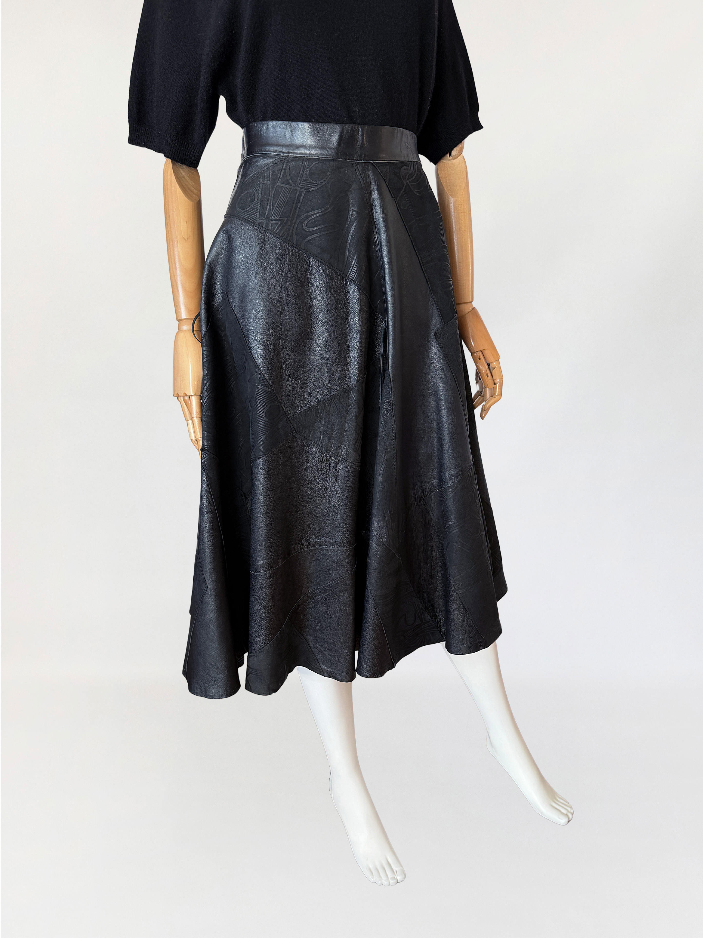 Efektowna włoska spódnica vintage wykonana z miękkiej naturalnej skóry w czarnym odcieniu, o mocno rozkloszowanej formie i wysokim stanie. Konstrukcja oparta na licznych, nieregularnych panelach łączonych w układzie patchworkowym, z widocznymi przeszyciami modelującymi bryłę. Pas gładki, wyraźnie zaznaczony. Linia bioder przechodzi w rozszerzany dół budowany z klinów, nadających objętość i swobodę ruchu. Poszczególne elementy wykonane z różnych fragmentów skóry, częściowo zdobionych tłoczeniem o motywach abstrakcyjnych i ornamentalnych. Wstawki zamszowe zintegrowane z konstrukcją paneli, o subtelnie zróżnicowanej fakturze względem skóry licowej. Długość midi.