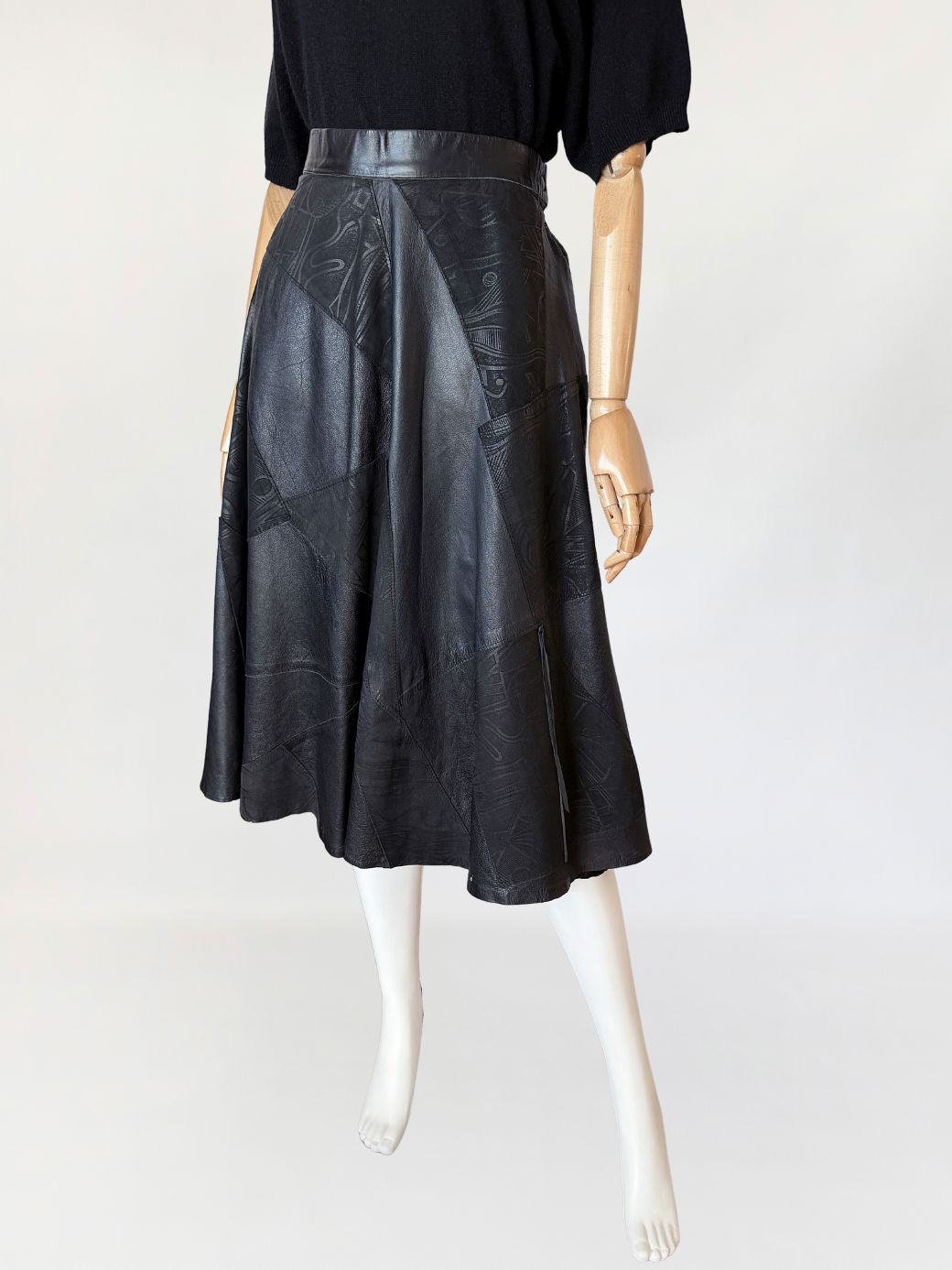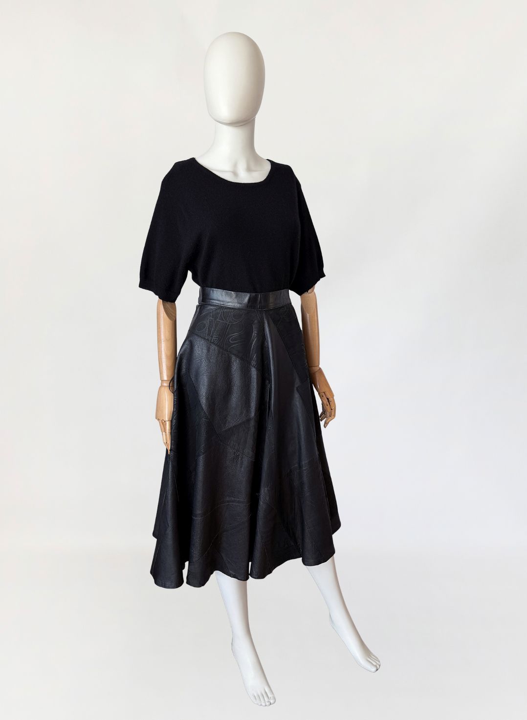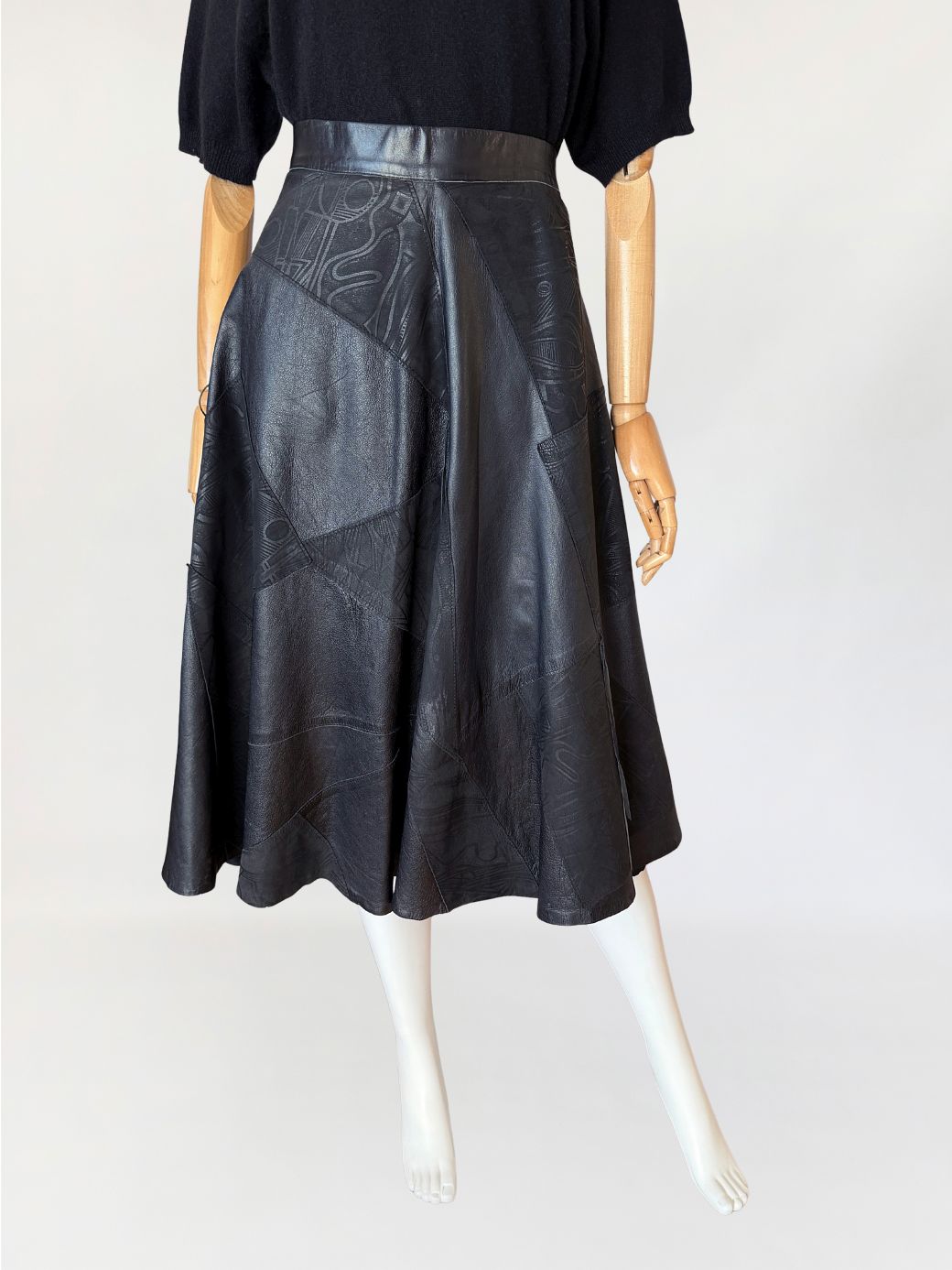 Efektowna włoska spódnica vintage wykonana z miękkiej naturalnej skóry w czarnym odcieniu, o mocno rozkloszowanej formie i wysokim stanie. Konstrukcja oparta na licznych, nieregularnych panelach łączonych w układzie patchworkowym, z widocznymi przeszyciami modelującymi bryłę. Pas gładki, wyraźnie zaznaczony. Linia bioder przechodzi w rozszerzany dół budowany z klinów, nadających objętość i swobodę ruchu. Poszczególne elementy wykonane z różnych fragmentów skóry, częściowo zdobionych tłoczeniem o motywach abstrakcyjnych i ornamentalnych. Wstawki zamszowe zintegrowane z konstrukcją paneli, o subtelnie zróżnicowanej fakturze względem skóry licowej. Długość midi.