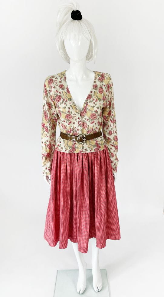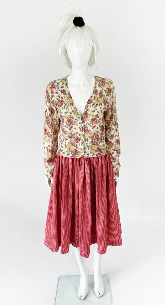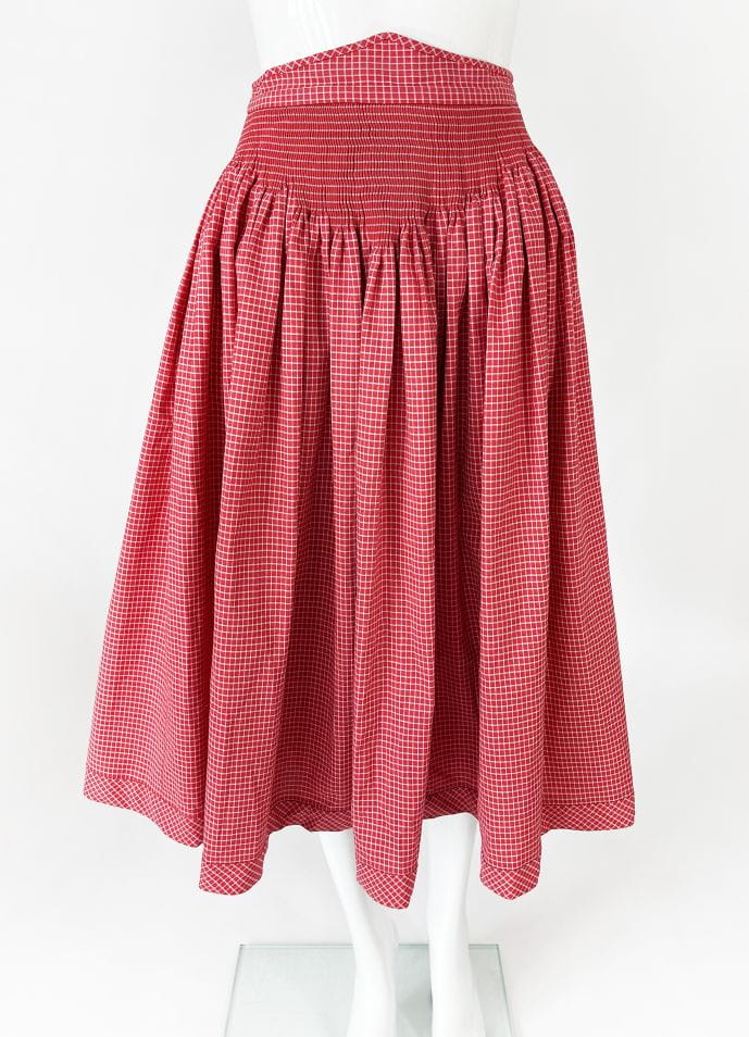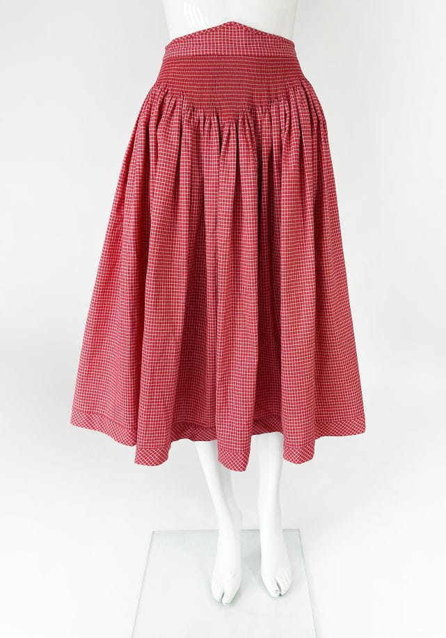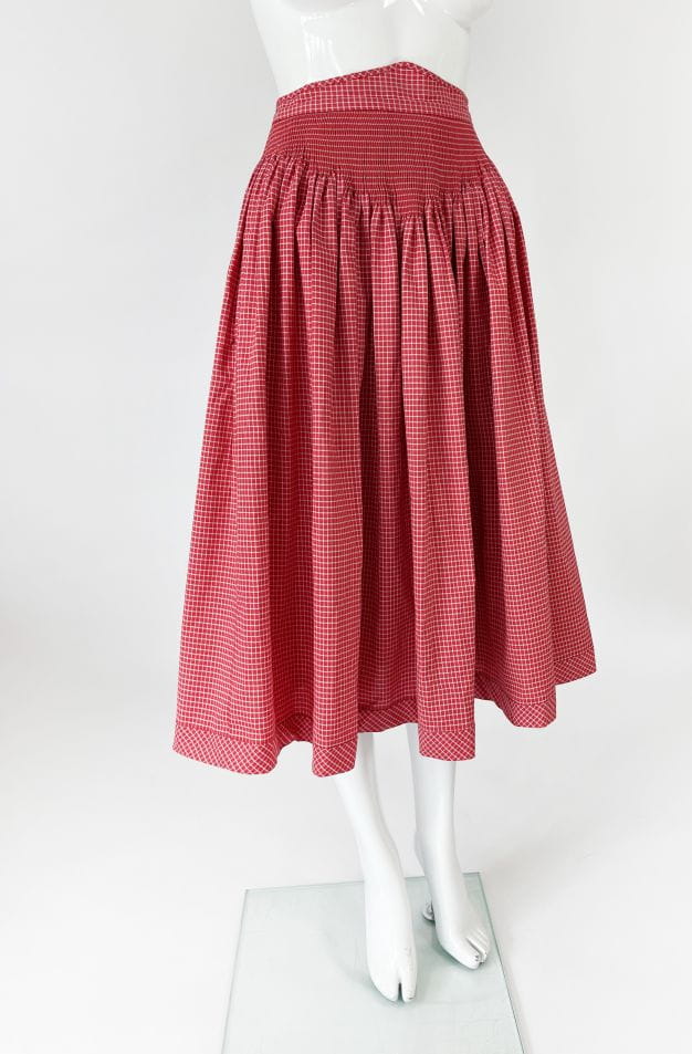 Spódnica z końca lat 70-tych w stylu lat 50-tych. Wykonana z bawełnianej sztywniejszej tkaniny o deseniu w kratę. Wysoki stan, szeroki pas z marszczeniami. Krój mocno rozkoszowany. Po bokach wsuwane kieszenie. Ma podszewkę. Zapinana na zamek, haftki i guziki.