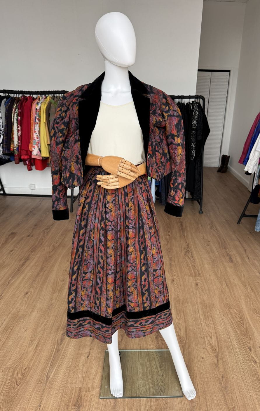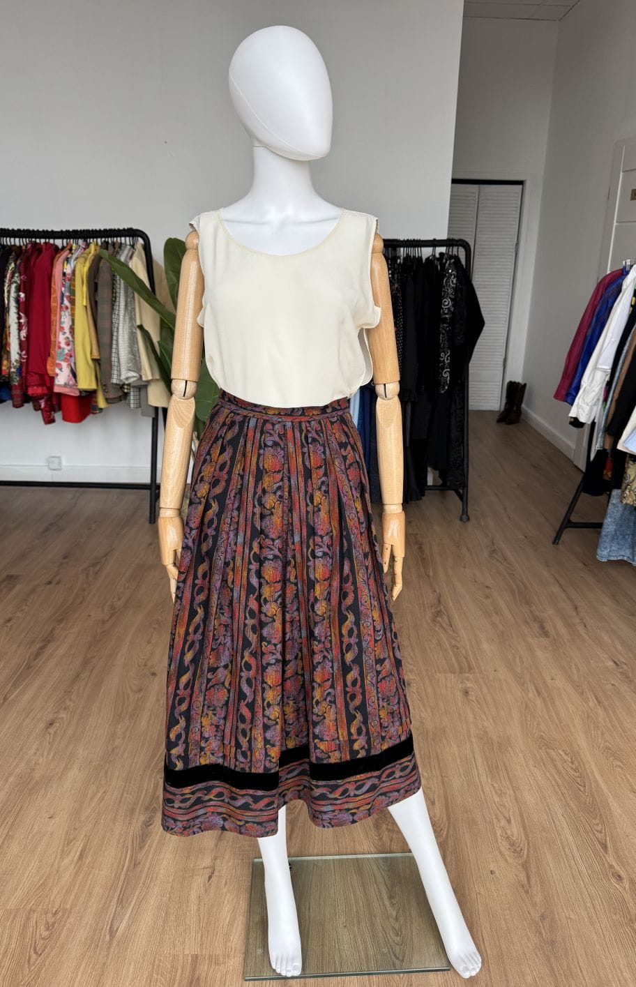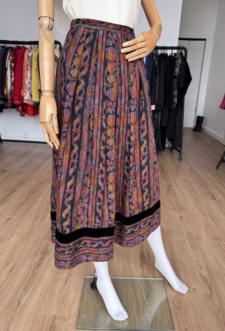 Spódnica vintage wykonana z lekkiej bawełnianej tkaniny w barwne wzory. Rozkloszowany fason. Wykończona czarną aksamitną lamówką.